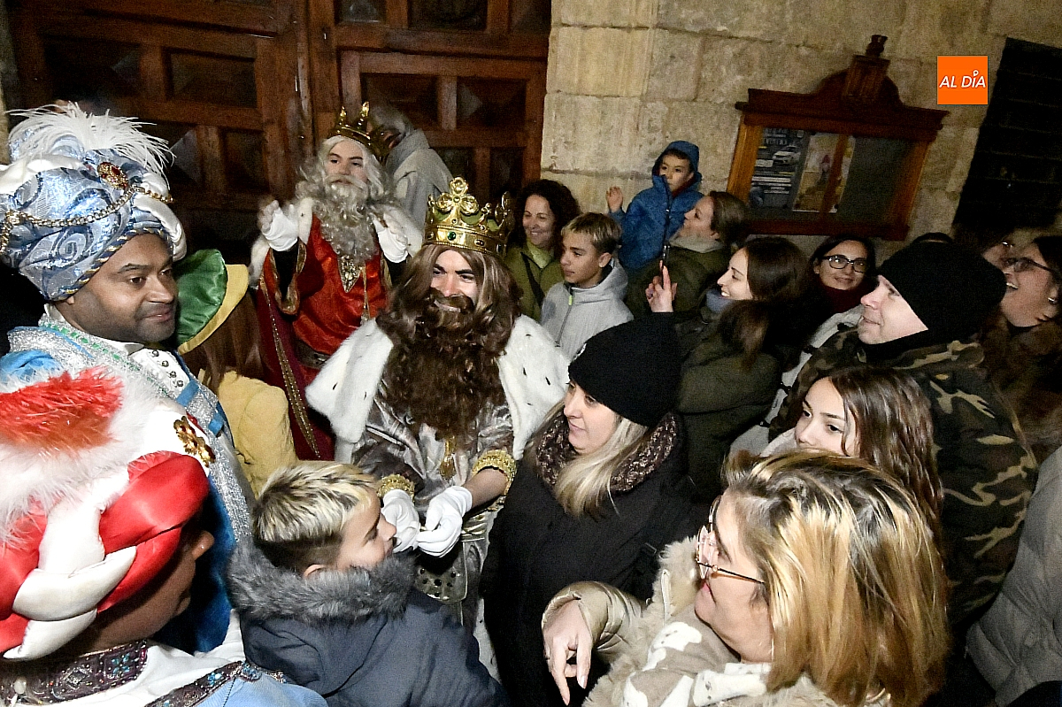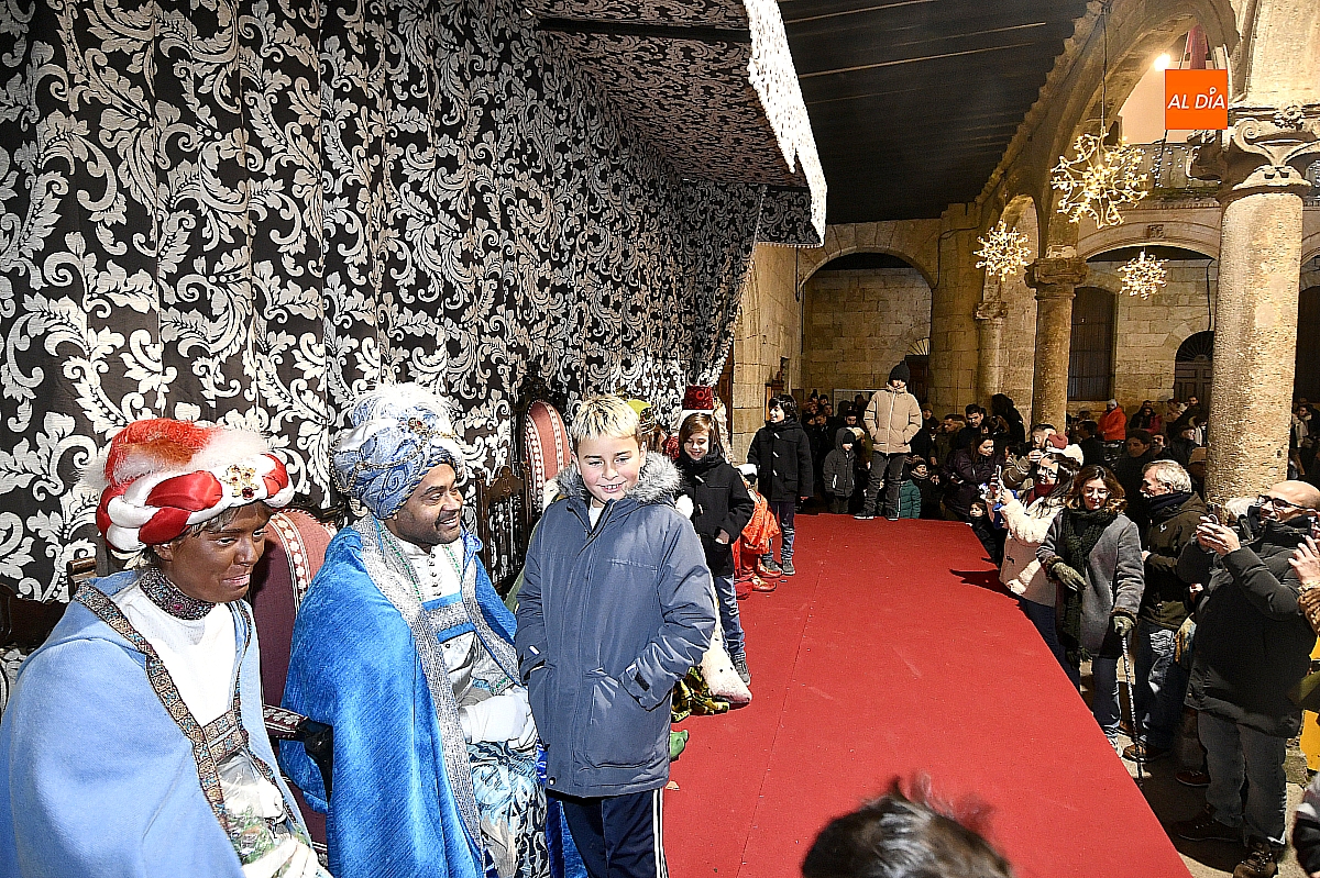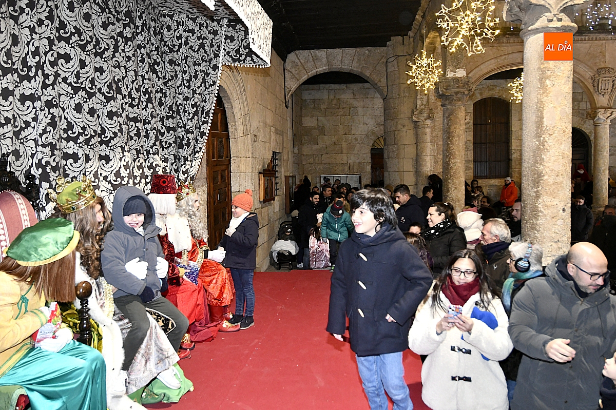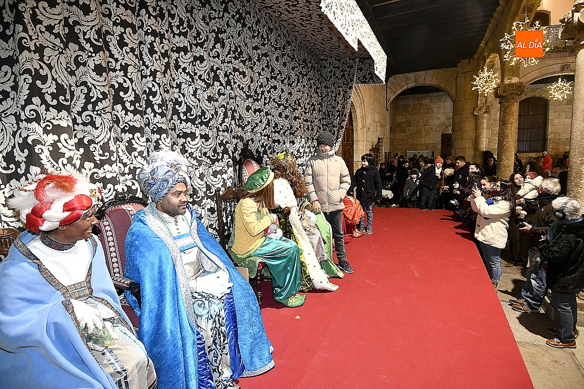 Finalizado el protocolo, llegó el momento más cercano y emotivo de la tarde. Bajo los soportales del Ayuntamiento, los Reyes Magos se sentaron para recibir personalmente a los niños y niñas, formándose una larga cola de familias que aguardaban su turno para saludar a los monarcas, intercambiar unas palabras y entregar sus últimas deseos.