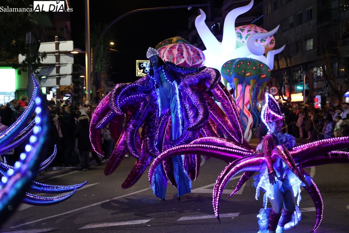 Uno de los momentos más llamativos ha llegado de la mano de la compañía francesa Remue-Ménage y su montaje 'Abysses', que ha sorprendido al público con medusas y un hipocampo gigante. El desfile ha continuado con la participación de la Hermandad de Jesús Despojado y su 'Cartero Real', así como la carroza 'Puente de los ciervos' de la Asociación Española contra el Cáncer.