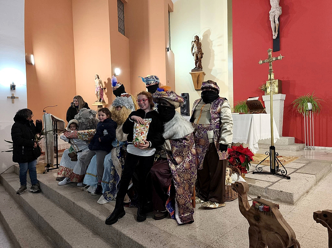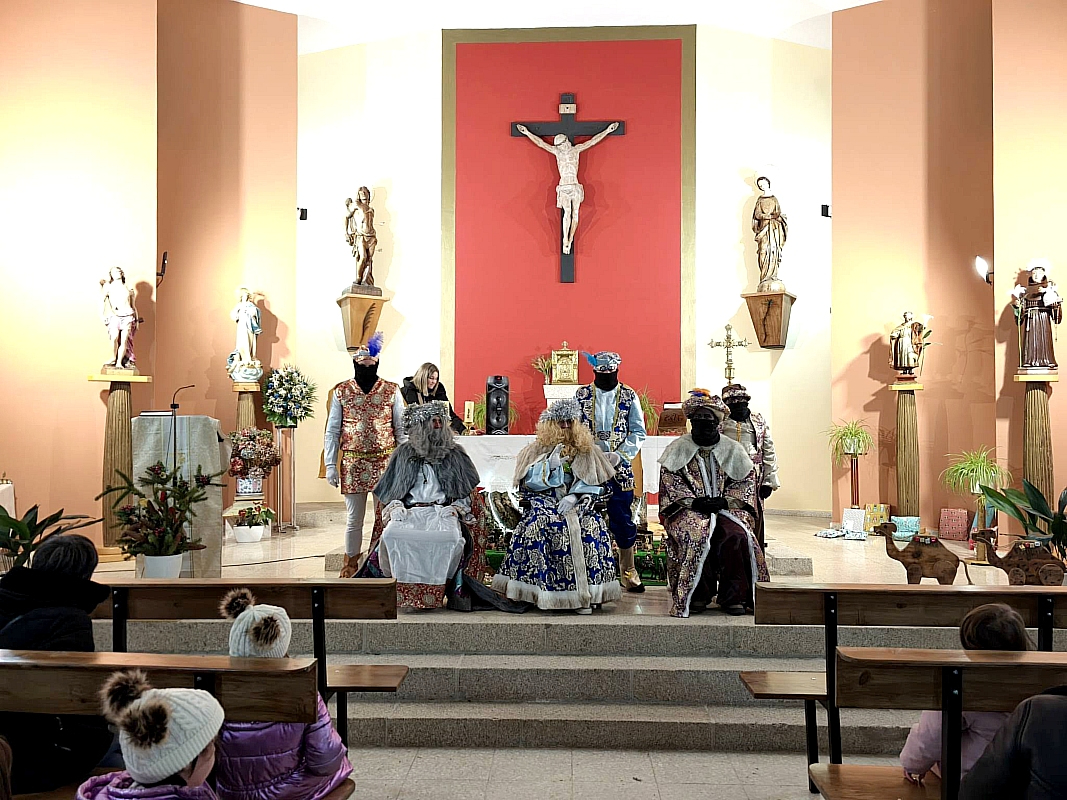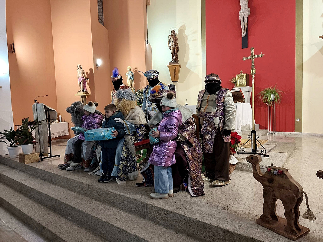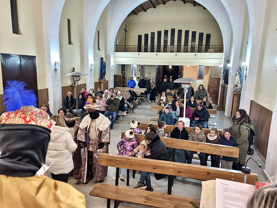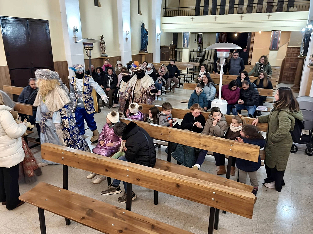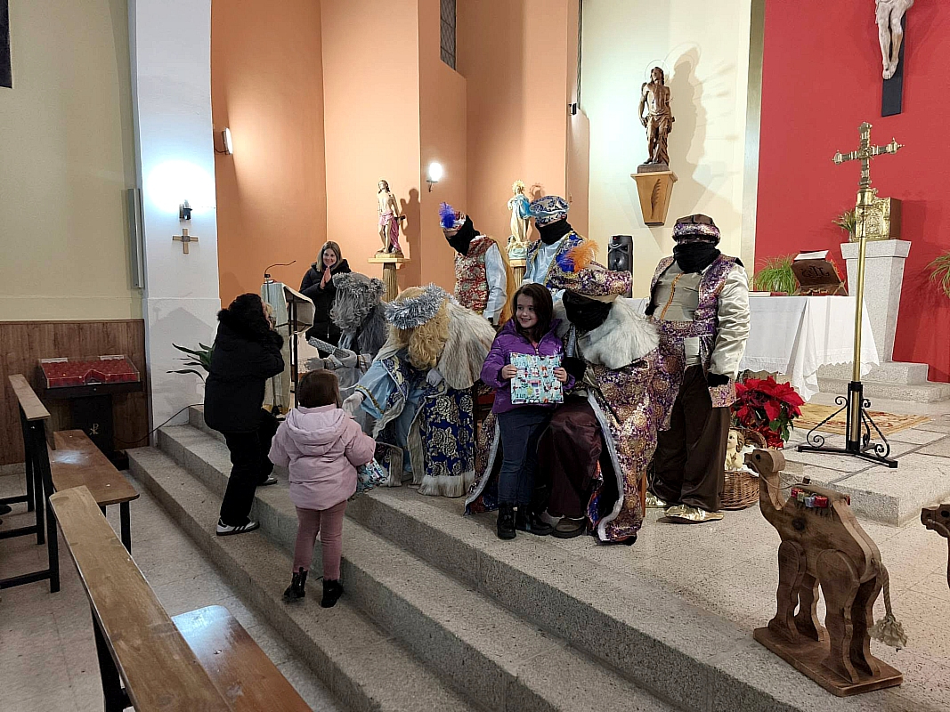 Posteriormente, la celebración se ha trasladado al interior del templo parroquial. La Iglesia de San Sebastián ha sido el escenario elegido para el momento más esperado por los más pequeños de la casa. En un ambiente recogido y festivo, Sus Majestades han procedido a la entrega de regalos, atendiendo personalmente a los niños que se han acercado a recibir sus presentes.