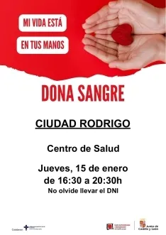 El Centro de Hemoterapia y Hemodonación de Castilla y León y la Hermandad de Donantes de Sangre de Salamanca organizan una jornada de donación en Ciudad Rodrigo. La cita tendrá lugar el próximo jueves, 15 de enero de 2026, en el Centro de Salud de la localidad. El horario para donar será de 16:30 a 20:30 horas y es imprescindible que los participantes acudan con su Documento Nacional de Identidad (DNI).