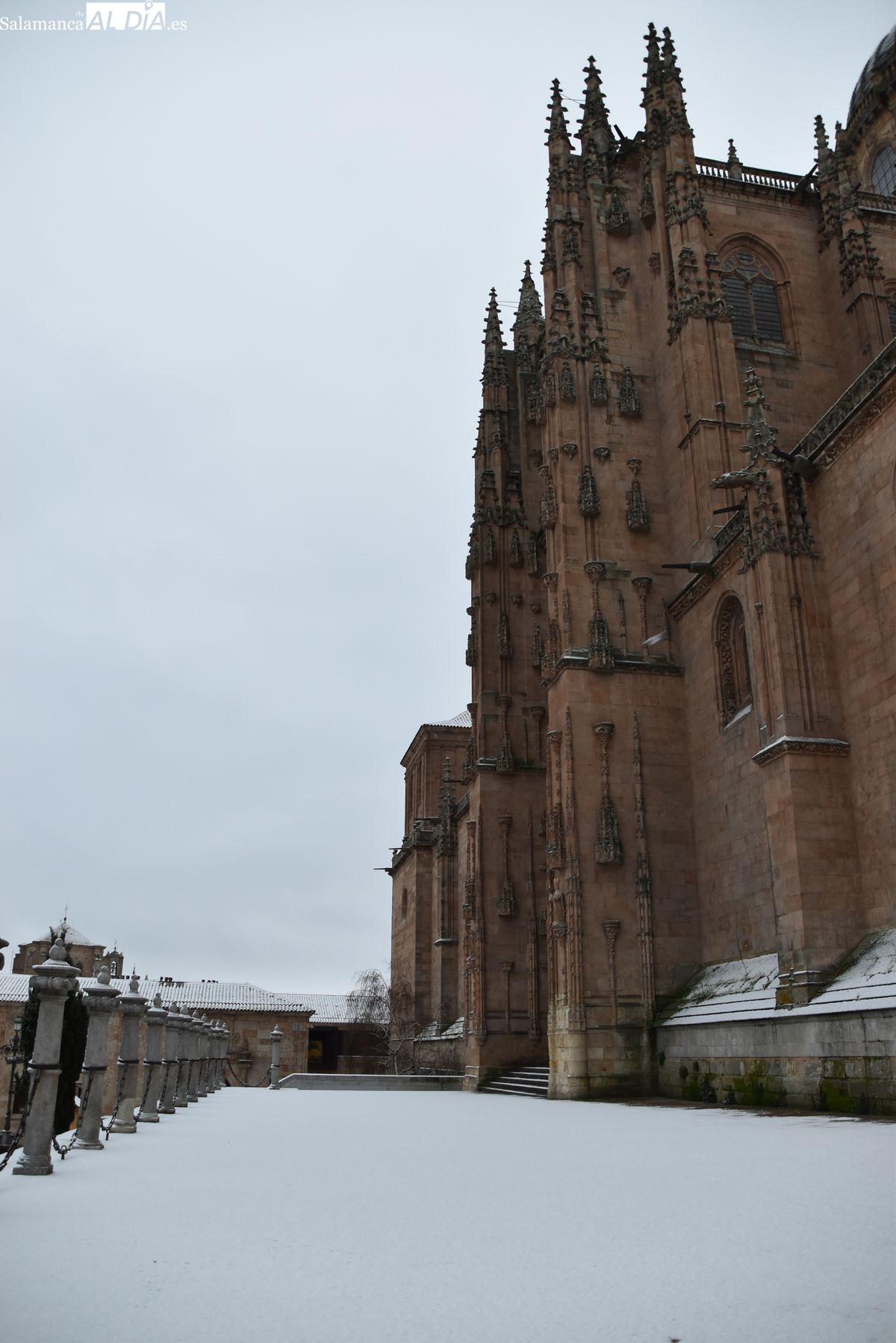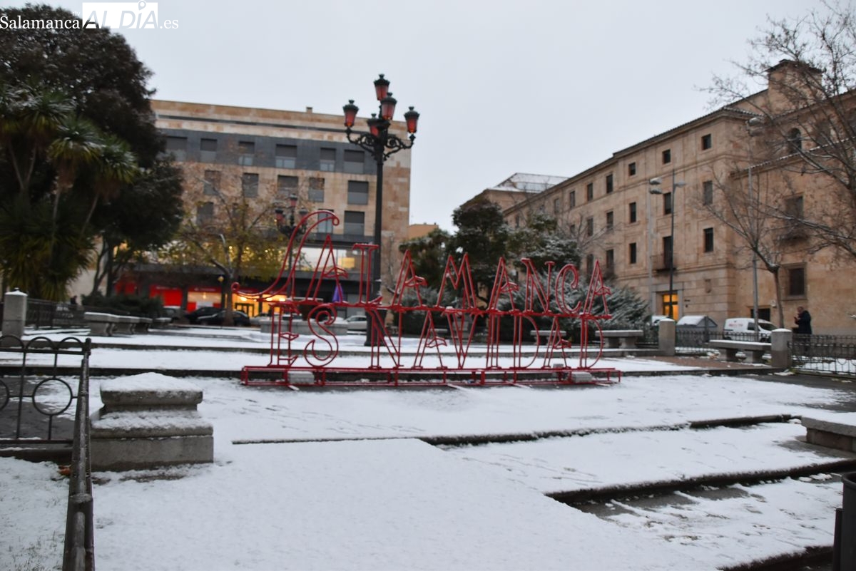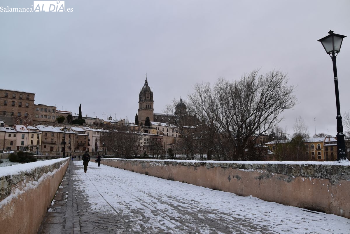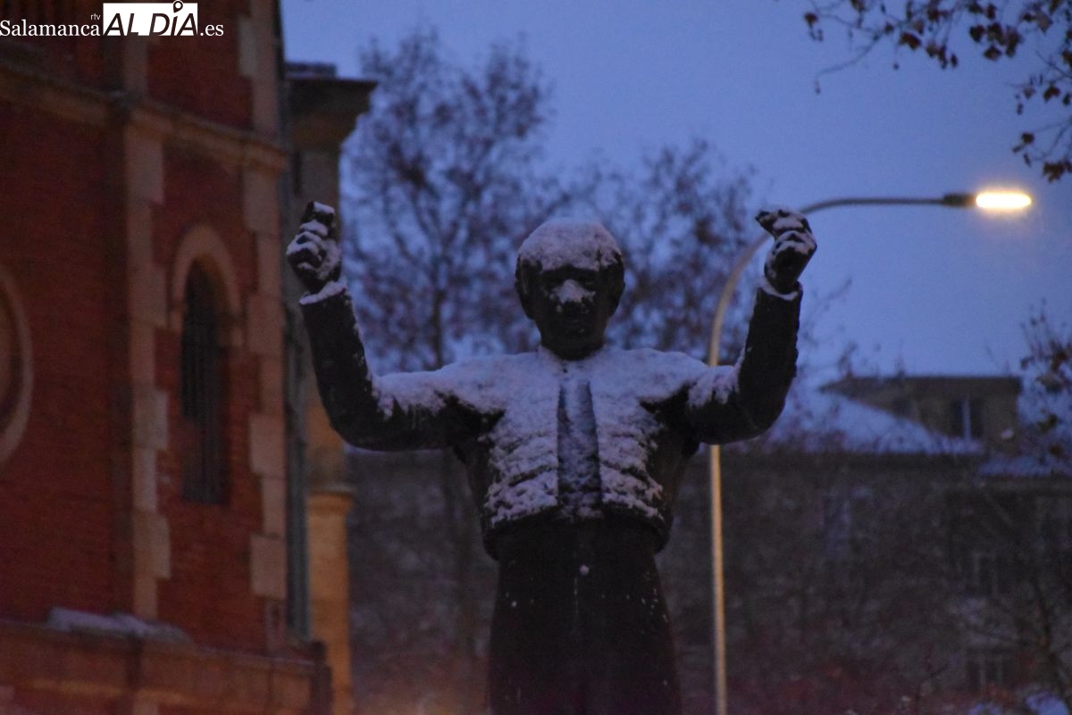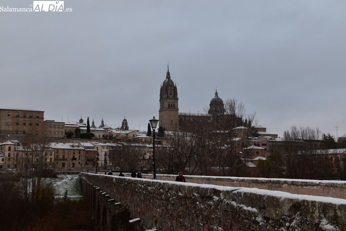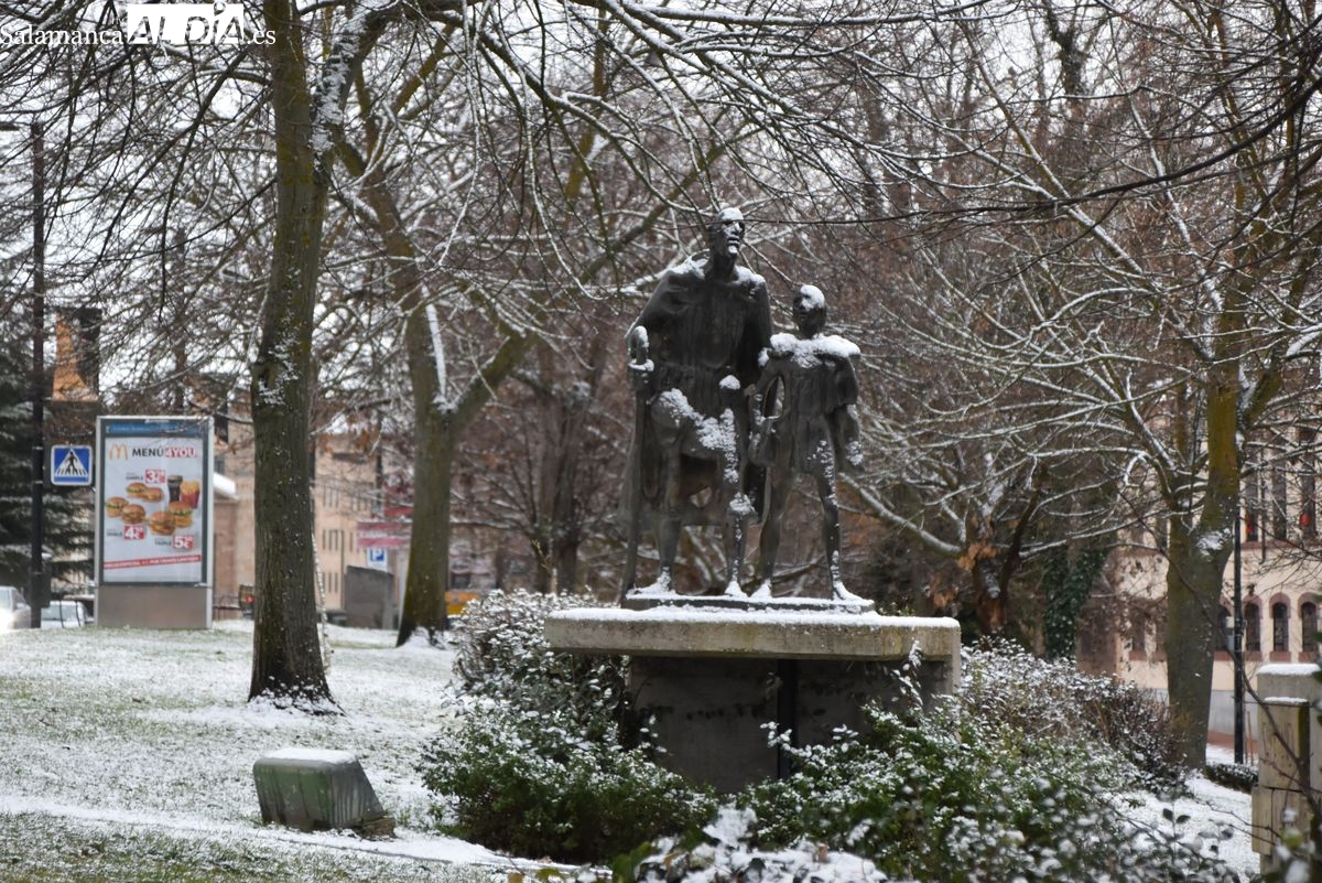 Los salmantinos se han encontrado esta mañana con bellas estampas en las calles y monumentos de la ciudad, que han quedado cubiertos por la nieve caída durante la madrugada de este miércoles, 7 de enero. El fenómeno meteorológico ha estado acompañado de un descenso notable de los termómetros, marcando una jornada rigurosamente invernal en la capital charra.