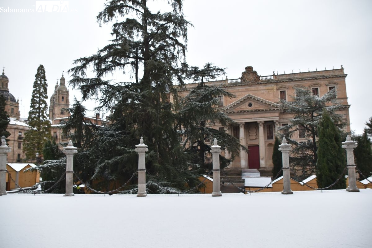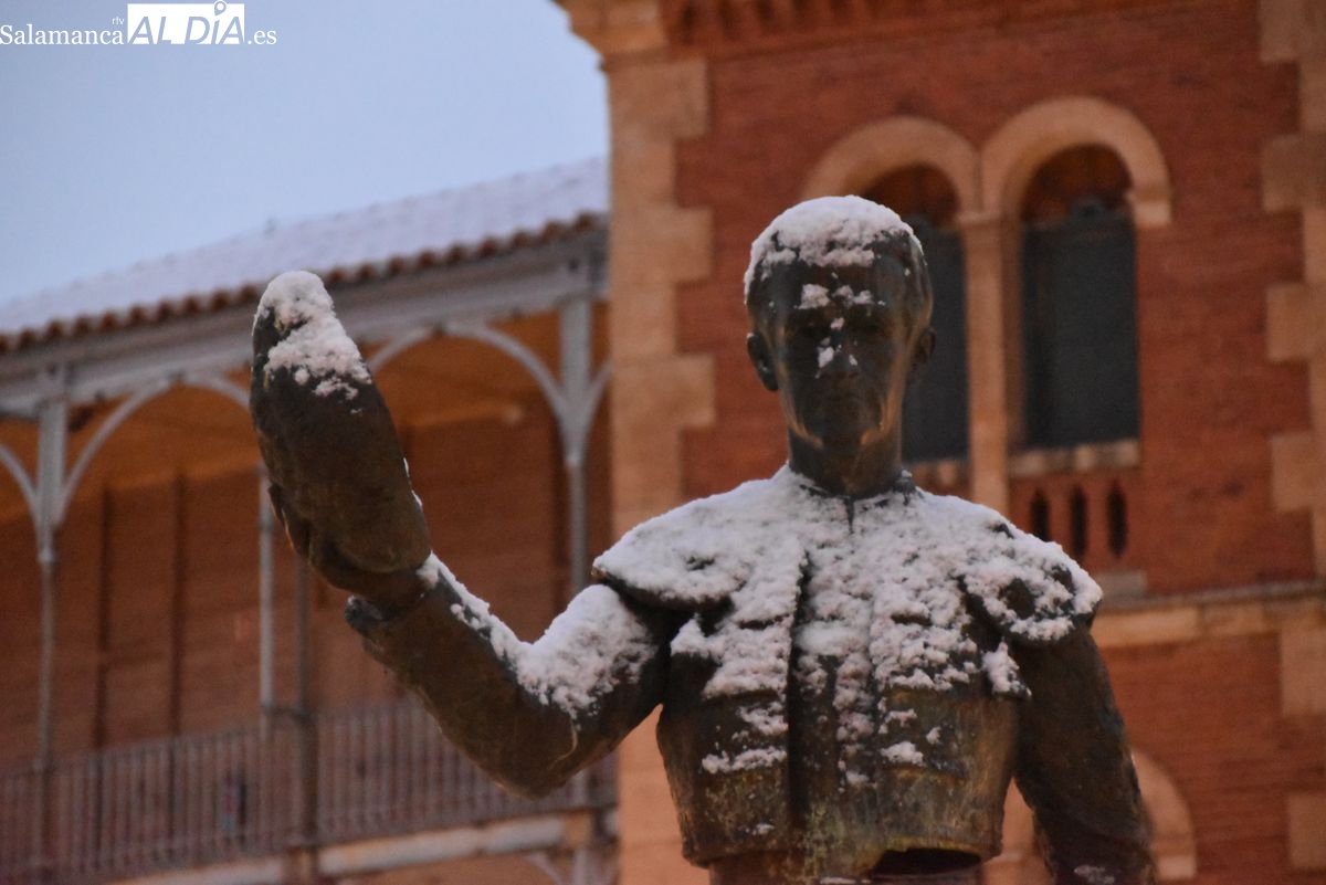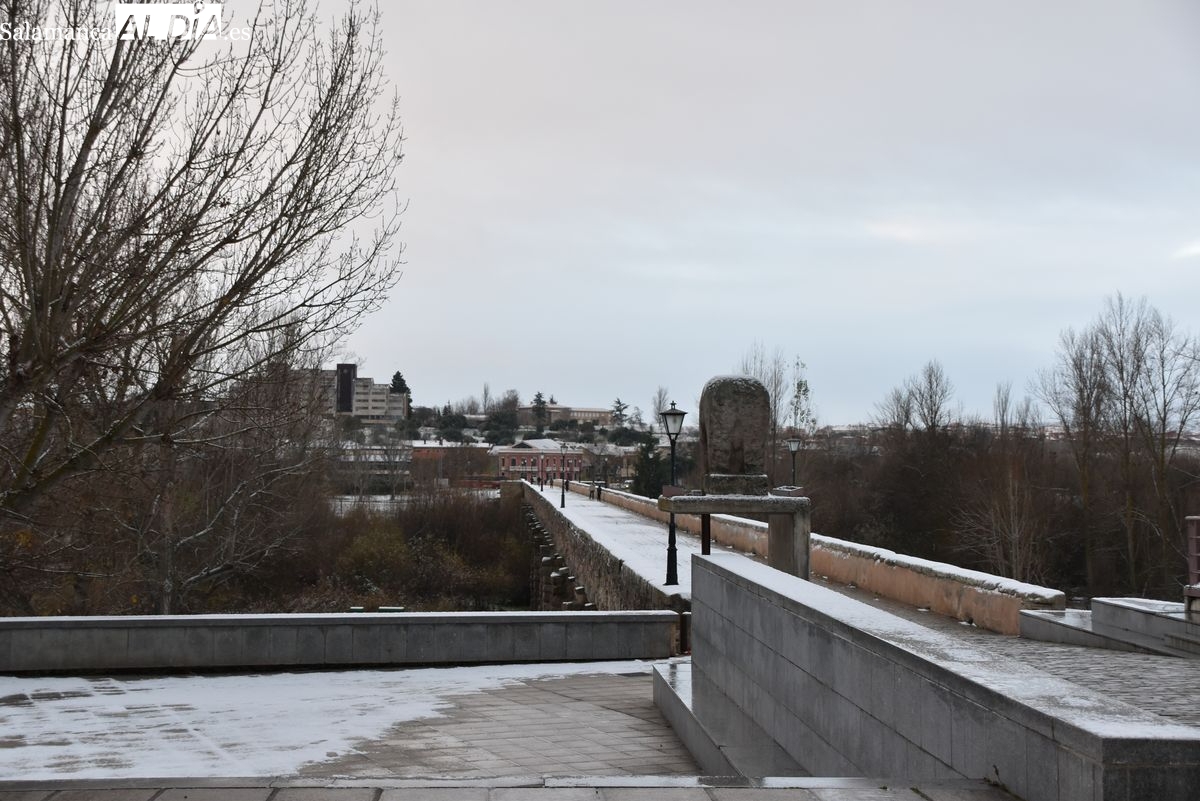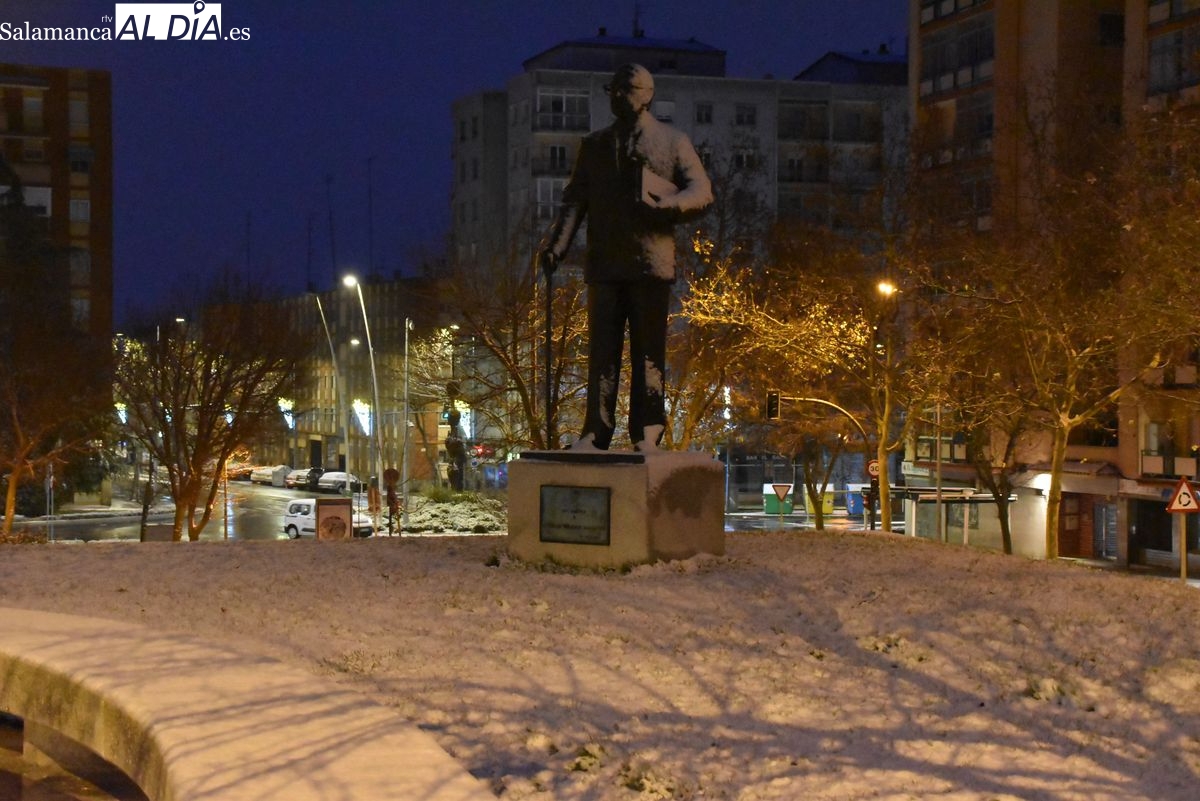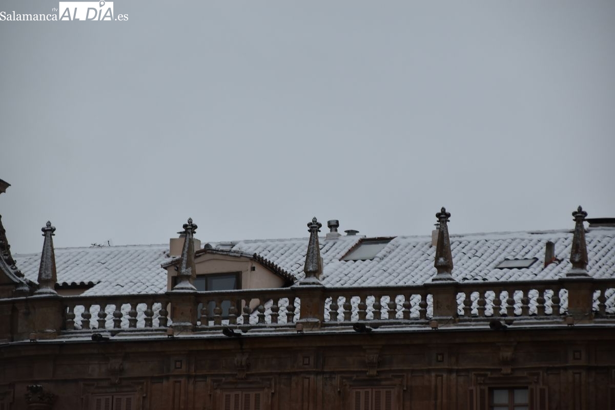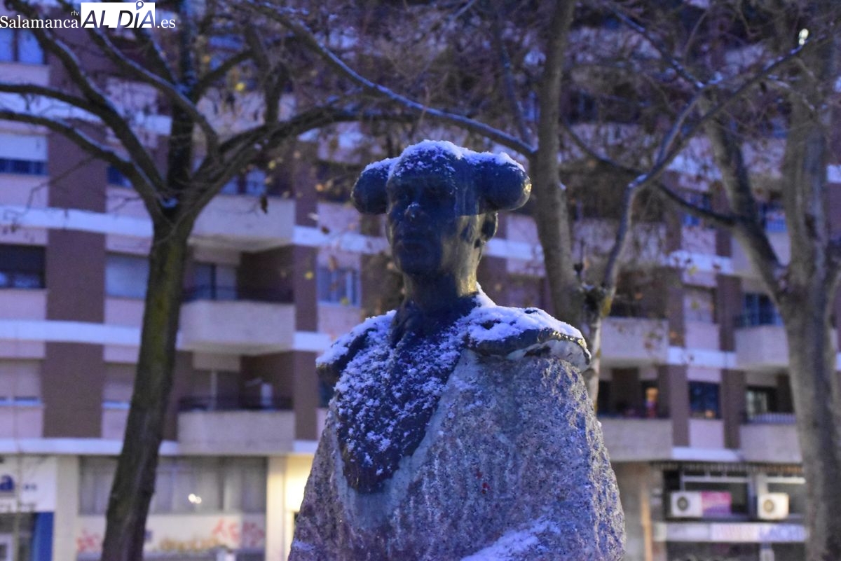 Los salmantinos se han encontrado esta mañana con bellas estampas en las calles y monumentos de la ciudad, que han quedado cubiertos por la nieve caída durante la madrugada de este miércoles, 7 de enero. El fenómeno meteorológico ha estado acompañado de un descenso notable de los termómetros, marcando una jornada rigurosamente invernal en la capital charra.