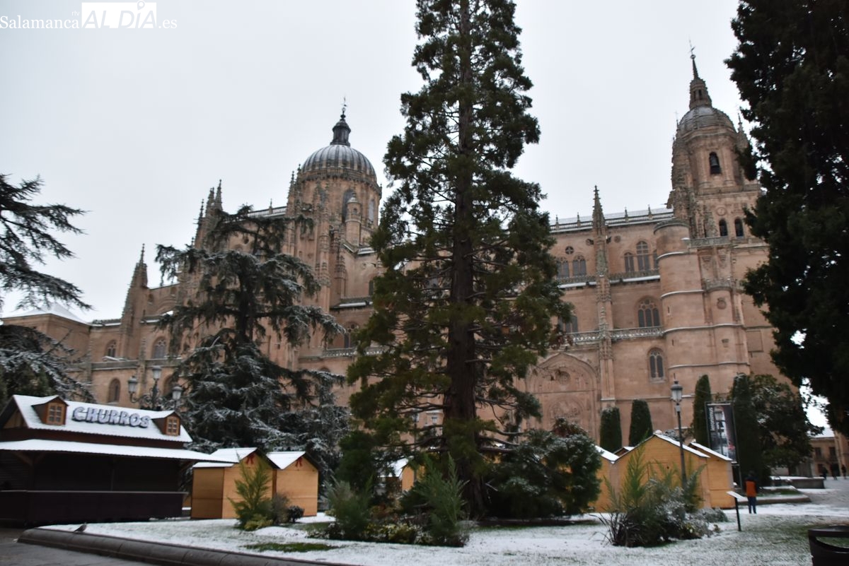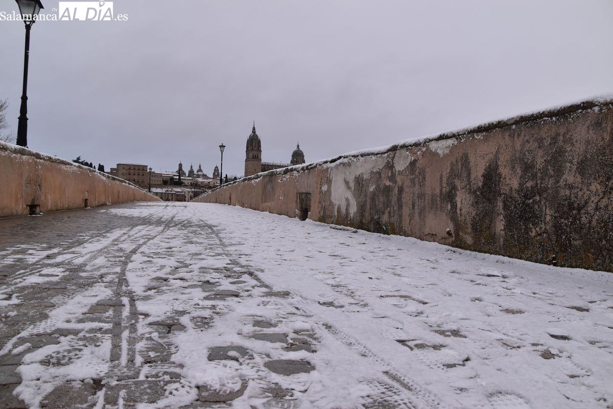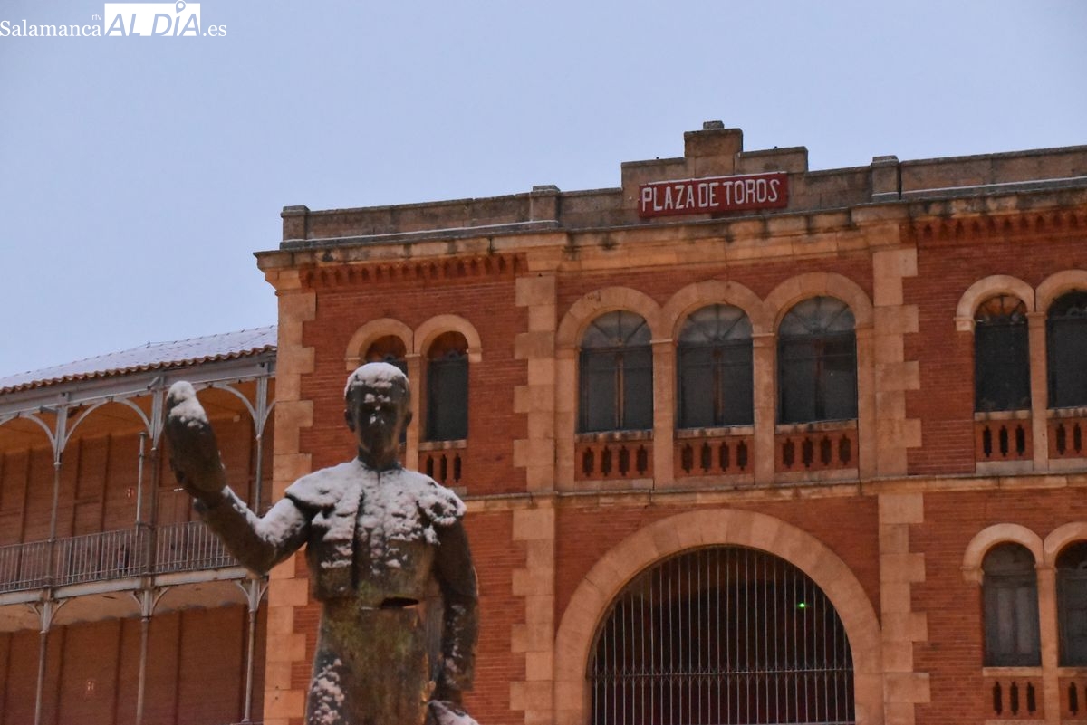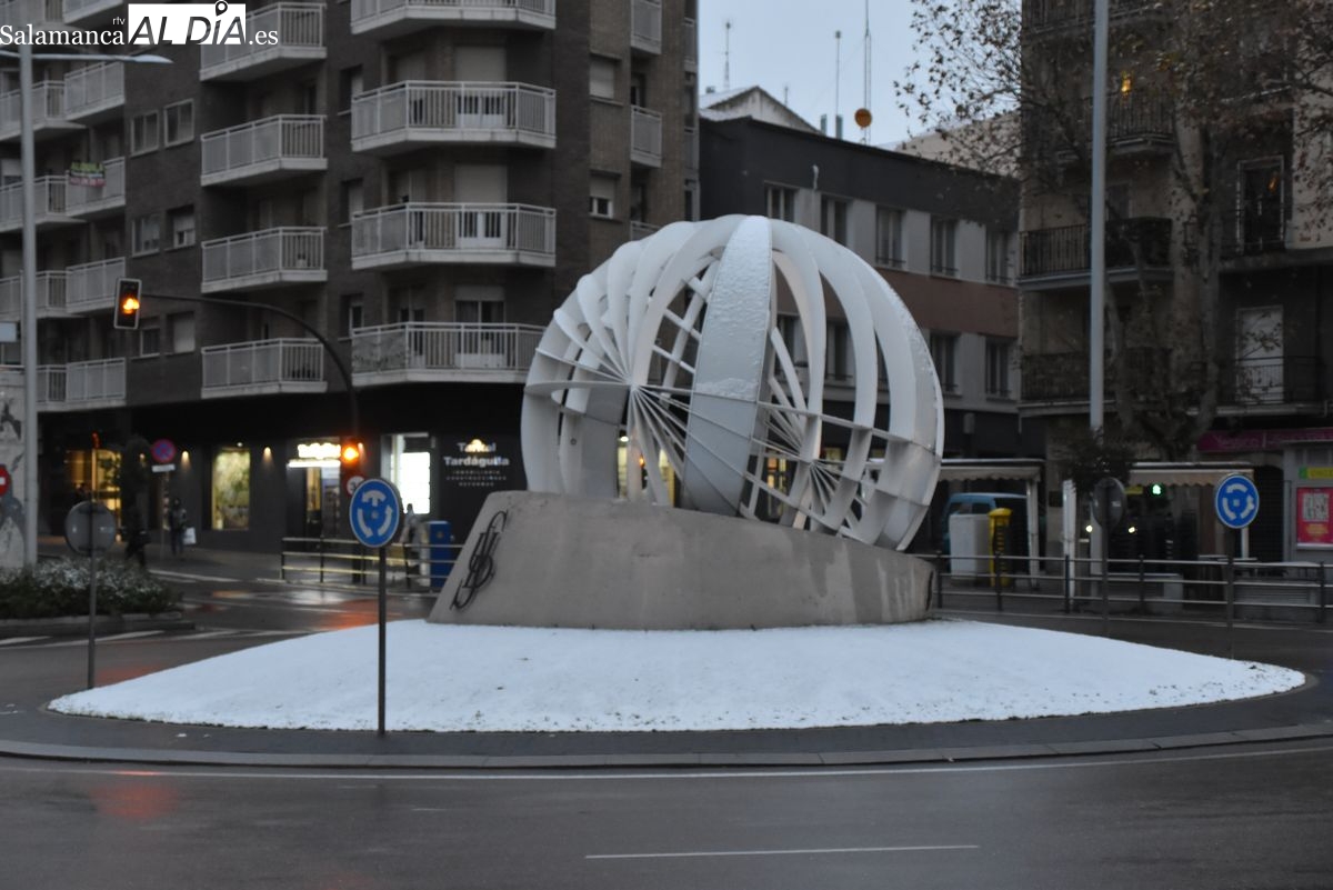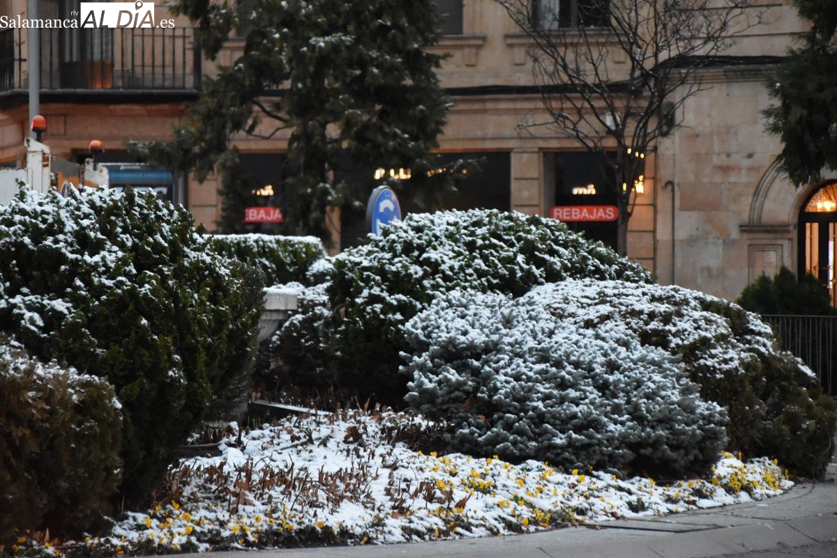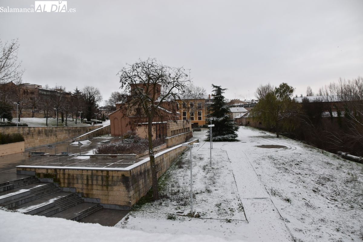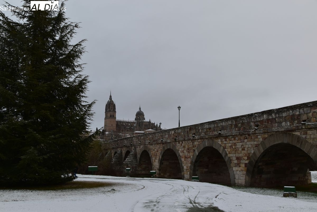 Los salmantinos se han encontrado esta mañana con bellas estampas en las calles y monumentos de la ciudad, que han quedado cubiertos por la nieve caída durante la madrugada de este miércoles, 7 de enero. El fenómeno meteorológico ha estado acompañado de un descenso notable de los termómetros, marcando una jornada rigurosamente invernal en la capital charra.