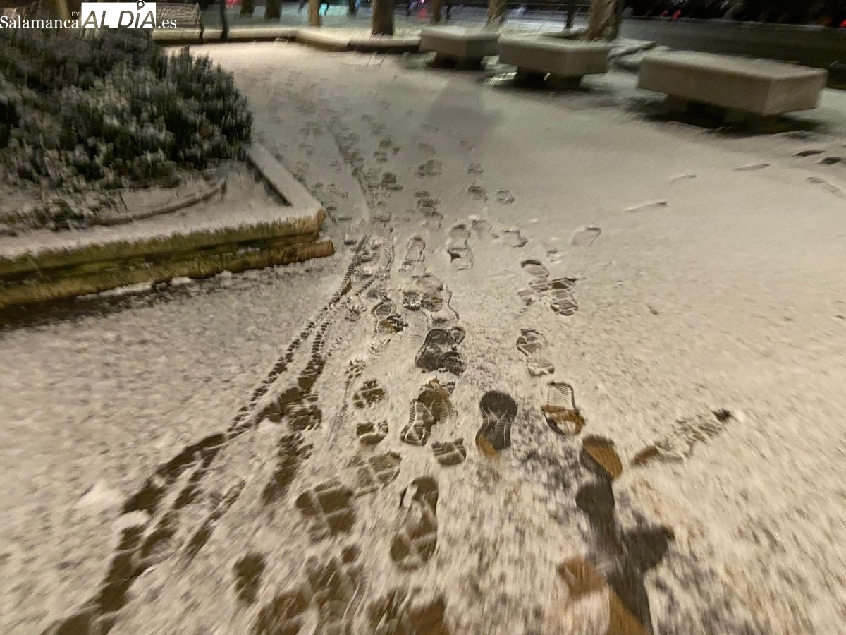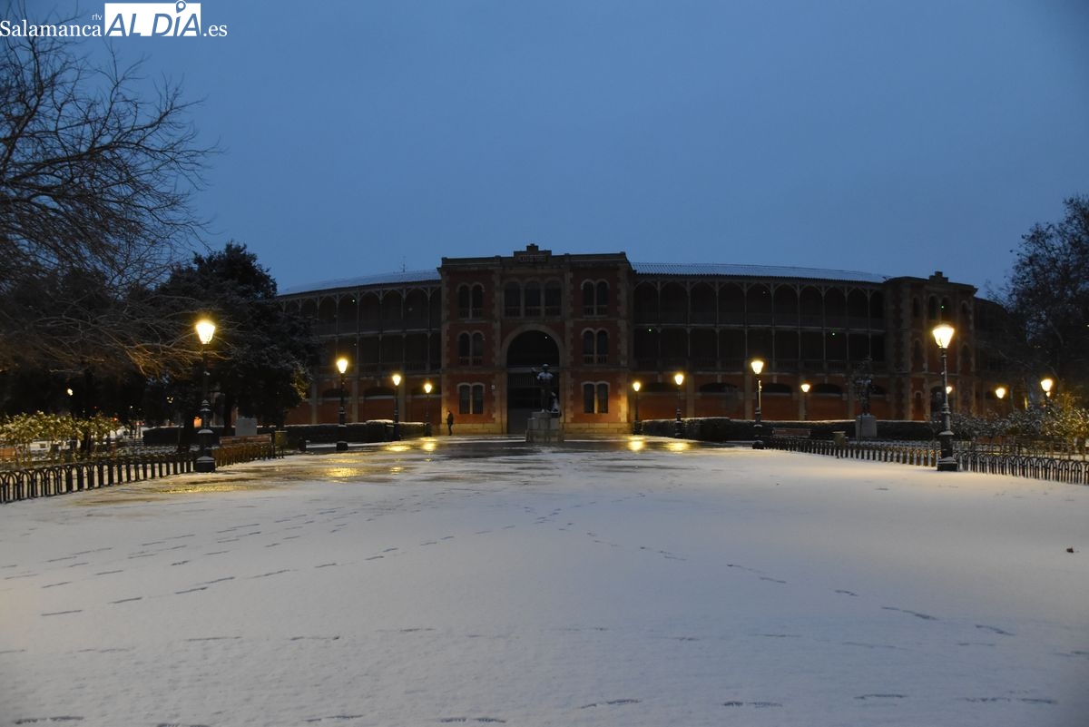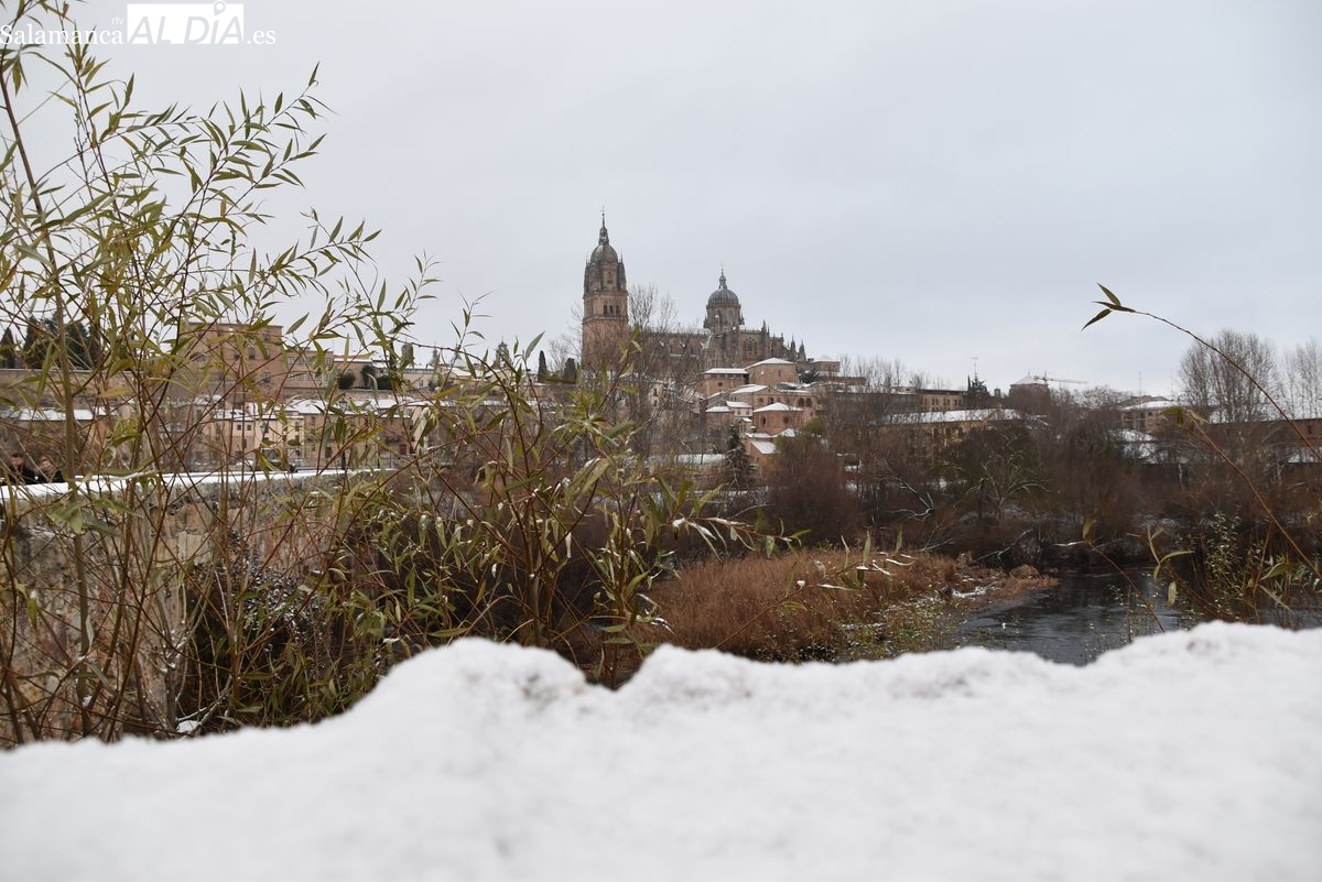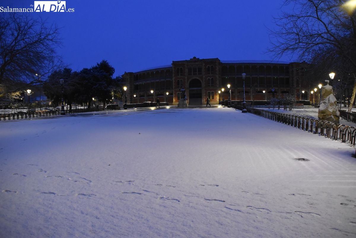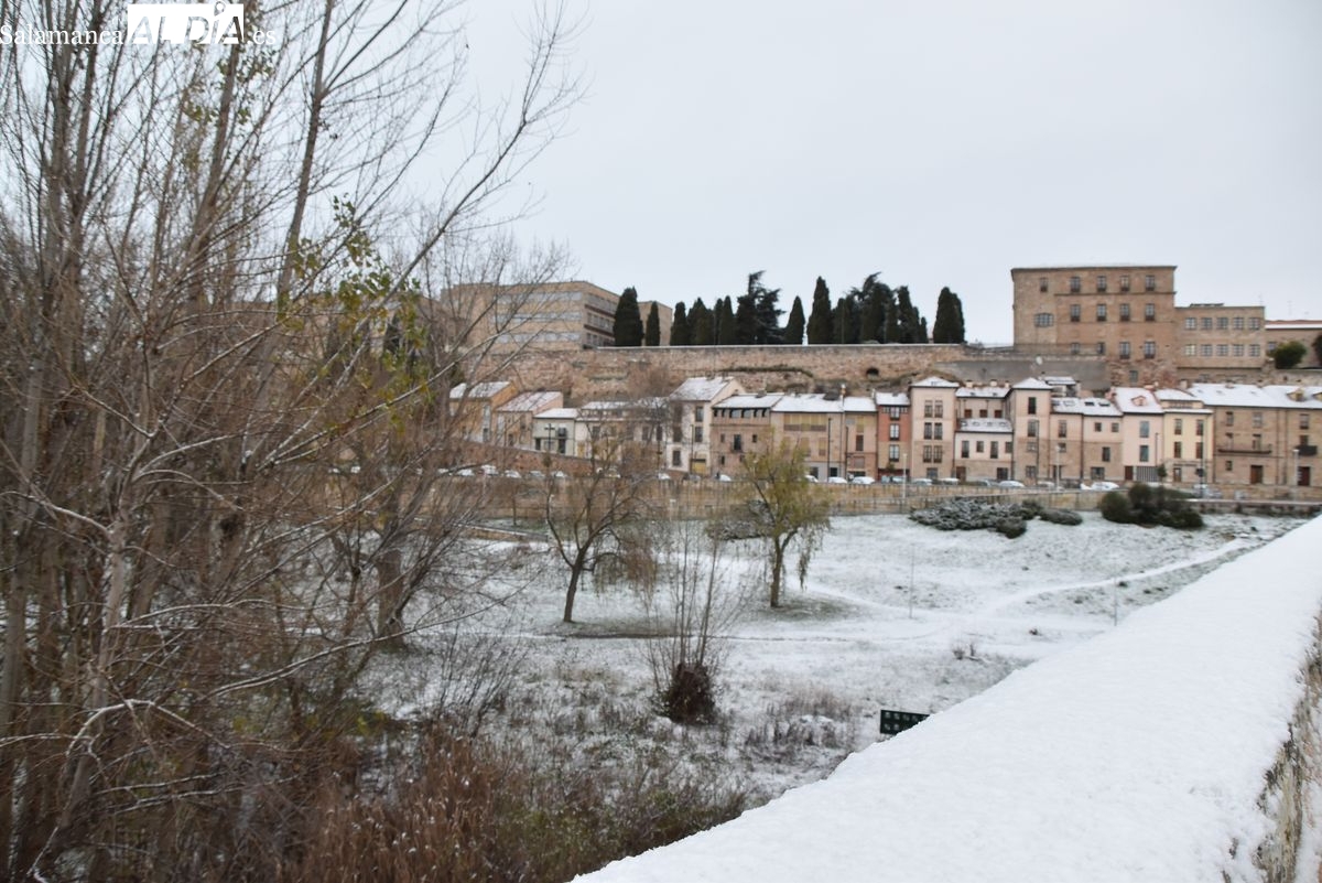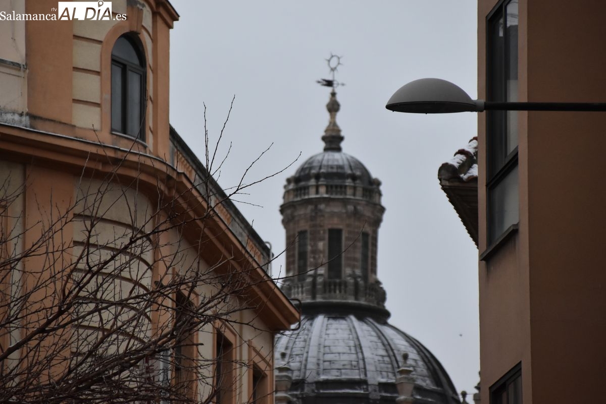 Los salmantinos se han encontrado esta mañana con bellas estampas en las calles y monumentos de la ciudad, que han quedado cubiertos por la nieve caída durante la madrugada de este miércoles, 7 de enero. El fenómeno meteorológico ha estado acompañado de un descenso notable de los termómetros, marcando una jornada rigurosamente invernal en la capital charra.