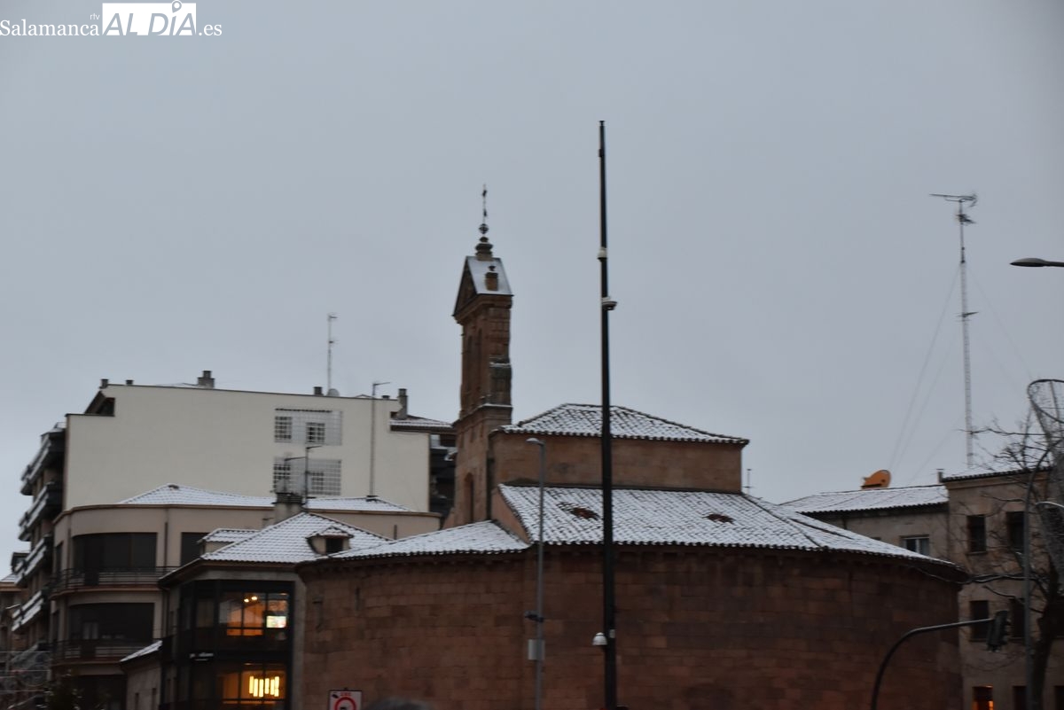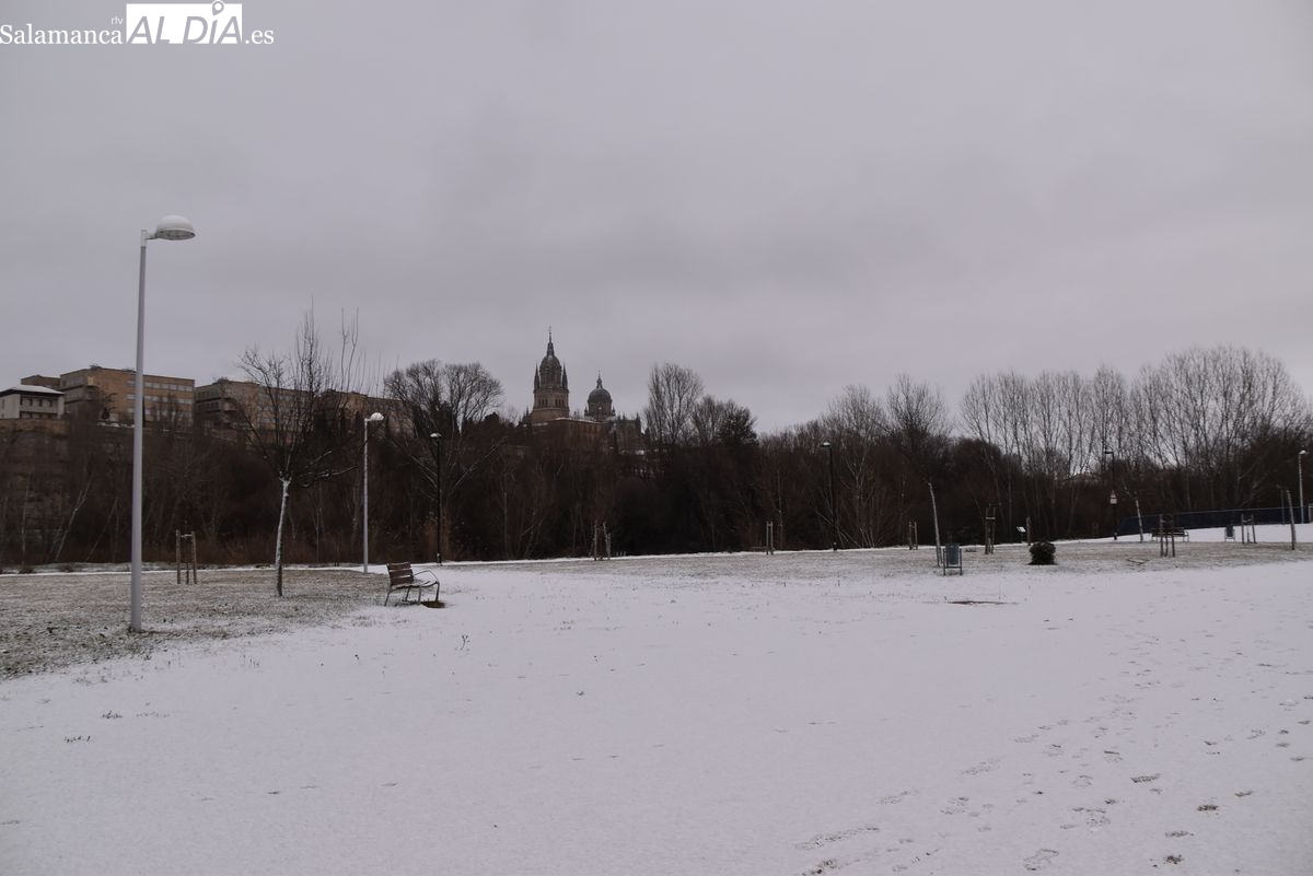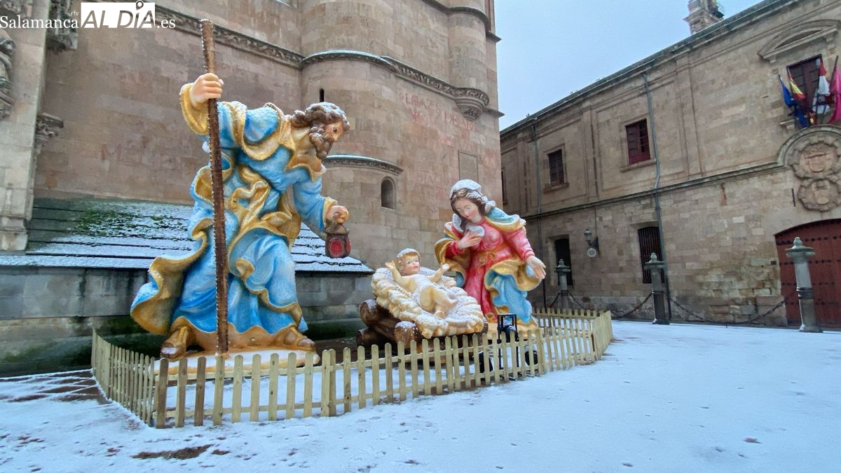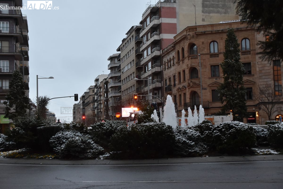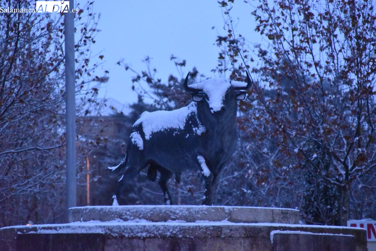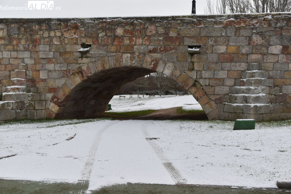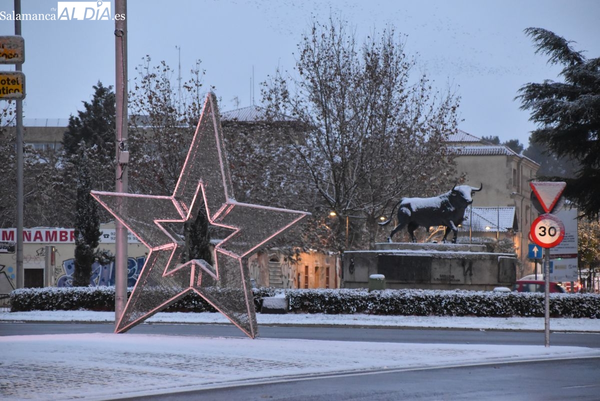 Los salmantinos se han encontrado esta mañana con bellas estampas en las calles y monumentos de la ciudad, que han quedado cubiertos por la nieve caída durante la madrugada de este miércoles, 7 de enero. El fenómeno meteorológico ha estado acompañado de un descenso notable de los termómetros, marcando una jornada rigurosamente invernal en la capital charra.