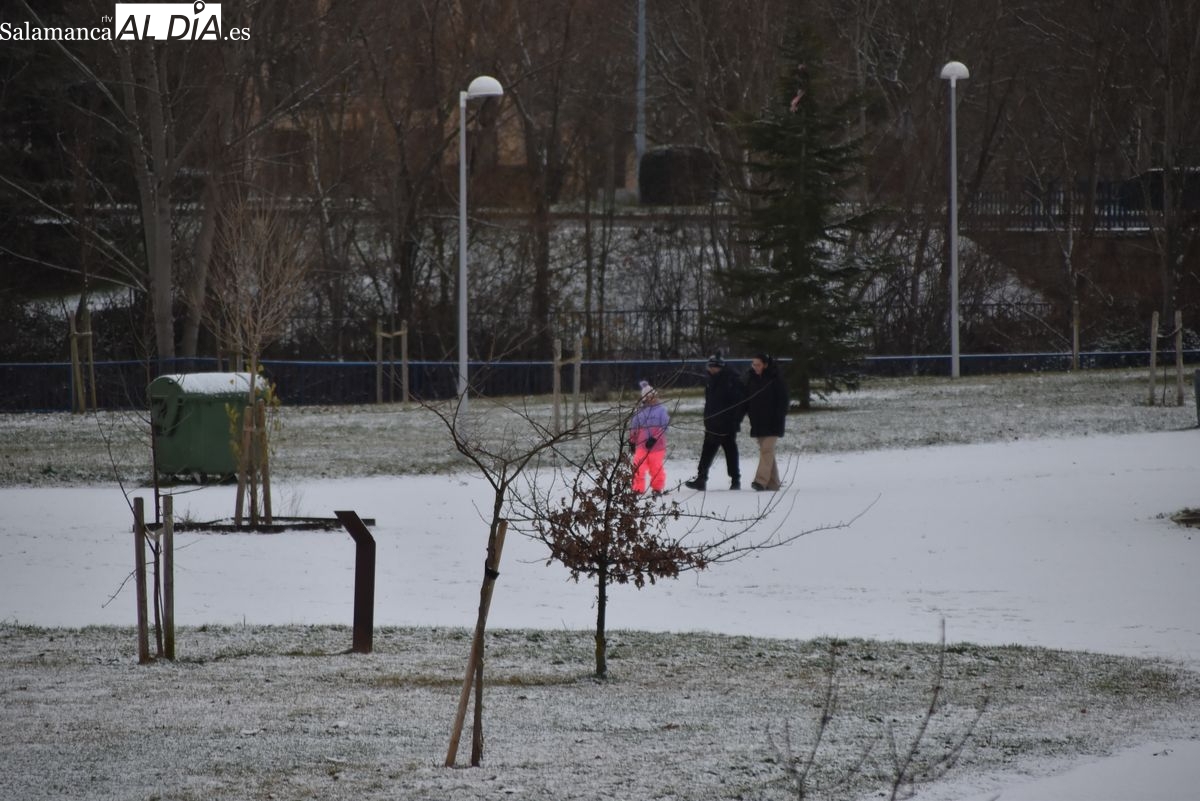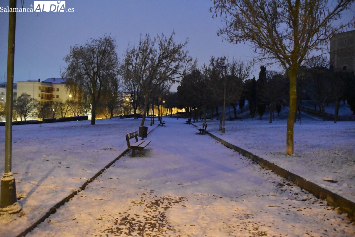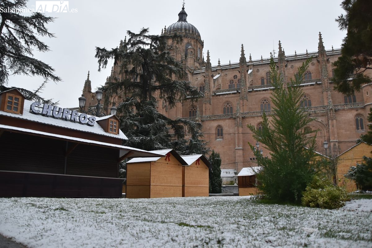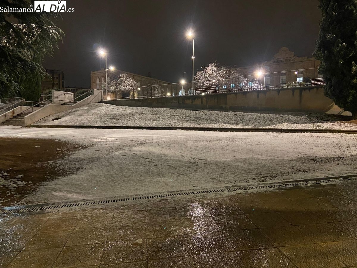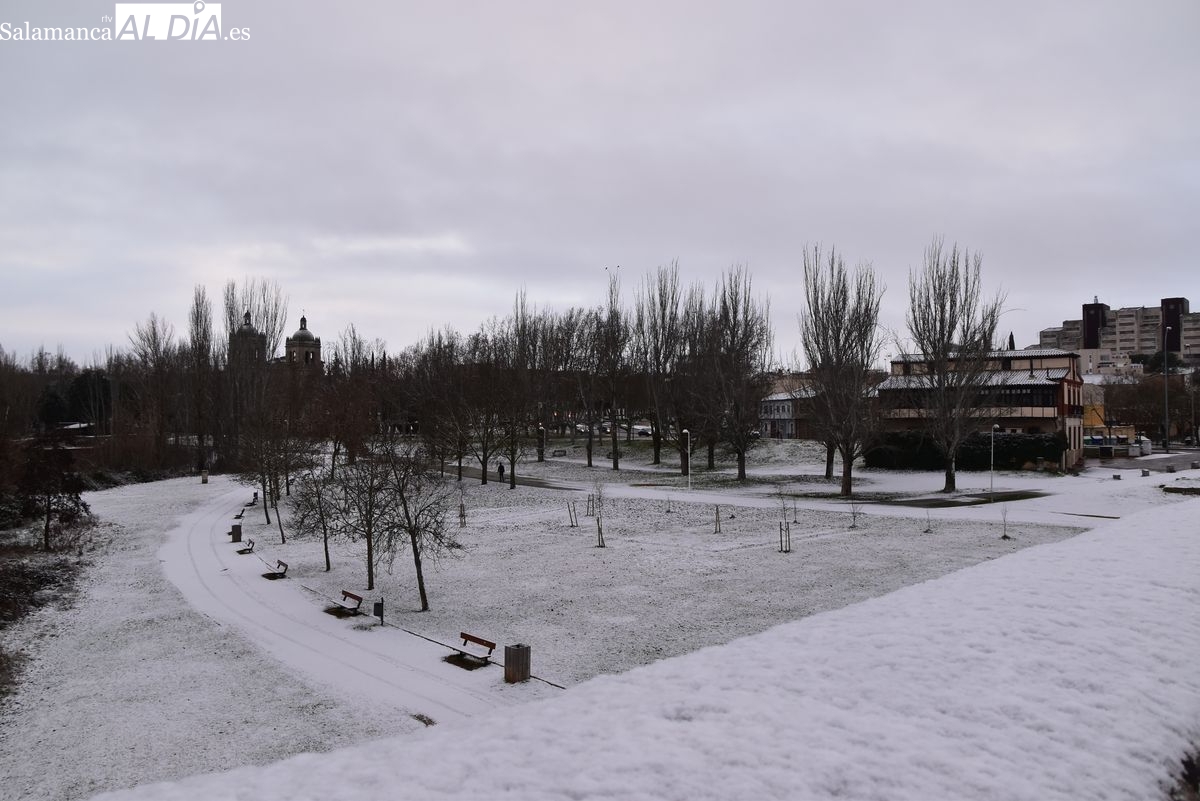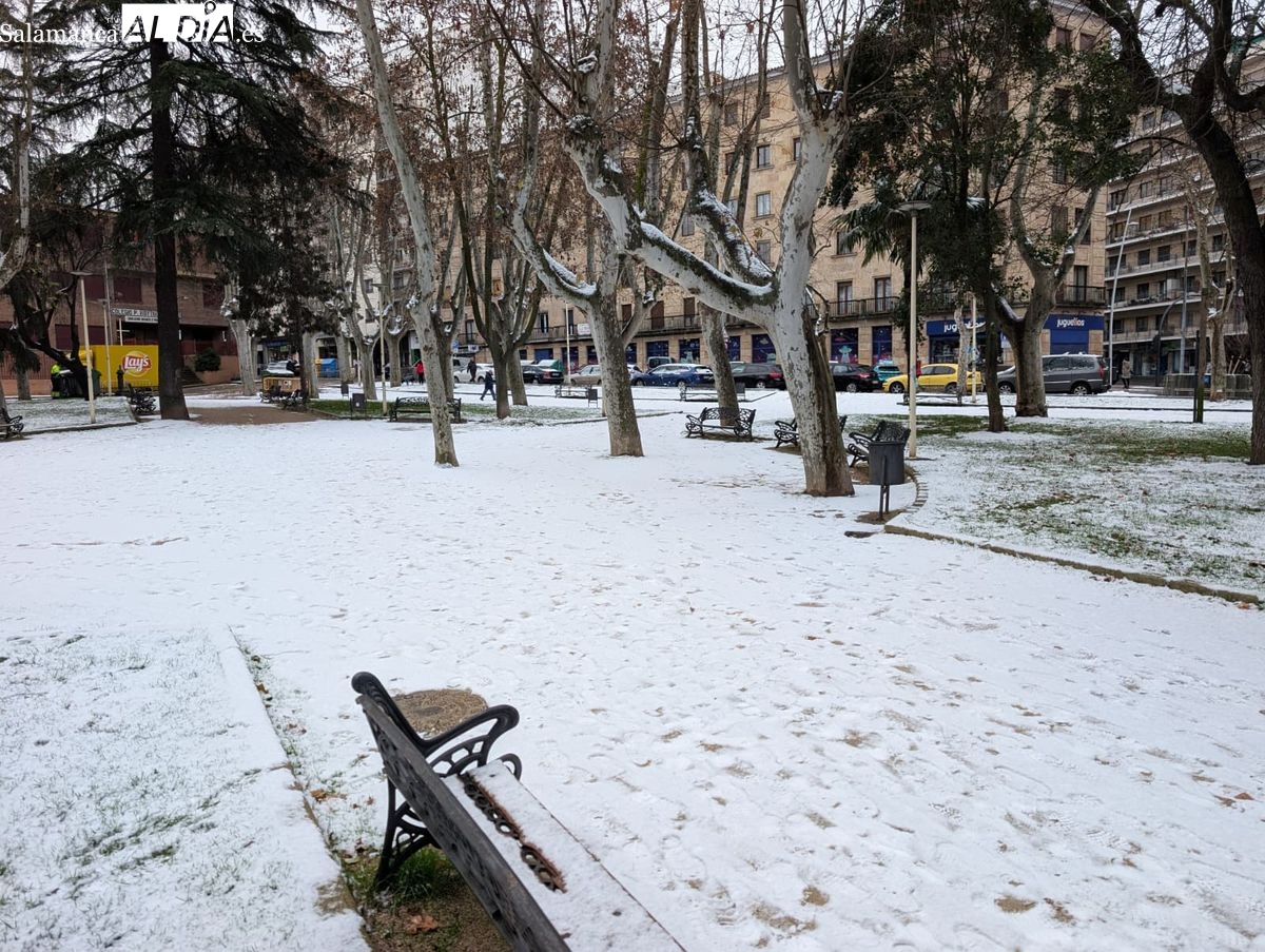 Los salmantinos se han encontrado esta mañana con bellas estampas en las calles y monumentos de la ciudad, que han quedado cubiertos por la nieve caída durante la madrugada de este miércoles, 7 de enero. El fenómeno meteorológico ha estado acompañado de un descenso notable de los termómetros, marcando una jornada rigurosamente invernal en la capital charra.