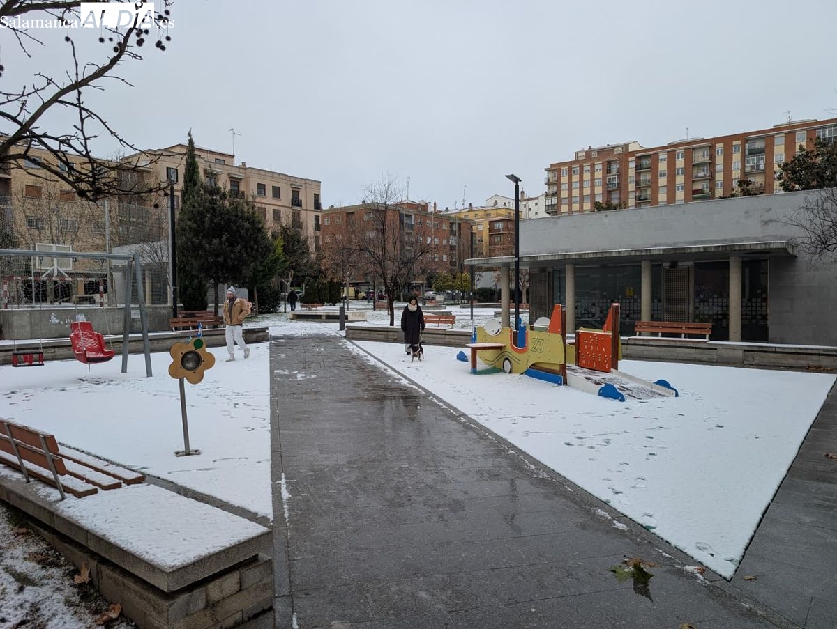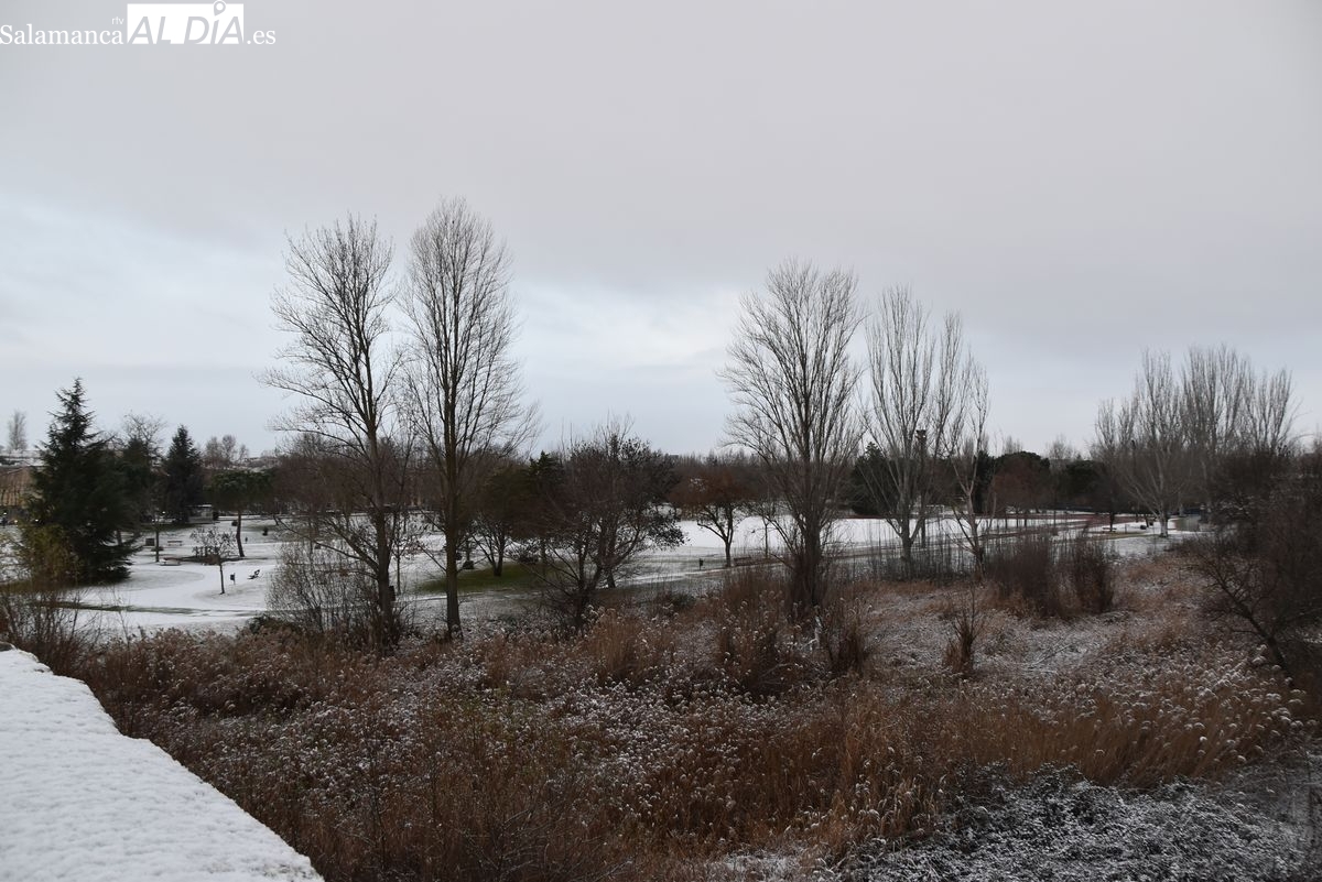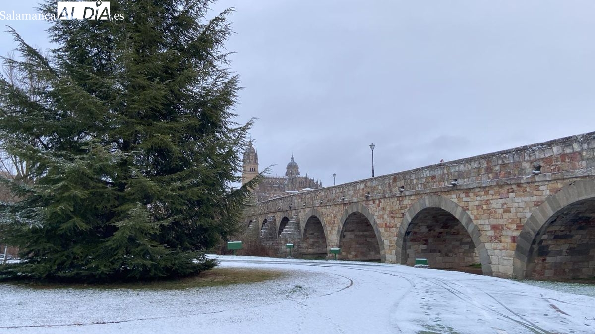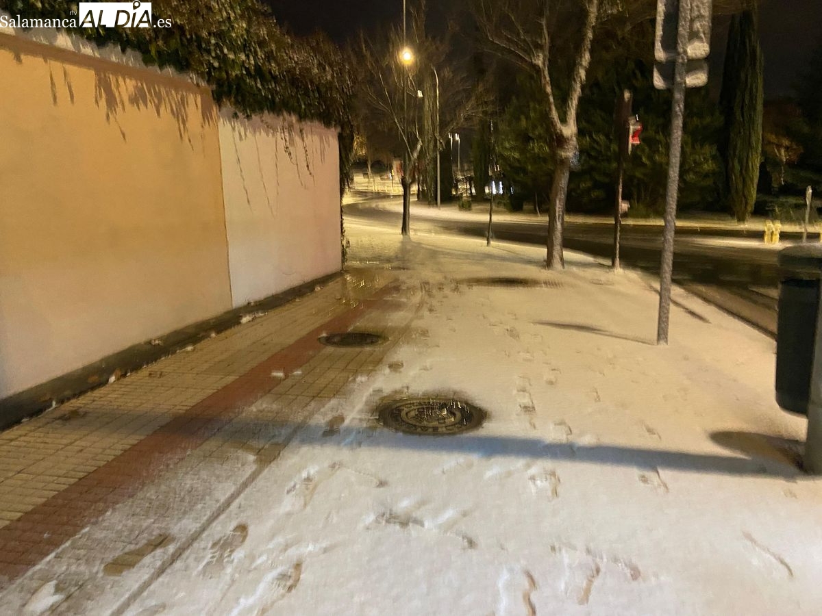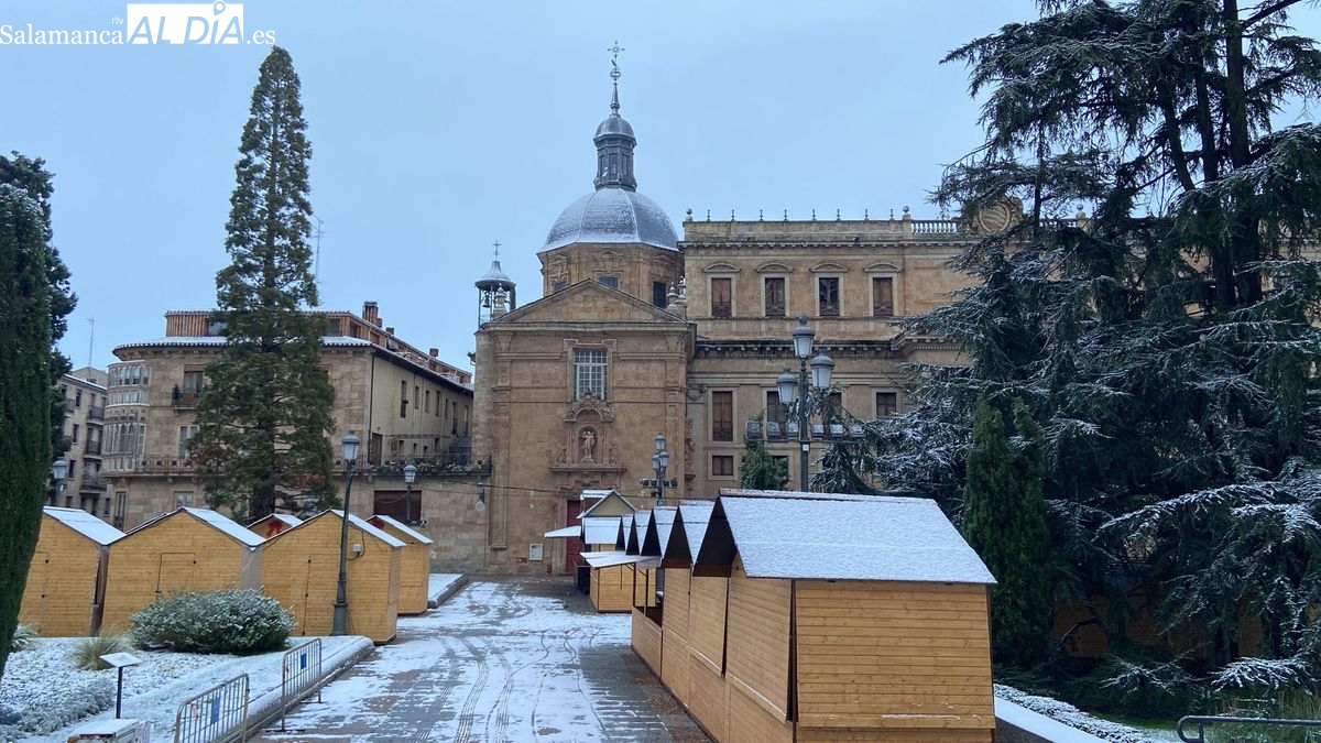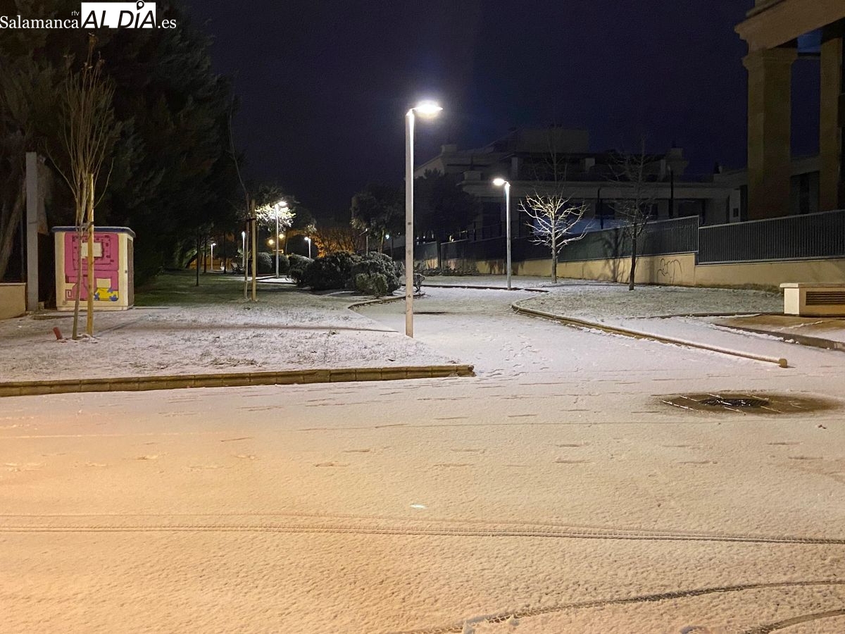 Los salmantinos se han encontrado esta mañana con bellas estampas en las calles y monumentos de la ciudad, que han quedado cubiertos por la nieve caída durante la madrugada de este miércoles, 7 de enero. El fenómeno meteorológico ha estado acompañado de un descenso notable de los termómetros, marcando una jornada rigurosamente invernal en la capital charra.