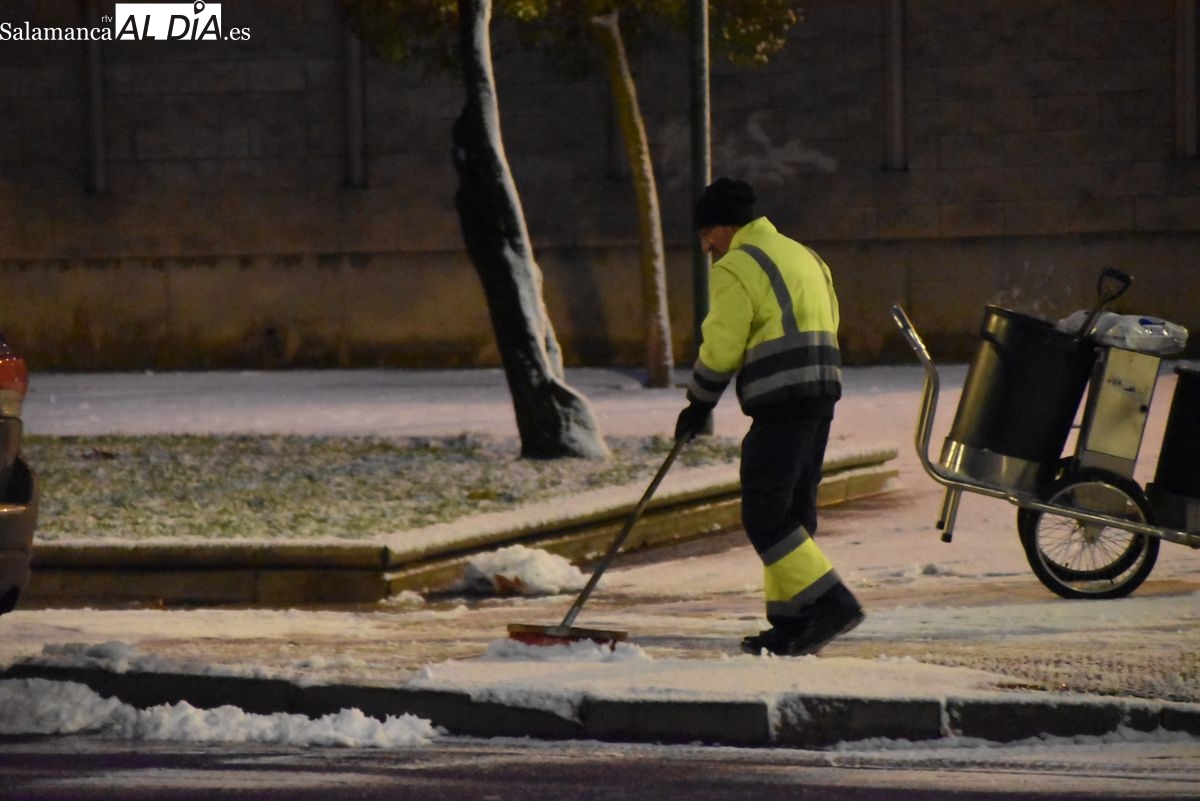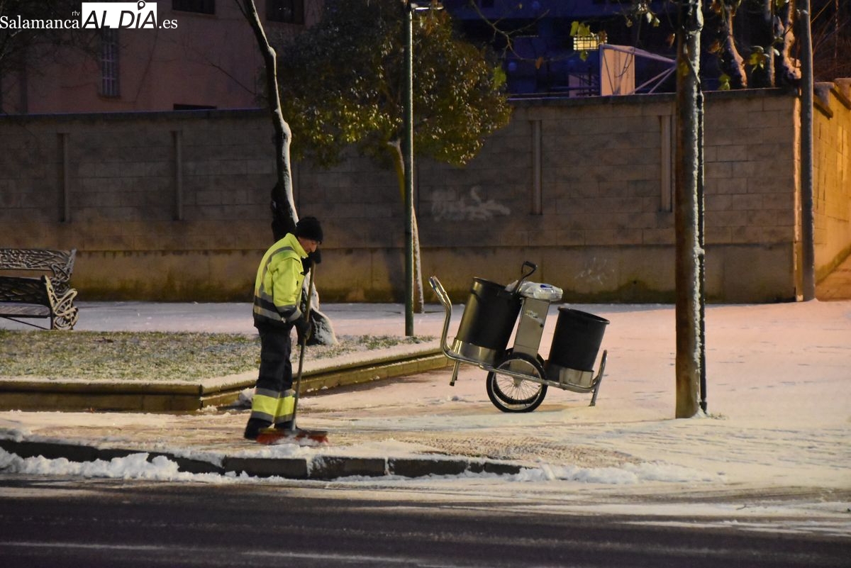 La ciudad ha despertado con una estampa puramente invernal debido a las precipitaciones en forma de nieve registradas durante las últimas horas. De hecho, desde primera hora se ha podido ver limpiadoras y barredoras del Servicio Municipal de Limpieza, retirando nieve y esparciendo sal, con el fin de evitar percances de peatones esta mañana.