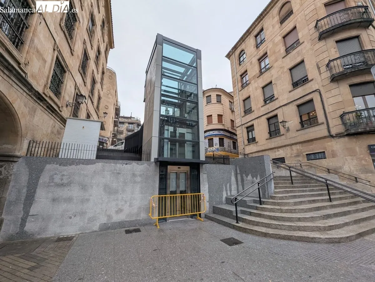 La estructura vertical del elevador ya es completamente perceptible en el entorno urbano, donde la actividad de construcción ha cesado y únicamente se mantiene una valla protegiendo la puerta de acceso. El dispositivo técnico cuenta con una cabina de 1,40 metros de ancho por 1,50 metros de fondo y un sistema de doble embarque a 180 grados con dos paradas. Sus especificaciones permiten el transporte de hasta nueve personas o una carga máxima de 900 kilos.