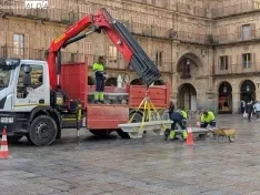 La imagen de la Plaza Mayor de Salamanca recupera hoy su fisonomía tradicional. Desde esta mañana, varios equipos de operarios municipales trabajan en la colocación de los bancos que habitualmente rodean el perímetro del ágora, marcando así el regreso a la normalidad tras el periodo festivo.