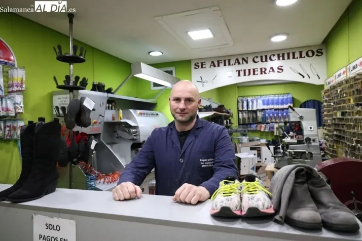 El zapatero salmantino mantiene vivo el legado familiar en su taller del Paseo de San Antonio adaptándose a la reparación de calzado deportivo y luchando contra la presión fiscal y el relevo generacional.