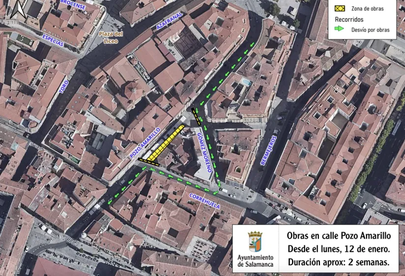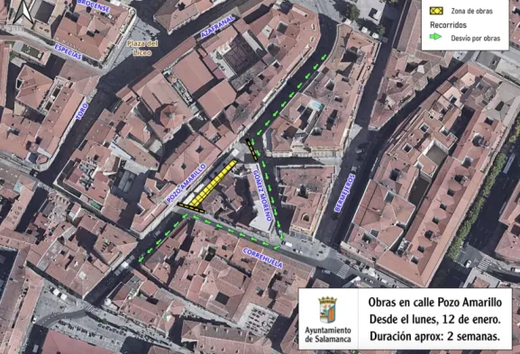 La calle Pozo Amarillo de Salamanca registrará cortes de tráfico a partir de este lunes, 12 de enero, debido a la ejecución de unas obras. Según ha informado el Ayuntamiento de la ciudad, los trabajos se prolongarán durante un periodo aproximado de dos semanas.