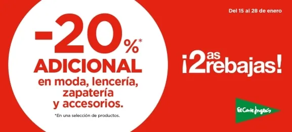 El Corte Inglés da un nuevo impulso a su campaña invernal con el lanzamiento, desde este viernes 16 de enero, de sus "Segundas Rebajas". La compañía de distribución aplica desde hoy un 20 % de descuento adicional sobre los precios ya rebajados en una amplia selección de artículos de moda, lencería, accesorios y zapatería.