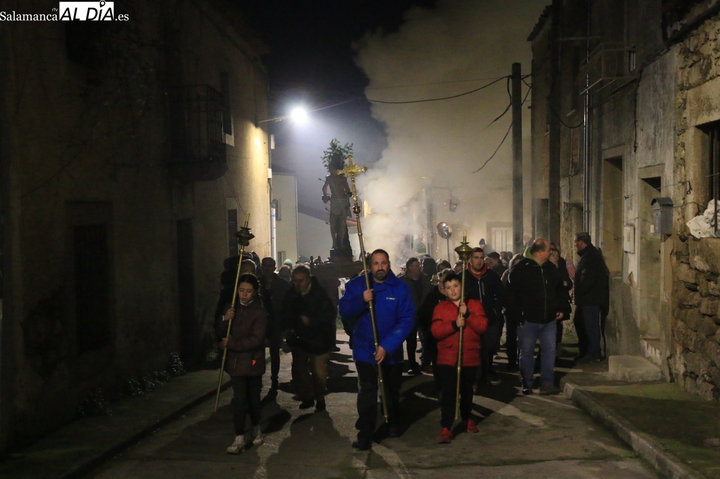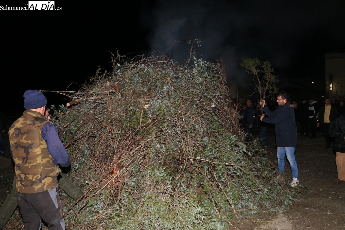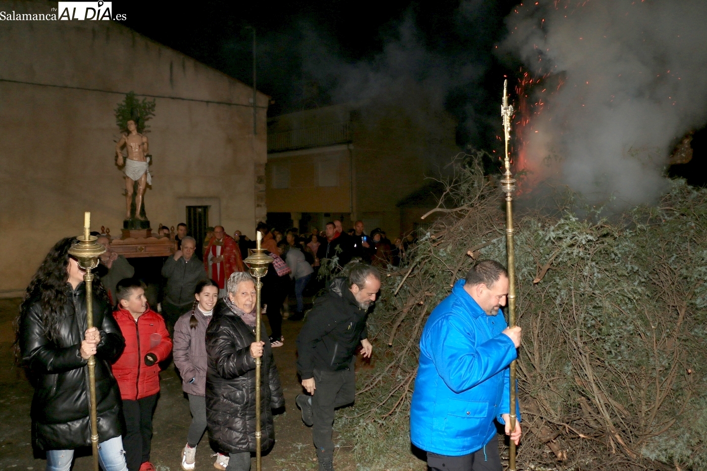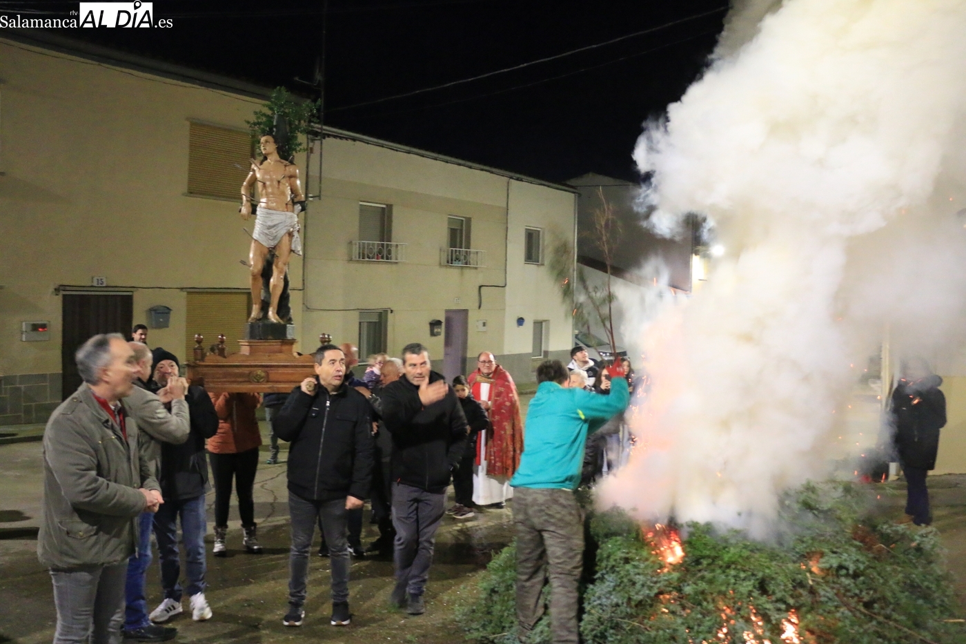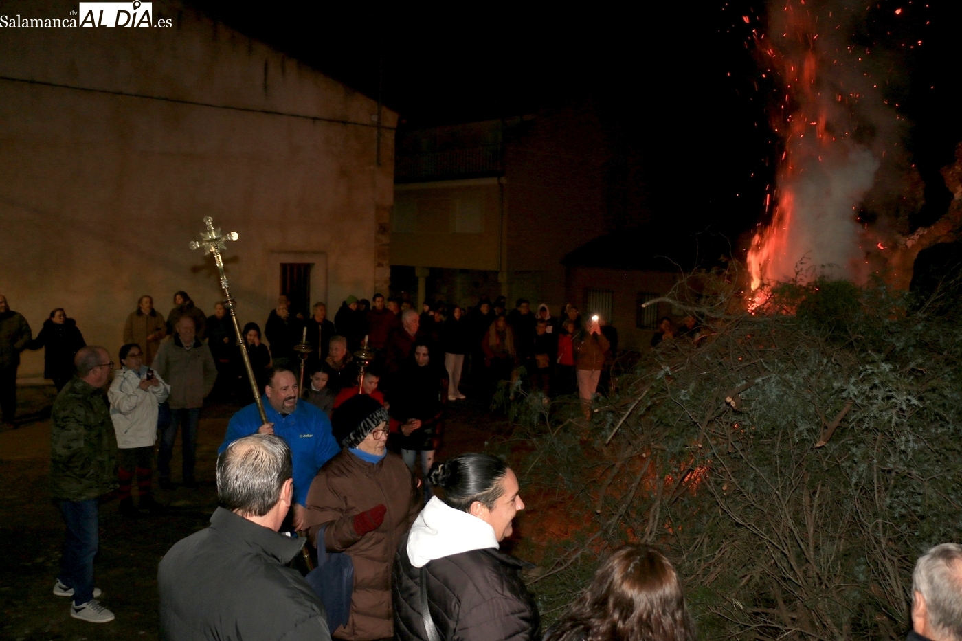 El momento cumbre de la festividad se vivió durante el recorrido por las calles de la localidad, acto pficiado por el párroco José Sánchez Arroyo, ya de regreso de las hogueras de Sobradillo. Al paso de la comitiva se prendieron hasta cinco hogueras de júmbrio. Estas fogatas, convenientemente atizadas por los participantes, provocaron grandes humaredas cumpliendo con el rito ancestral, pues según la tradición, el humo purificará de todo mal a aquel que se 'ajuma' al cruzarlo o rodearlo.