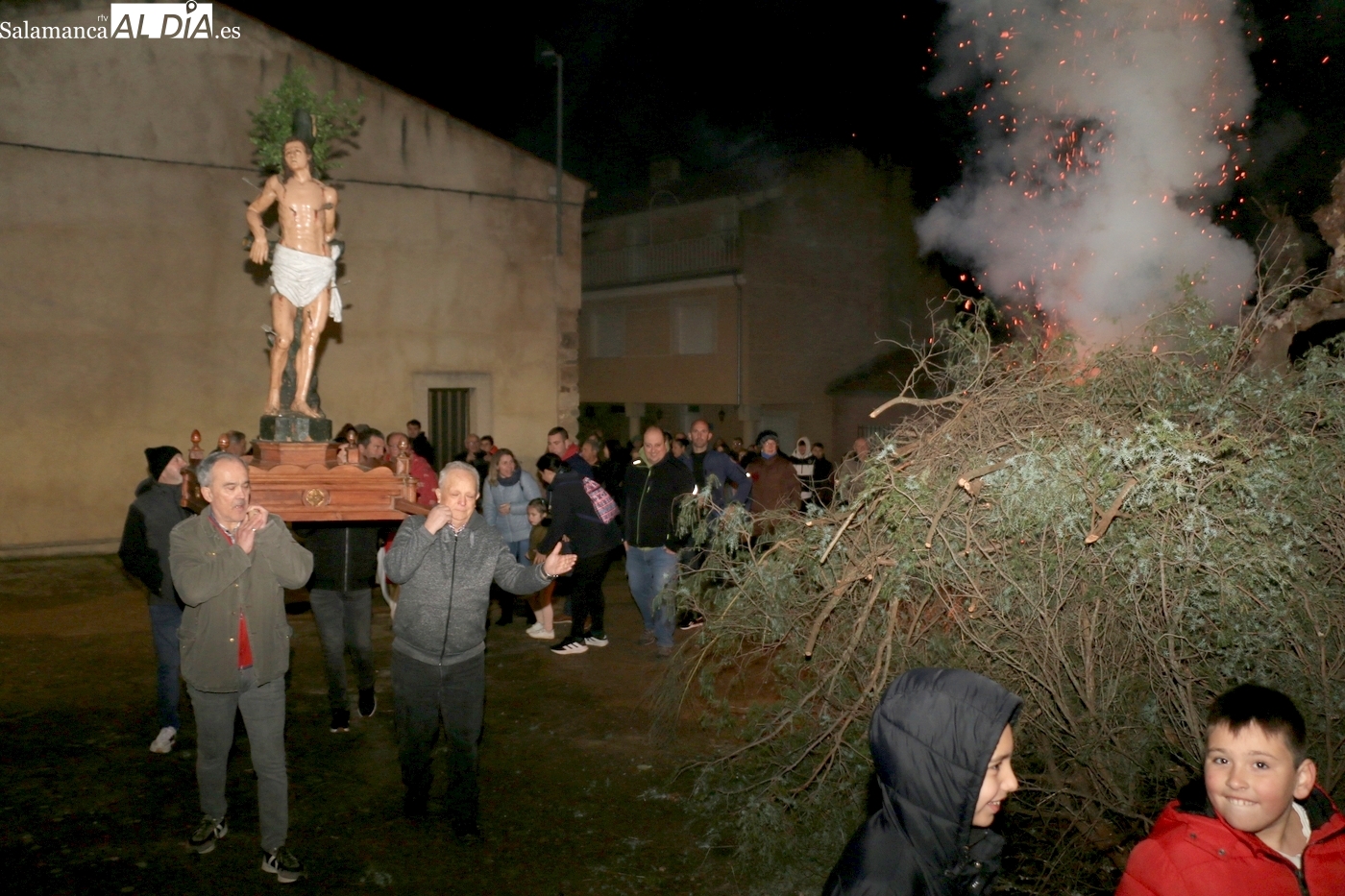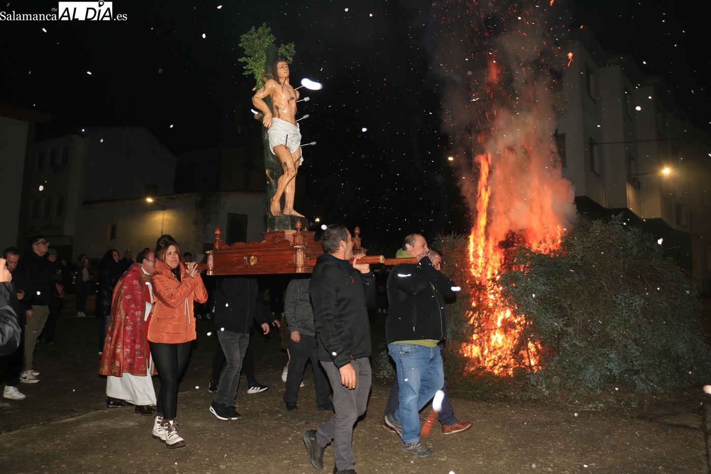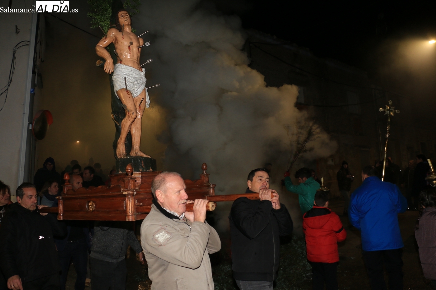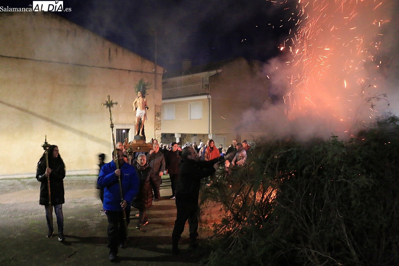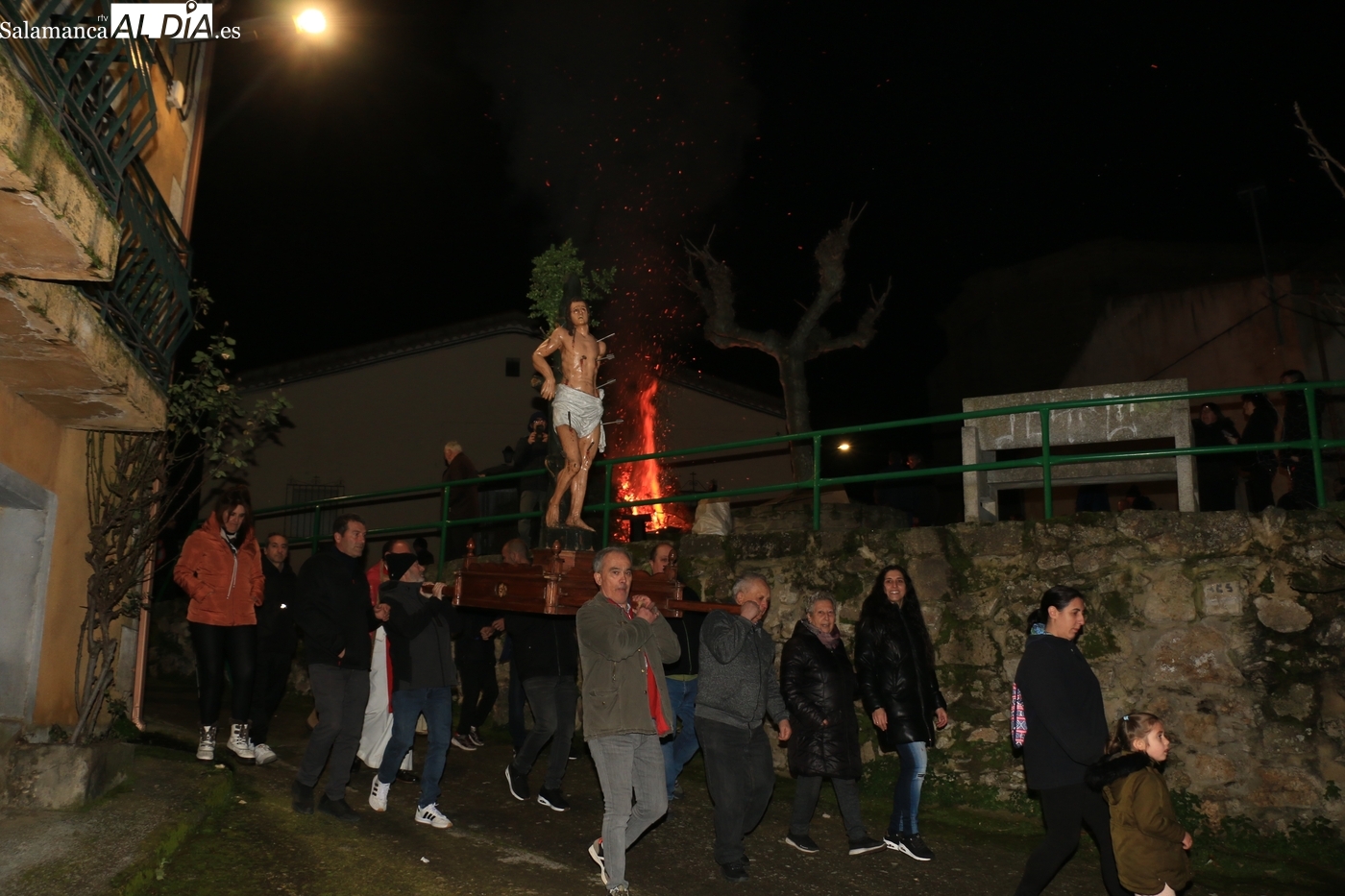 El momento cumbre de la festividad se vivió durante el recorrido por las calles de la localidad, acto pficiado por el párroco José Sánchez Arroyo, ya de regreso de las hogueras de Sobradillo. Al paso de la comitiva se prendieron hasta cinco hogueras de júmbrio. Estas fogatas, convenientemente atizadas por los participantes, provocaron grandes humaredas cumpliendo con el rito ancestral, pues según la tradición, el humo purificará de todo mal a aquel que se 'ajuma' al cruzarlo o rodearlo.
