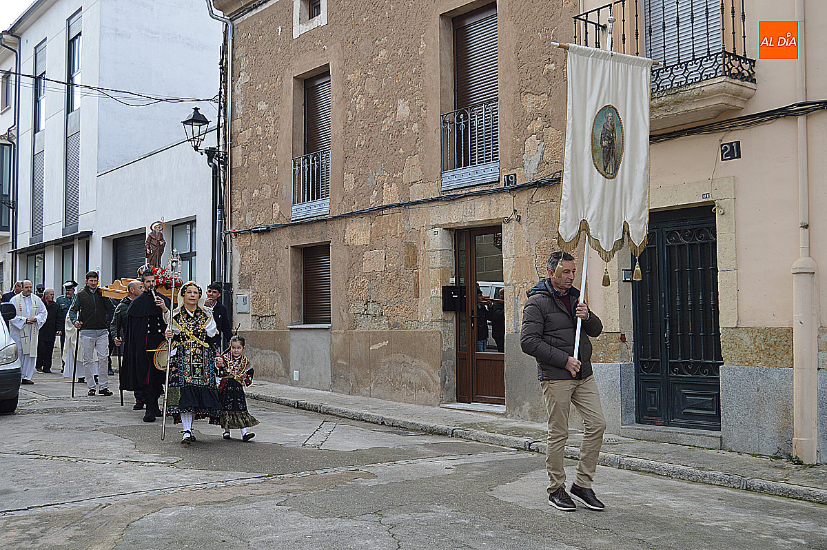 Tras la bendición, la comitiva ha iniciado un breve recorrido por las calles próximas al templo. La procesión ha estado encabezada por el estandarte del santo, seguida por la mayordoma de este año, Yolanda Hernández, vestida con el traje charro y acompañada por una niña también vestida con indumentaria tradicional. El tamborilero Sergio Montero, natural de El Bodón, ha puesto música y ritmo al recorrido, mientras que la imagen de San Antón, patrón de los animales, presidía la procesión.