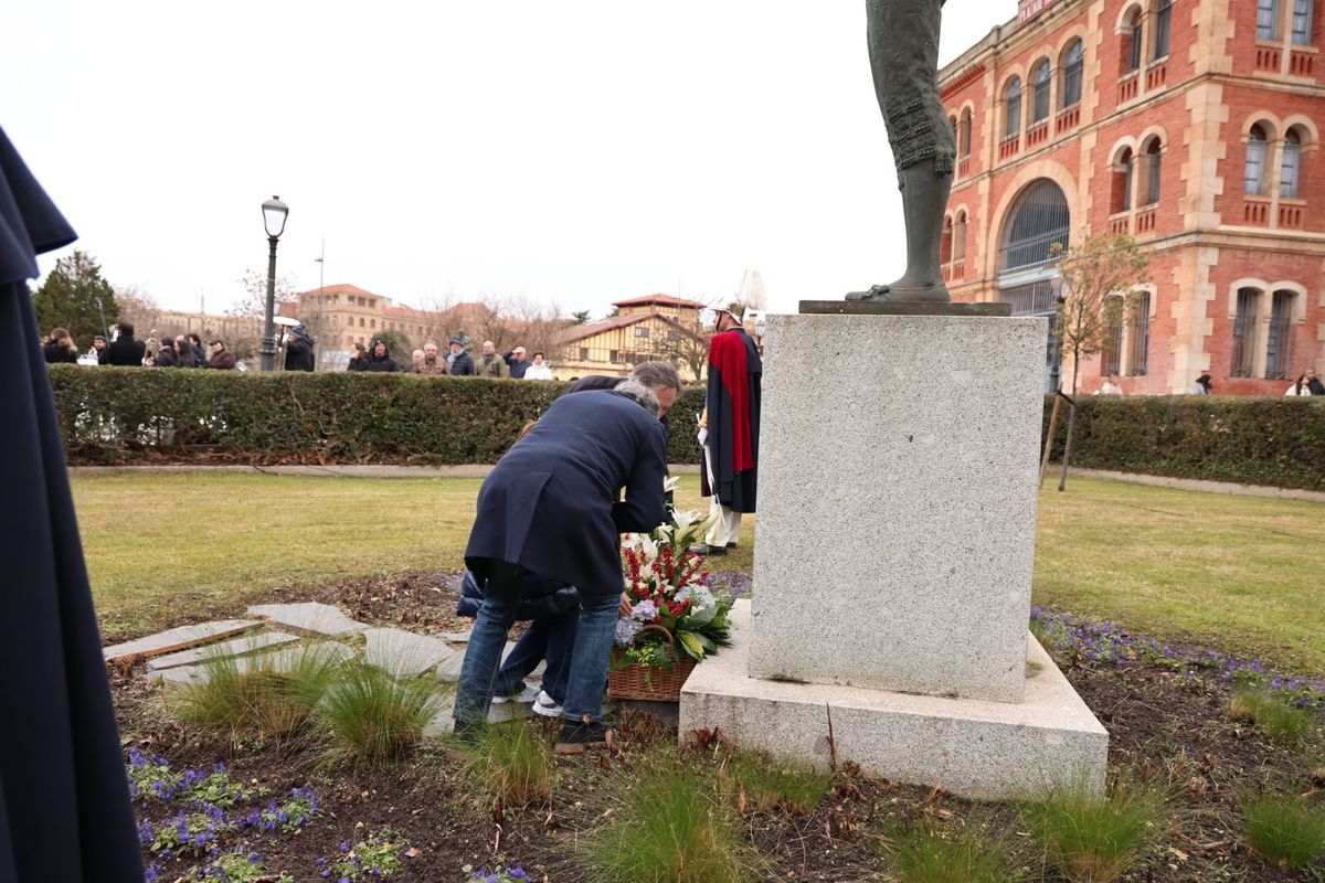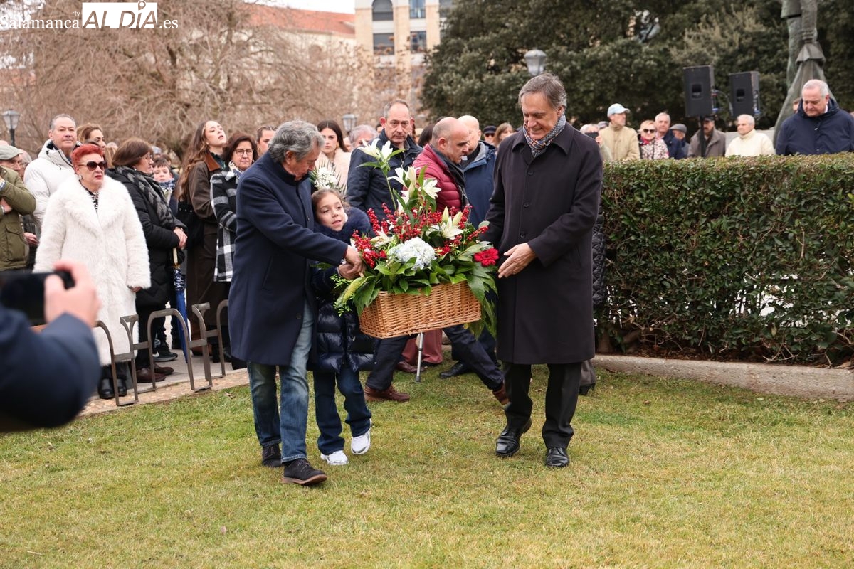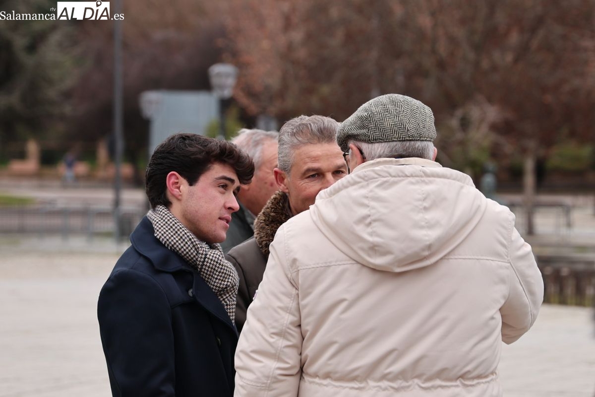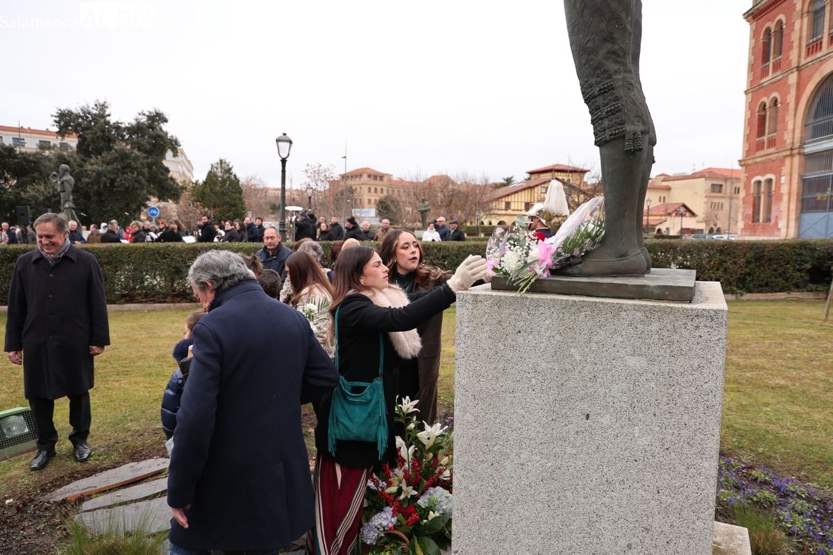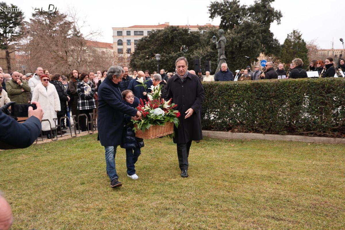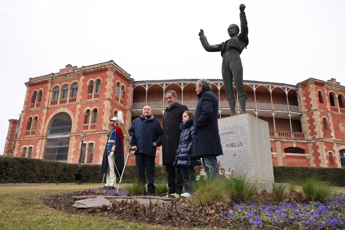 Tras la intervención musical, ha tomado la palabra el presidente de la Federación de Peñas Taurinas de Salamanca, Jorge Lurueña. Acto seguido, y acompañado por el alcalde de Salamanca, Carlos García Carbayo, y los familiares de Julio Robles, se ha procedido a depositar un centro de flores a los pies de la escultura.