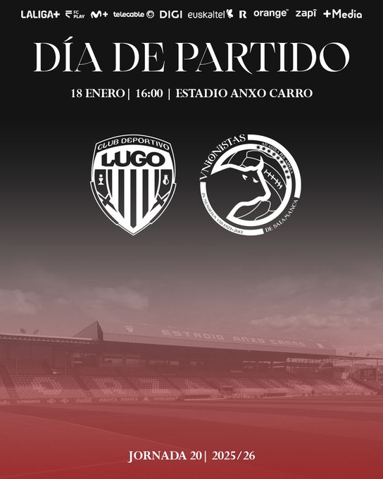 ¡Saludos y bienvenidos a la retransmisión en directo del Lugo - Unionistas! Desde SALAMANCArtv AL DÍA te contamos todo lo que pase en el partido y así no te pierdes absolutamente nada gracias a nuestro minuto a minuto. El balón comenzará a rodar en el Anxo Carro a partir de las 16:00 horas en la jornada 20 de Liga de Primera Federación.