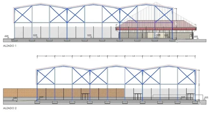 El elemento central del proyecto es la cubrición de las tres canchas. Para ello, se instalará una estructura de once metros de altura construida con panel sándwich acústico en acero galvanizado. El diseño técnico contempla también el cerramiento lateral de la cubierta, que se realizará hasta una altura de cinco metros por debajo del alero, protegiendo así el espacio de juego del viento y la lluvia lateral.