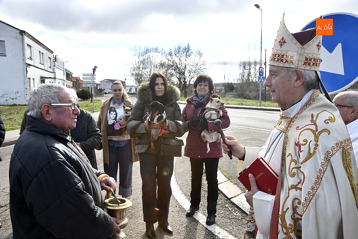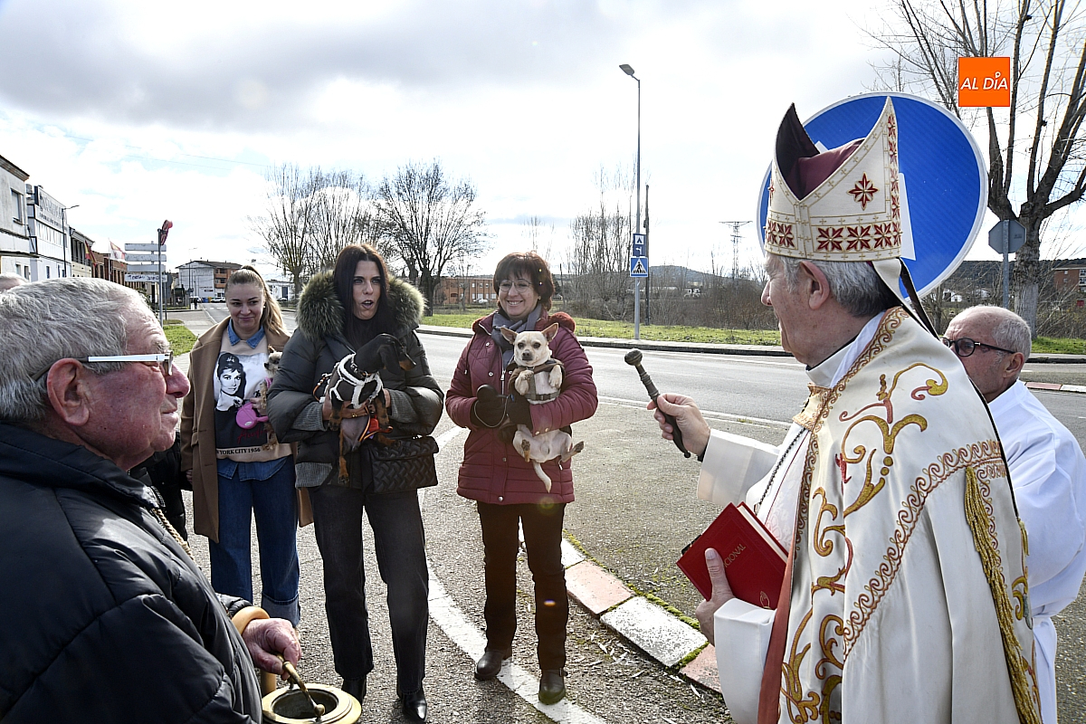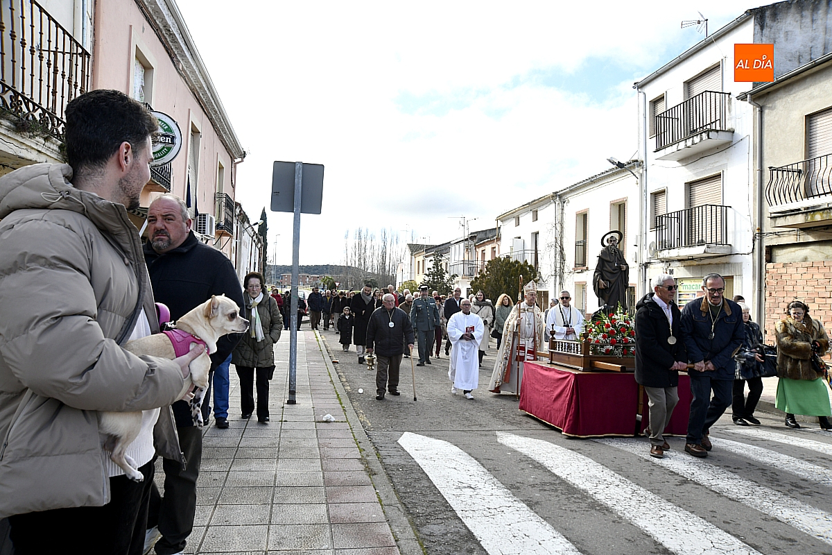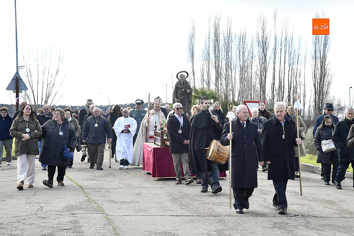 Uno de los momentos más esperados ha tenido lugar cuando la procesión ha alcanzado la carretera de Cáceres. En este punto, el obispo ha procedido a la tradicional bendición de los animales, protagonizada en esta ocasión mayoritariamente por canes que acompañaban a sus dueños, reflejo del cambio de los tiempos y la desaparición paulatina de las pequeñas explotaciones ganaderas.