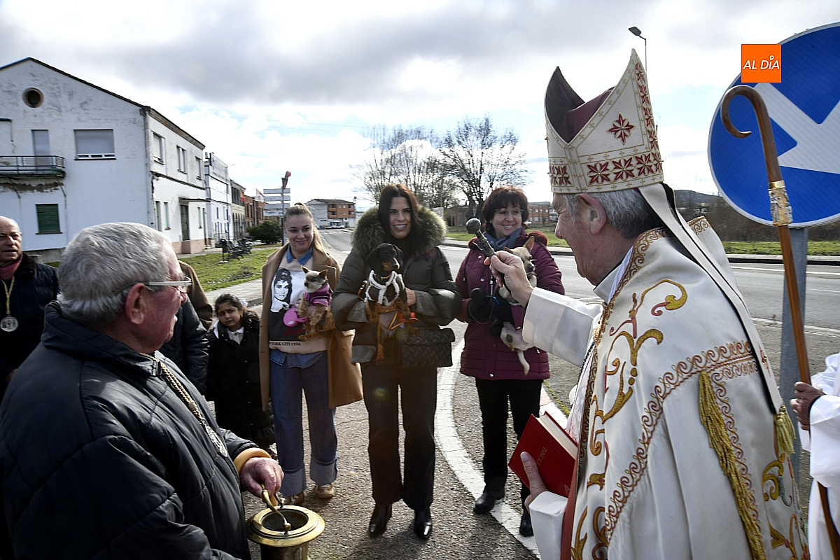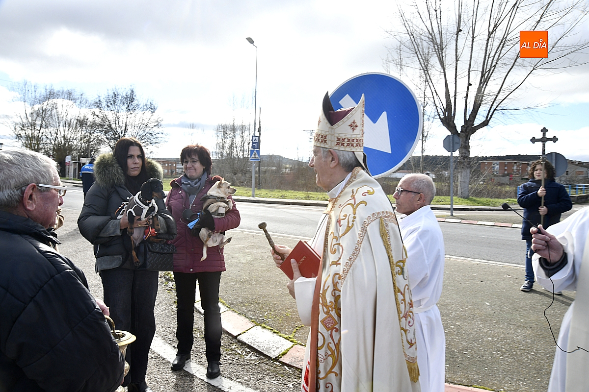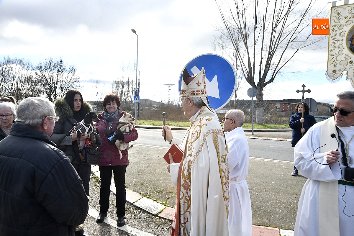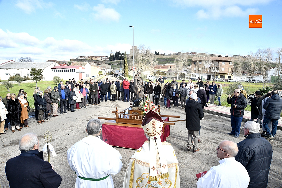 Uno de los momentos más esperados ha tenido lugar cuando la procesión ha alcanzado la carretera de Cáceres. En este punto, el obispo ha procedido a la tradicional bendición de los animales, protagonizada en esta ocasión mayoritariamente por canes que acompañaban a sus dueños, reflejo del cambio de los tiempos y la desaparición paulatina de las pequeñas explotaciones ganaderas.
