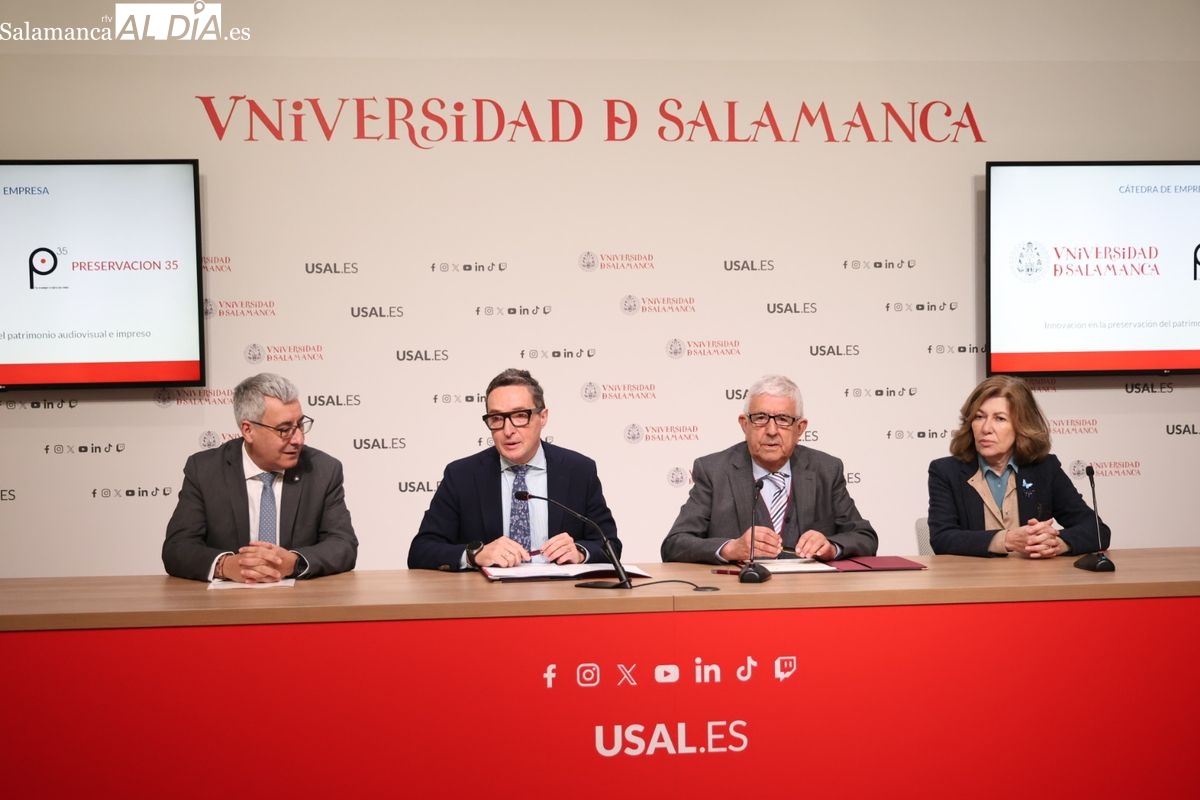 La Universidad de Salamanca (USAL) y la empresa Preservación 35 han formalizado esta mañana una alianza estratégica con la firma de un convenio que da luz verde a la creación de una nueva Cátedra de Empresa. Esta iniciativa, pionera en el ámbito nacional, nace con el objetivo de innovar en la conservación del patrimonio audiovisual e impreso mediante el uso de algoritmos computacionales y técnicas avanzadas de inteligencia artificial.