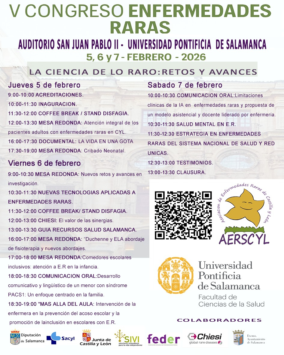 La ciudad de Salamanca se prepara para acoger el V Congreso de Enfermedades Raras, un evento clave que se celebrará los días 5, 6 y 7 de febrero de 2026. Bajo el lema "La ciencia de lo raro: Retos y avances", la cita tendrá lugar en el Auditorio San Juan Pablo II de la Universidad Pontificia de Salamanca.