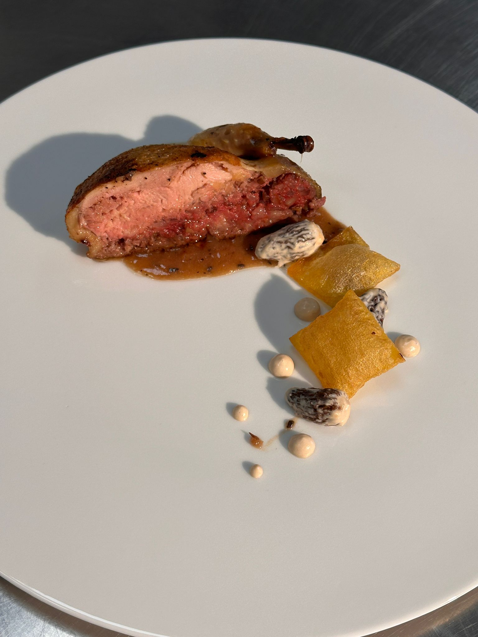 Para esta fase del concurso, ha diseñado y ejecutado un plato complejo que lleva por título 'Codorniz rellena, con salsa de amaretto y trufa, colmenillas a la crema y patatas soufflé'. La receta busca demostrar el dominio de diversas técnicas culinarias, desde el tratamiento de la carne de caza hasta la elaboración de salsas y guarniciones clásicas de la alta cocina.