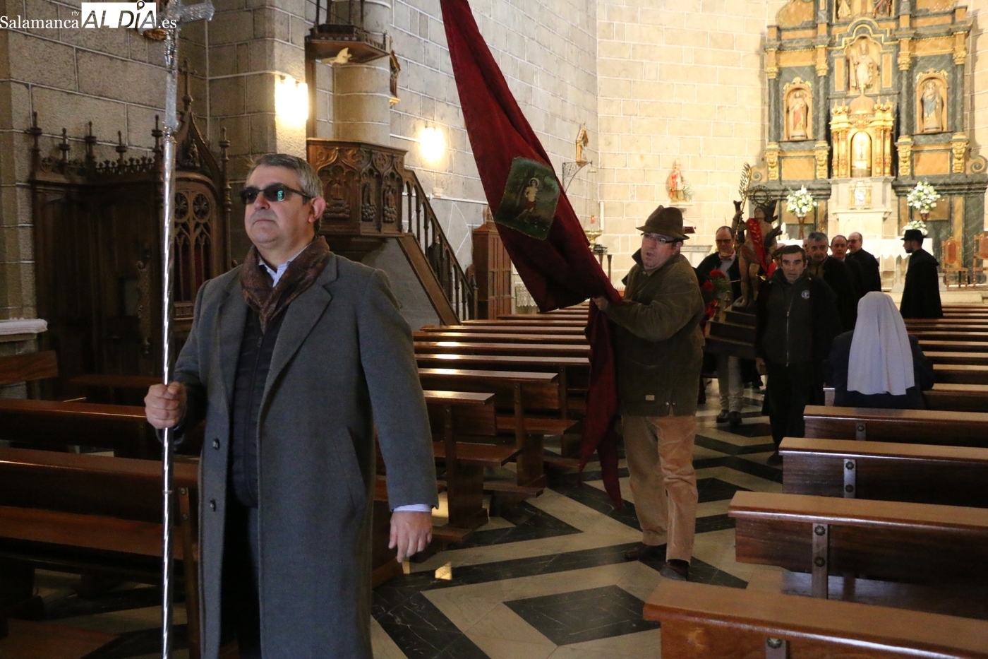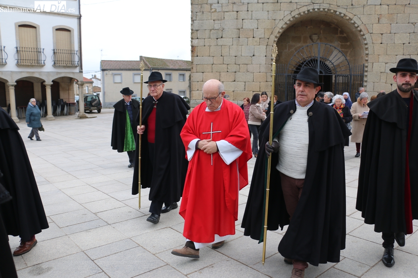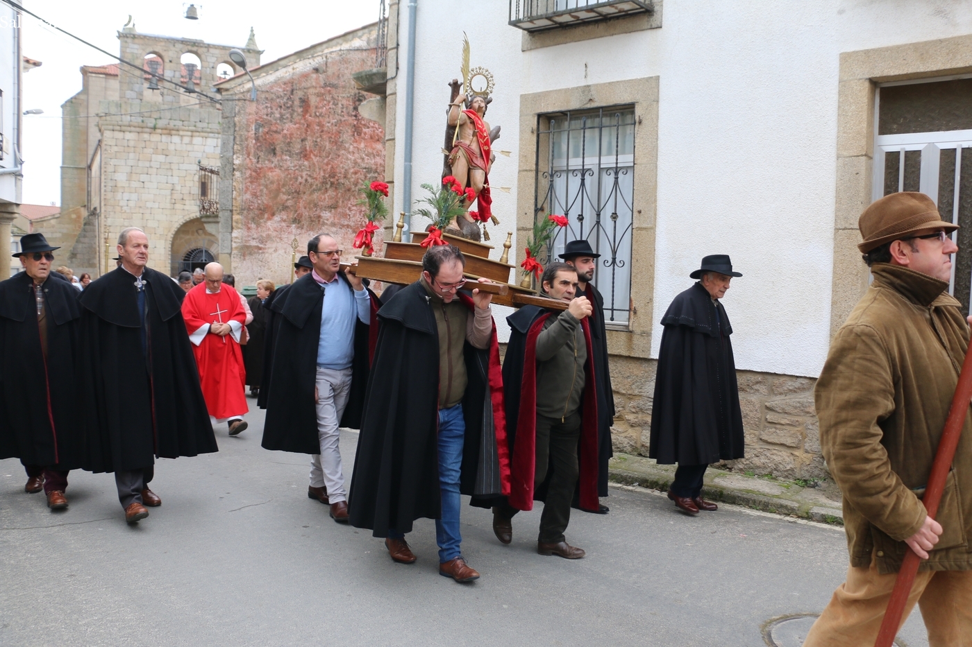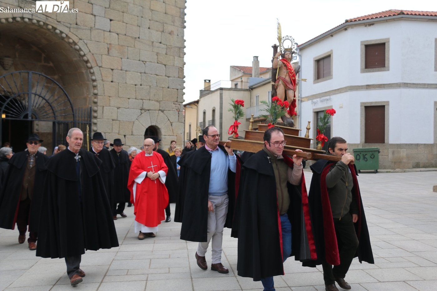 Los actos centrales han comenzado pasadas las 12:00 horas. Antes de la celebración eucarística, la comitiva ha acompañado a la imagen del Santo en procesión por las calles de Villavieja de Yeltes. El recorrido ha estado encabezado por los mayordomos de este último año, Francisco Hernández Hernández y Antonio García Paulos, quienes han portado las varas de mando.