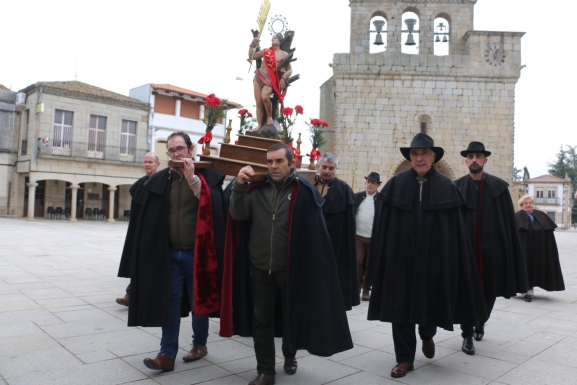 Los actos centrales han comenzado pasadas las 12:00 horas. Antes de la celebración eucarística, la comitiva ha acompañado a la imagen del Santo en procesión por las calles de Villavieja de Yeltes. El recorrido ha estado encabezado por los mayordomos de este último año, Francisco Hernández Hernández y Antonio García Paulos, quienes han portado las varas de mando.