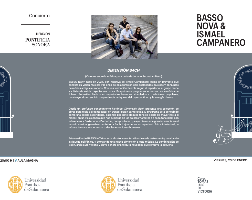 La actividad cultural regresa a la institución académica con el inicio de la II Edición de 'Pontificia Sonora'. El ciclo musical arranca mañana, viernes 23 de enero, con un concierto inaugural que correrá a cargo de la agrupación Basso Nova & Ismael Campanero.