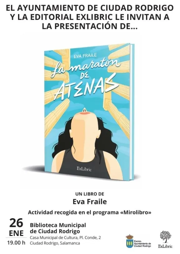 El lunes, 26 de enero, en la Biblioteca Municipal de Ciudad Rodrigo acogerá la presentación del libro La maratón de Atenas, de la autora mirobrigense Eva Fraile, a partir de las 19:00 horas. El acto está organizado por el Ayuntamiento de Ciudad Rodrigo dentro del programa municipal “Mirolibro”.
