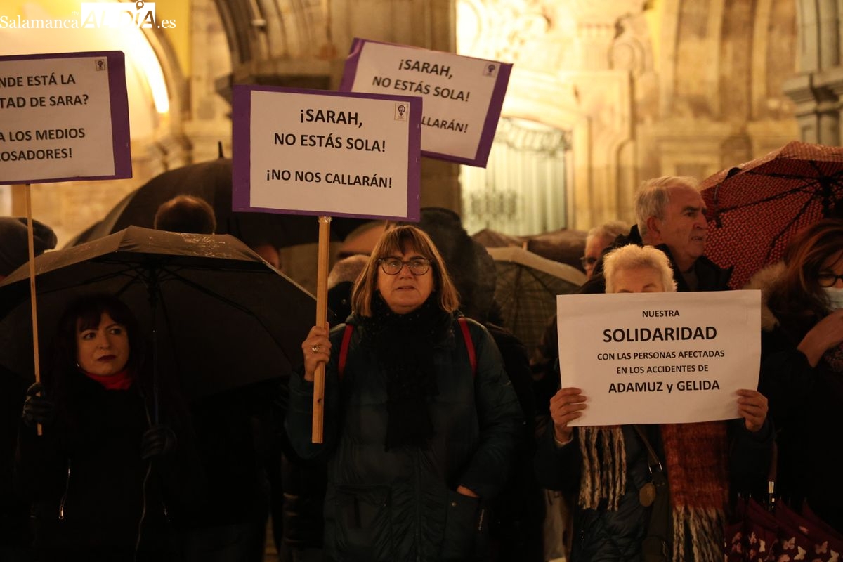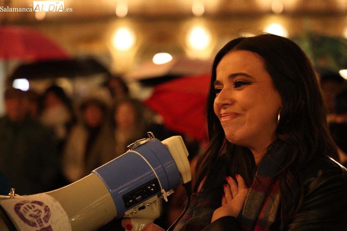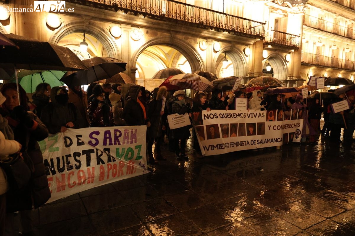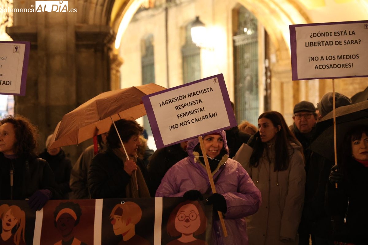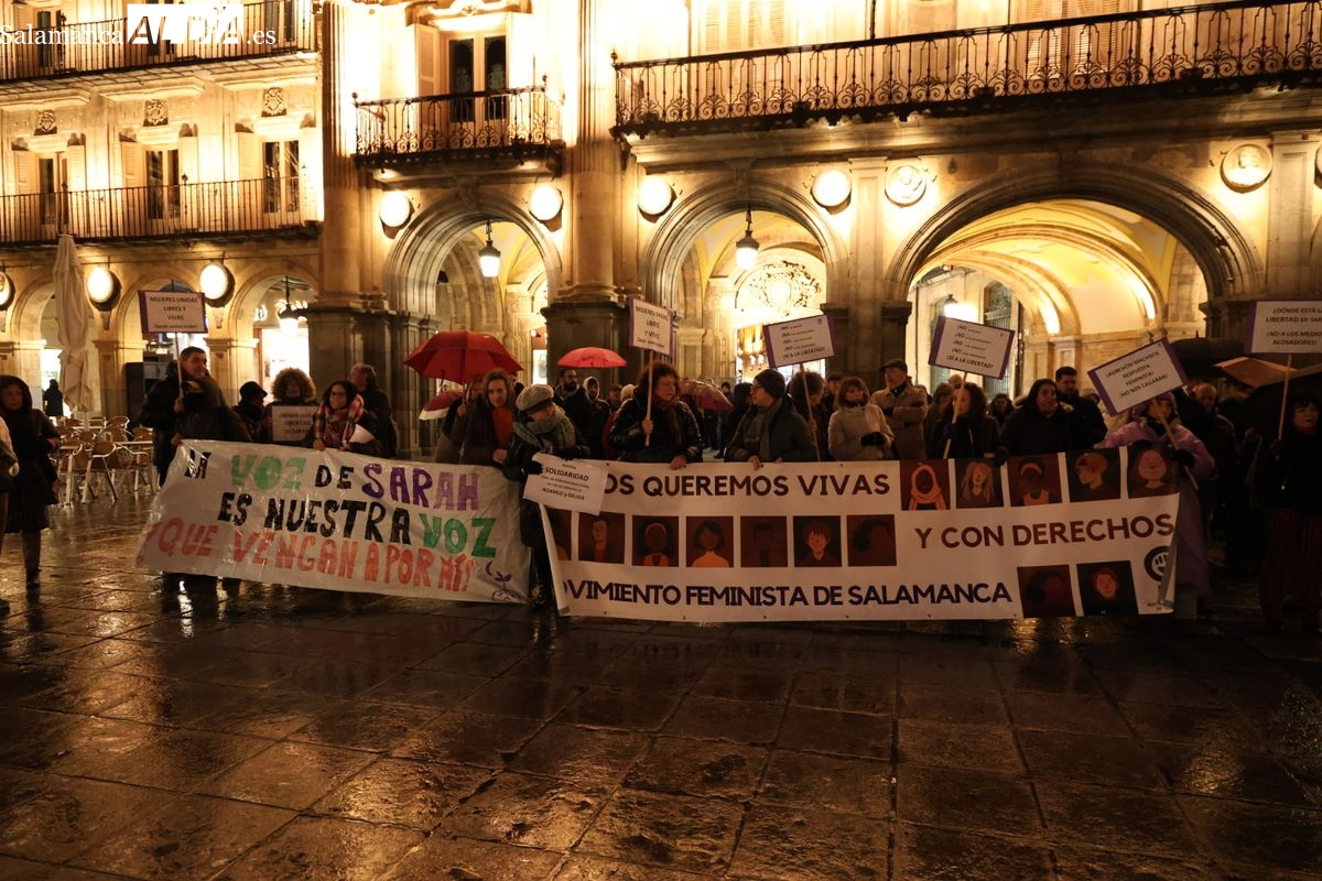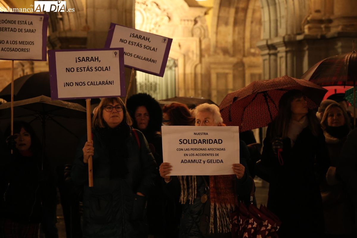 Ni las amenazas de muerte recibidas en los últimos días ni la lluvia, que ha caído con intensidad durante la tarde de este jueves en Salamanca, han logrado silenciar la respuesta. En un giro que ha dotado al acto de una carga emotiva especial, la propia Sarah Pérez Santaolalla ha acudido a la Plaza Mayor para participar en la concentración convocada en su apoyo por el Movimiento Feminista de Salamanca.