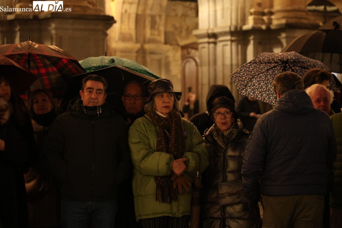La presencia de la analista y comunicadora no estaba anunciada en la convocatoria oficial, seguramente por motivos de seguridad tras la escalada de hostigamiento que ha sufrido recientemente. Sin embargo, Santaolalla ha decidido dar un paso al frente y, visiblemente emocionada, ha tomado la palabra para dirigirse a las personas que se resguardaban bajo los paraguas en el ágora salmantina.