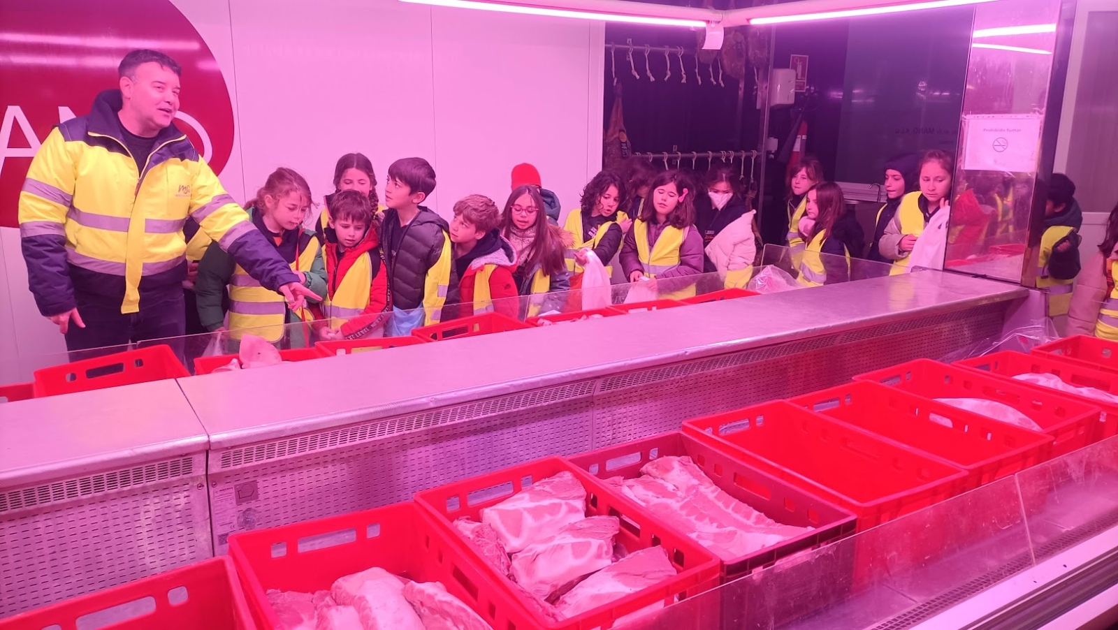 El itinerario continuó por los pabellones de productos frescos. En la sección de carnes, los alumnos comprobaron cuál es la cadena de procesamiento, desde la llegada del producto procedente del matadero hasta su adquisición por parte de los mayoristas para su posterior venta. Asimismo, recorrieron las instalaciones donde se almacenan los productos, aprendiendo sobre la necesidad de mantener una temperatura idónea para la conservación de cada alimento.