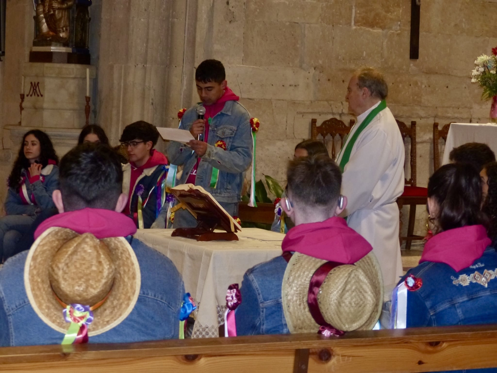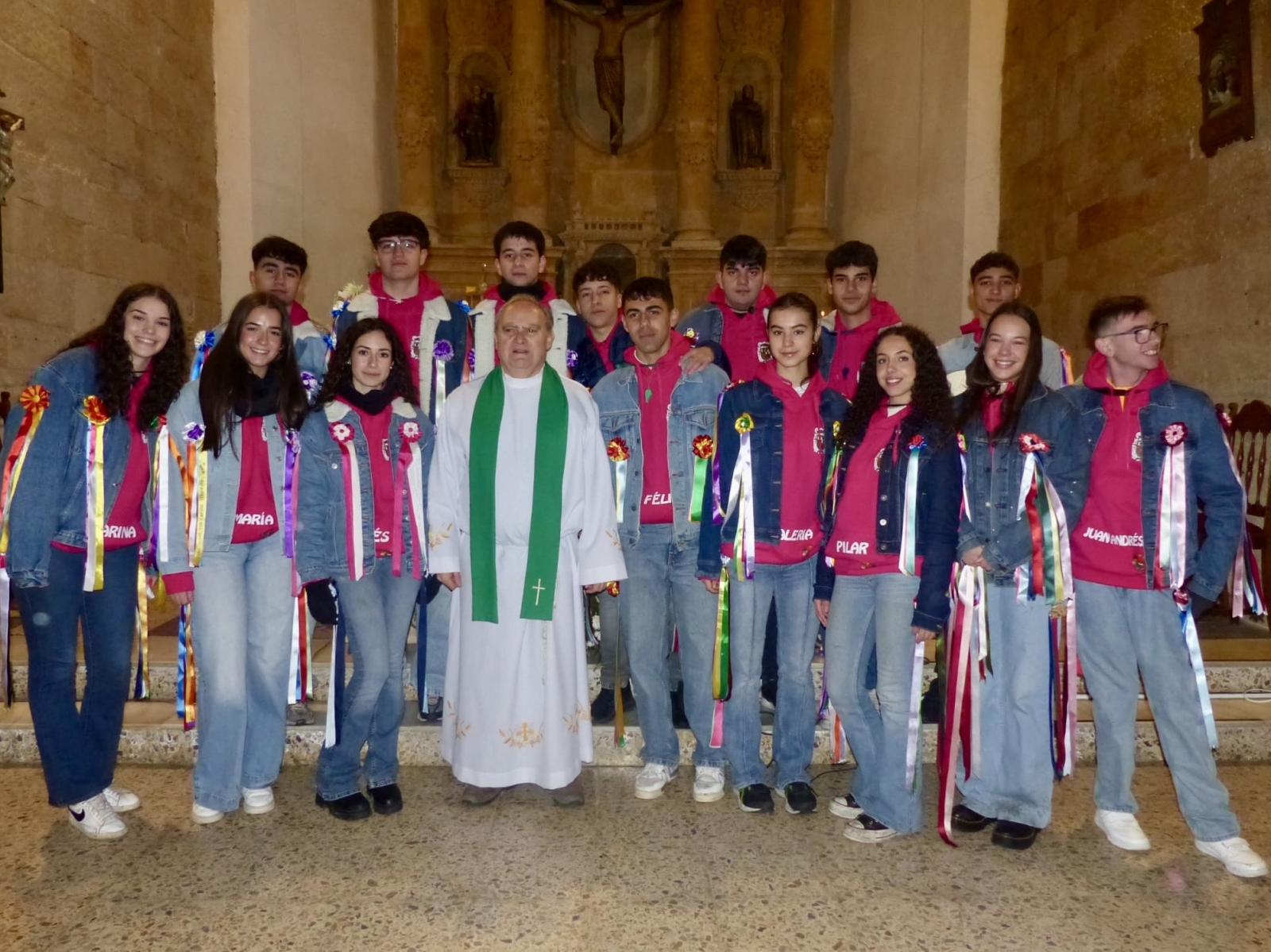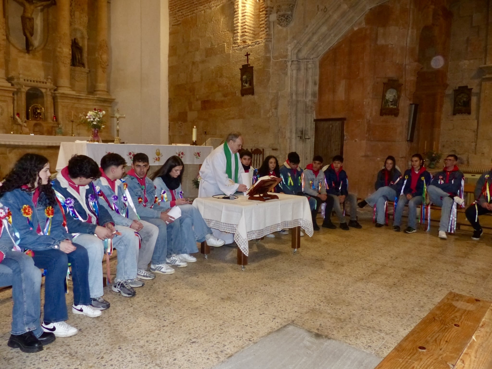 Una intensa jornada que arrancaba de manera oficial a las doce y media de la mañana, en la iglesia parroquial, donde tenía lugar la solemne eucaristía en honor a los Quintos, acto al que además de los protagonistas y sus familias, se sumaban numerosos villorejos.