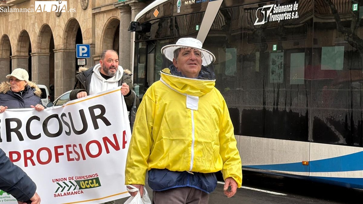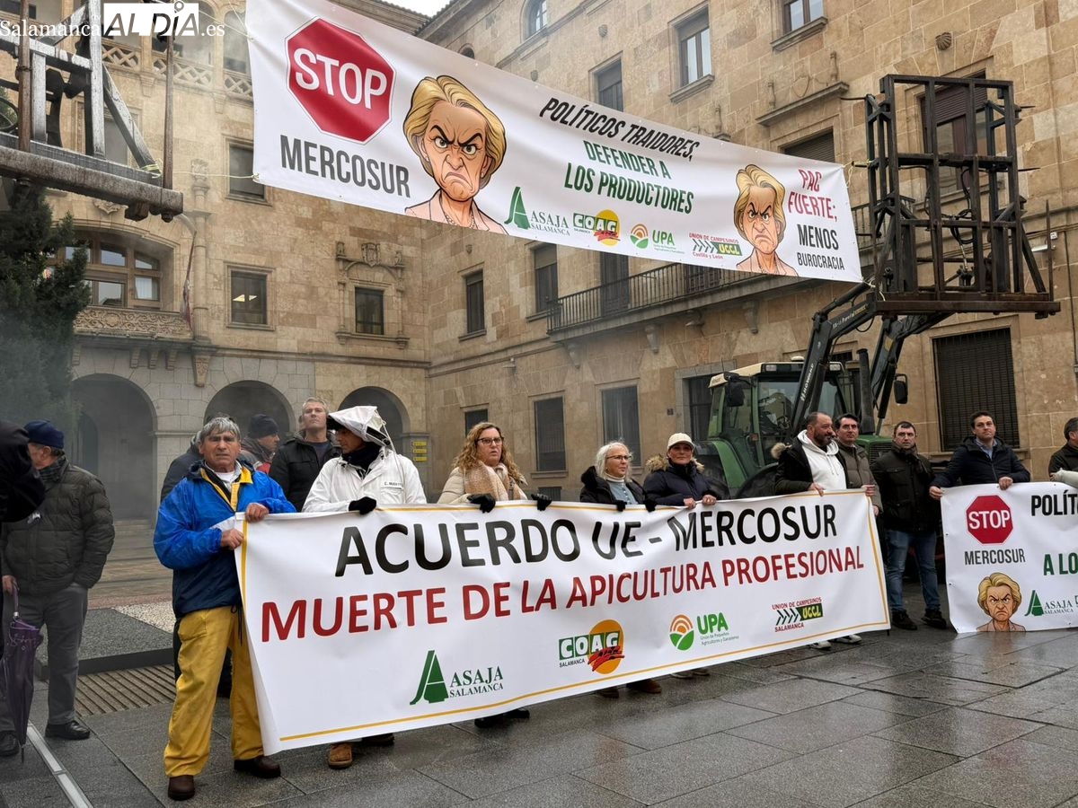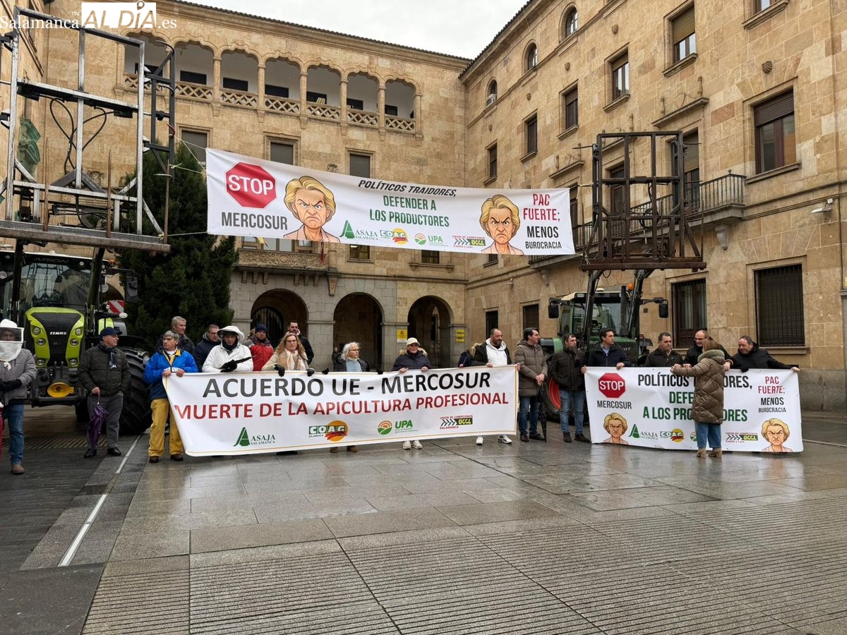 El sector apícola profesional tomaba las calles de Salamanca este lunes, 26 de enero, en una jornada reivindicativa marcada por la unidad de acción. Las organizaciones profesionales agrarias Asaja, UPA, COAG y UCCL se han movilizado frente a la Subdelegación del Gobierno y han repartido miel a la ciudadanía, con el objetivo de visibilizar la amenaza que supone el acuerdo comercial entre la Unión Europea y Mercosur.