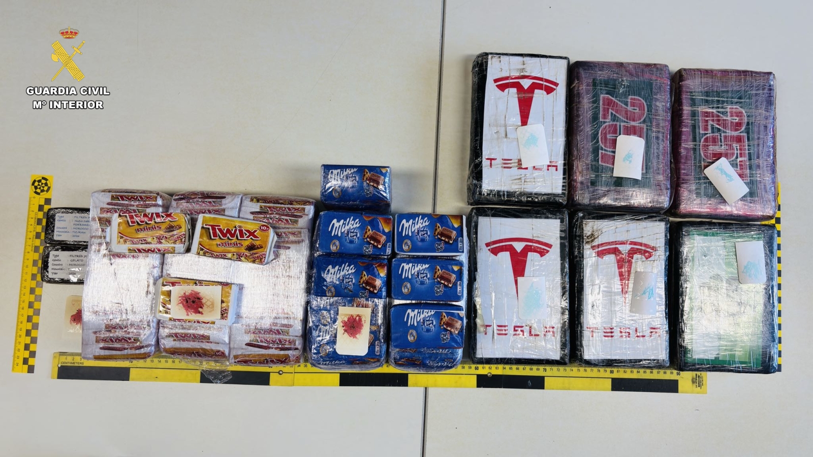 El pesaje final de la sustancia estupefaciente arrojó cifras contundentes: se hallaron 6 paquetes de cocaína con un peso total de 6,698 kilogramos y 126 paquetes de hachís que sumaban 13,12 kilogramos. Tal y como se aprecia en el material gráfico de la operación, algunos de los paquetes de droga presentaban logotipos de marcas de automóviles, como Tesla, mientras que otros estaban camuflados simulando ser dulces y chocolatinas de marcas comerciales conocidas, como Twix o Milka.