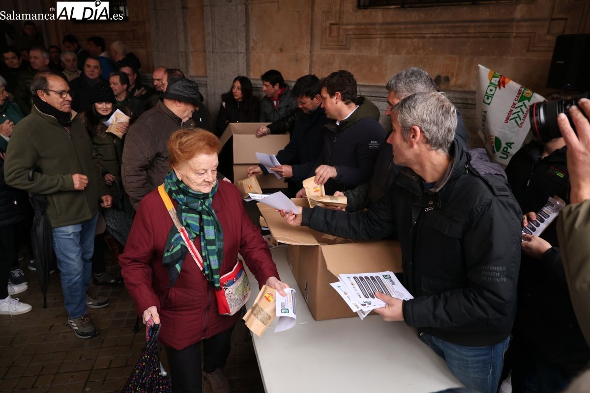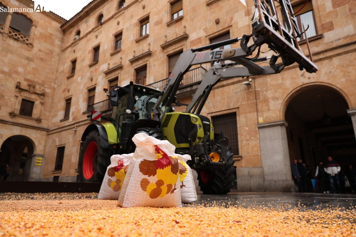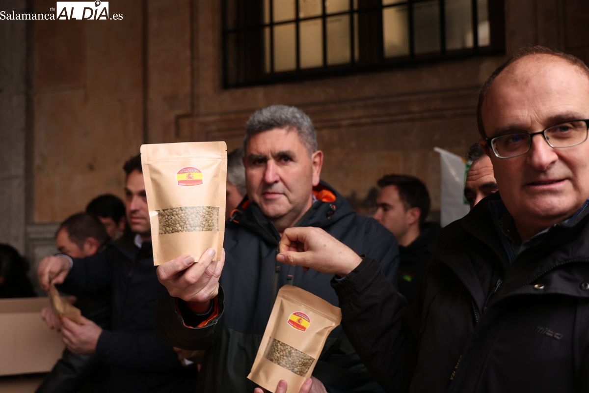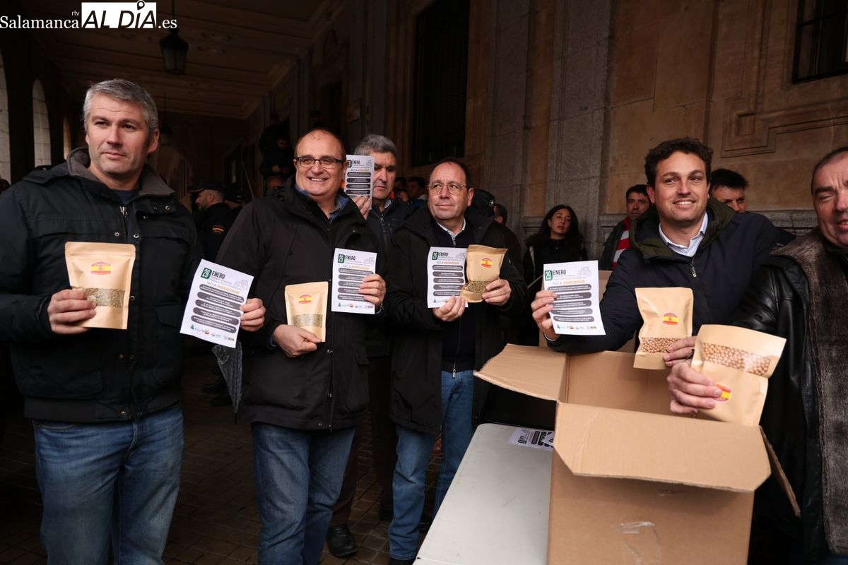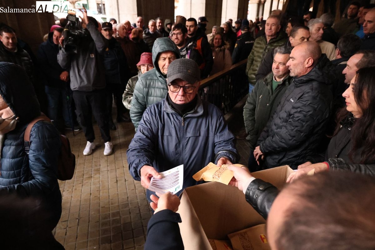Las organizaciones profesionales agrarias (OPAs) de Salamanca han continuado este martes con su semana de movilizaciones en defensa del sector primario. En un acto cargado de simbolismo frente a la Subdelegación del Gobierno, los representantes del campo han repartido saquitos de legumbres a los viandantes y han arrojado cereal al suelo para visibilizar la "ruina" que atraviesa el sector.