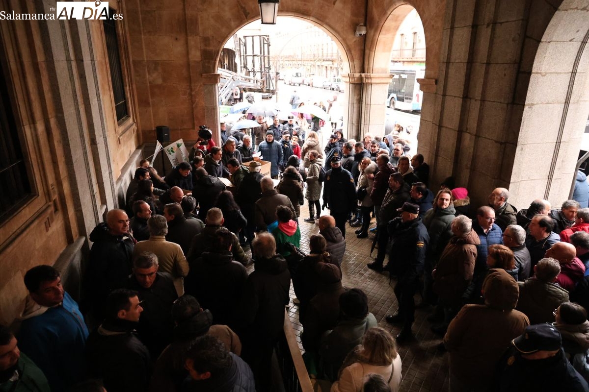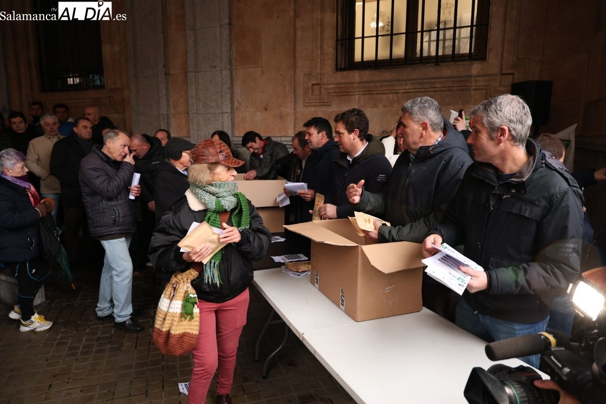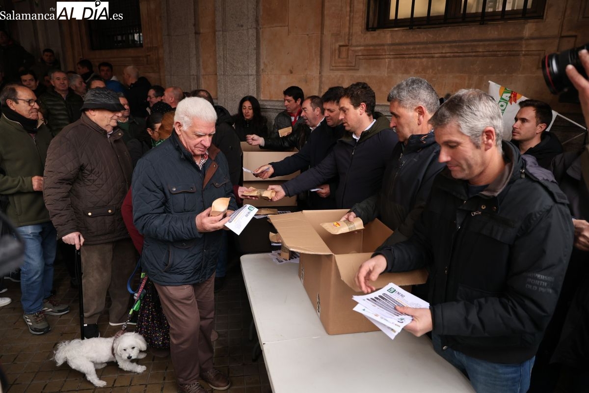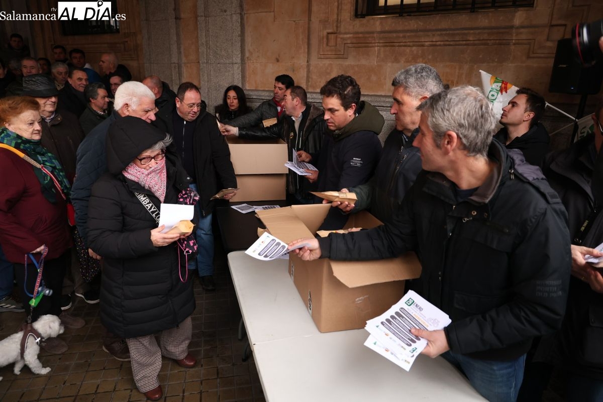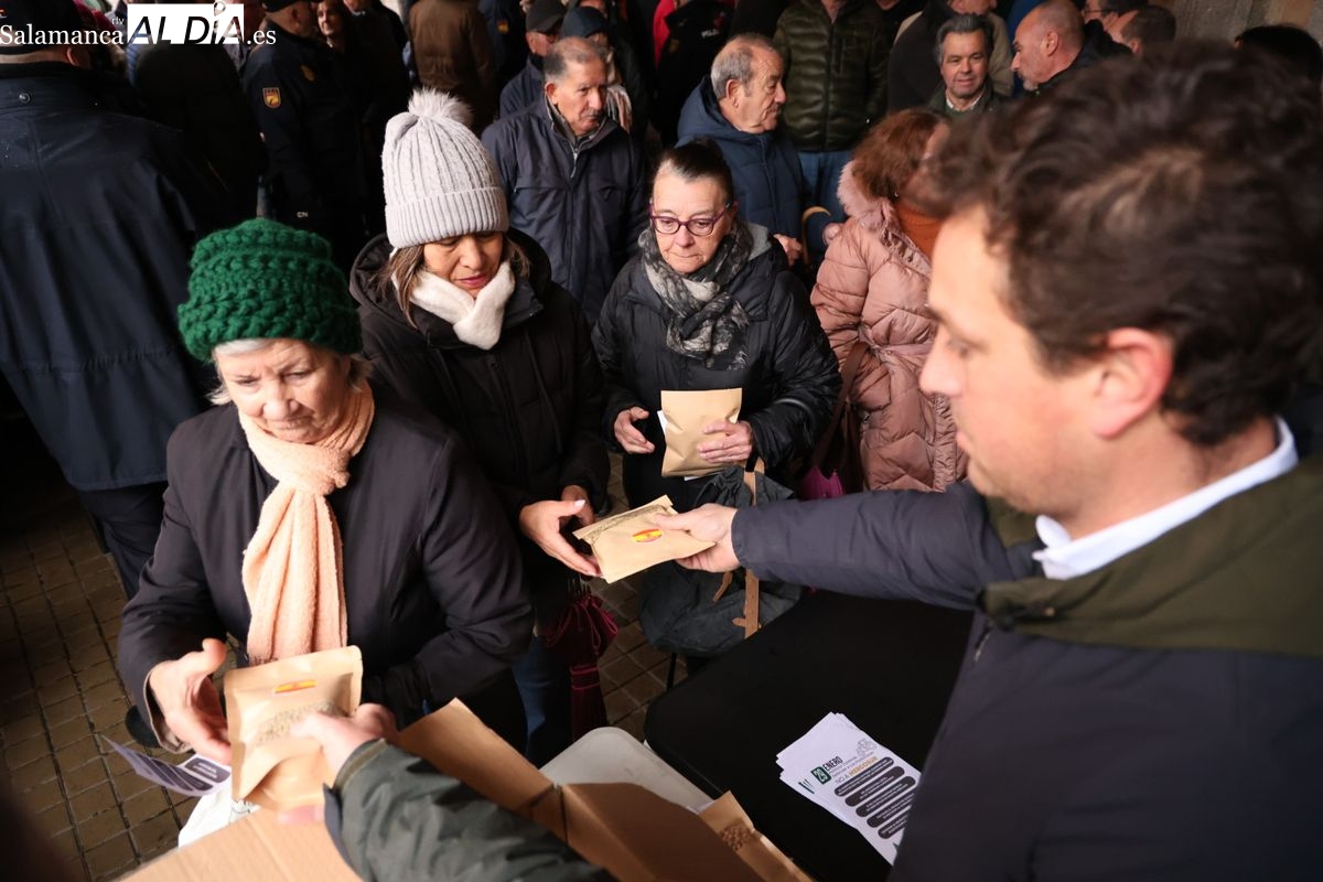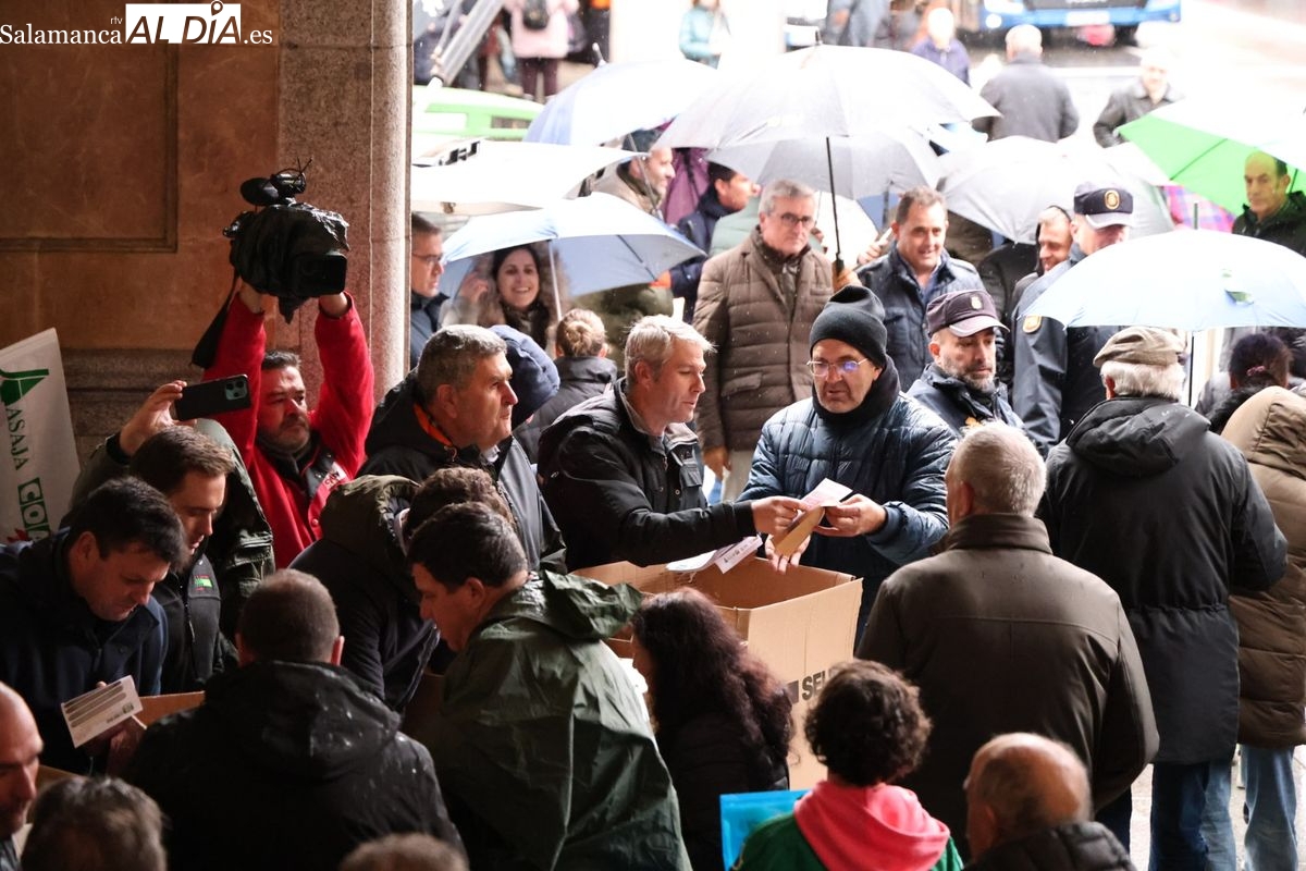 Las organizaciones profesionales agrarias (OPAs) de Salamanca han continuado este martes con su semana de movilizaciones en defensa del sector primario. En un acto cargado de simbolismo frente a la Subdelegación del Gobierno, los representantes del campo han repartido saquitos de legumbres a los viandantes y han arrojado cereal al suelo para visibilizar la "ruina" que atraviesa el sector.