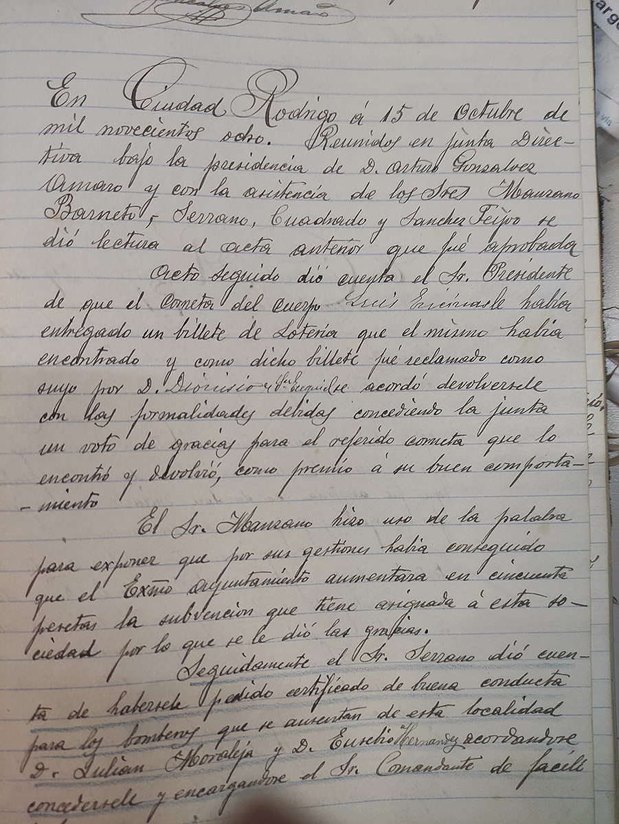 La Asociación Humanitaria de Bomberos Voluntarios de Ciudad Rodrigo ha recuperado una pieza fundamental de su patrimonio histórico: su primer libro de actas. El documento, que se inicia el 11 de febrero de 1900, ha sido localizado y entregado a la entidad tras más de tres décadas de búsqueda, poniendo fin a un largo anhelo de la institución.