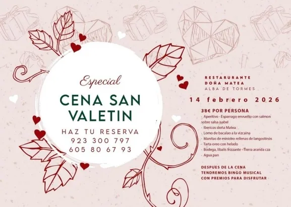 Las personas interesadas en asistir a esta cena especial de San Valentín ya pueden realizar su reserva. Los teléfonos de contacto facilitados por el Restaurante Doña Matea son el 923 300 797 y el 605 80 67 93.