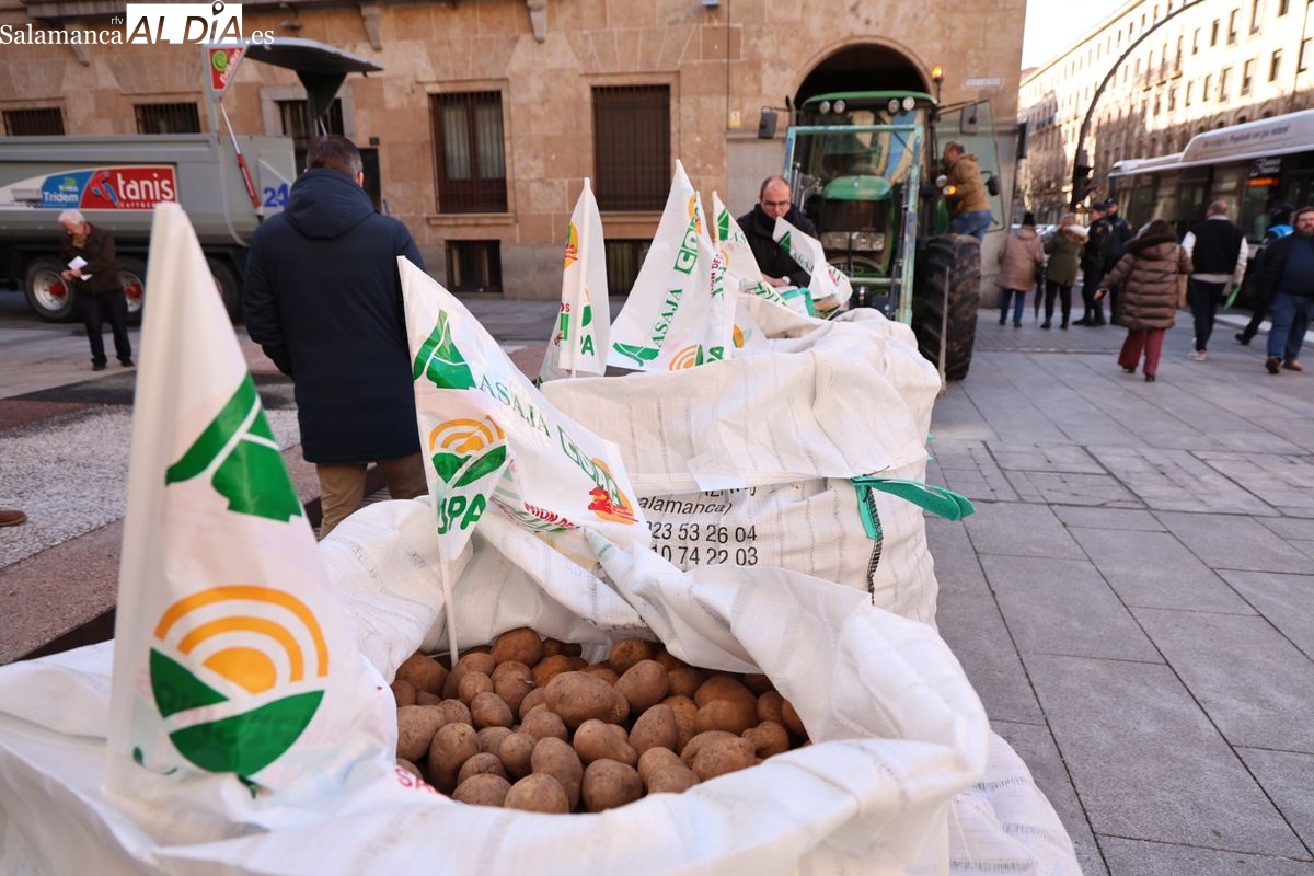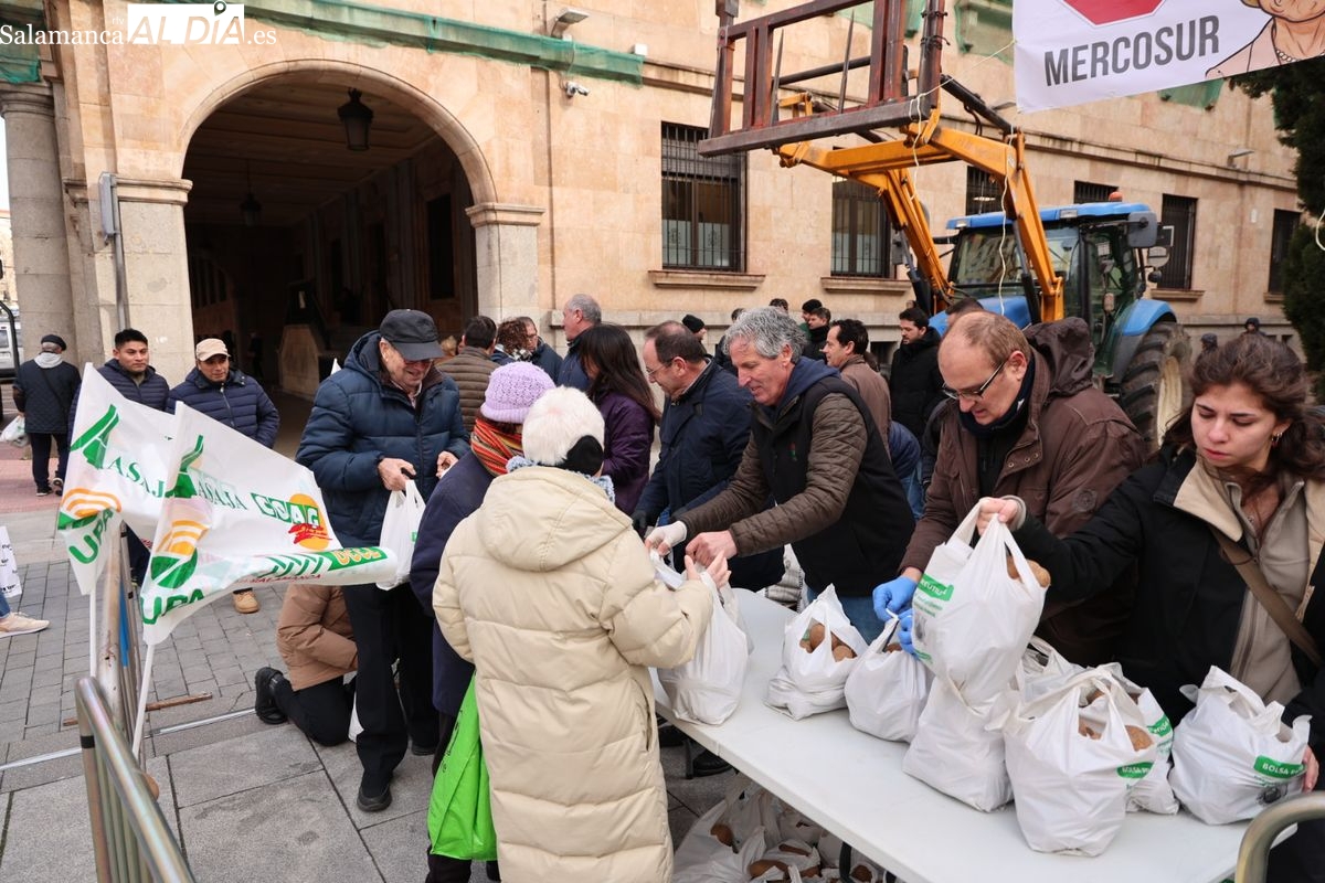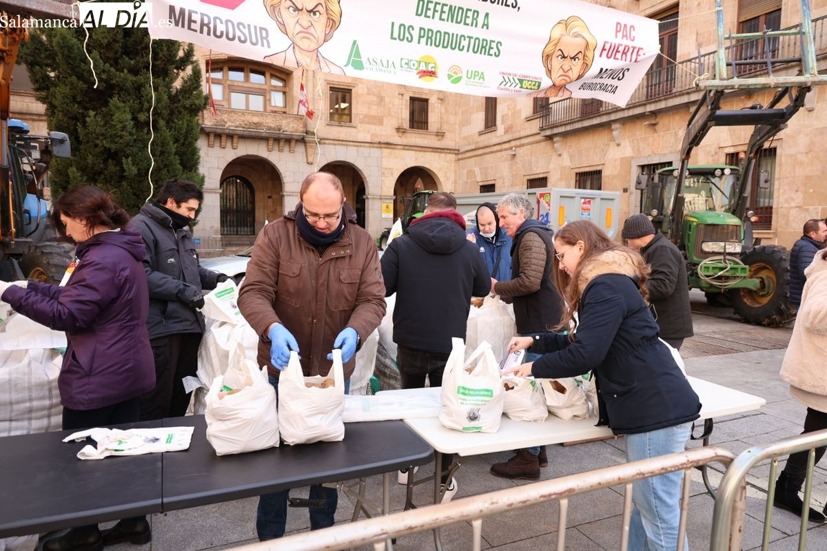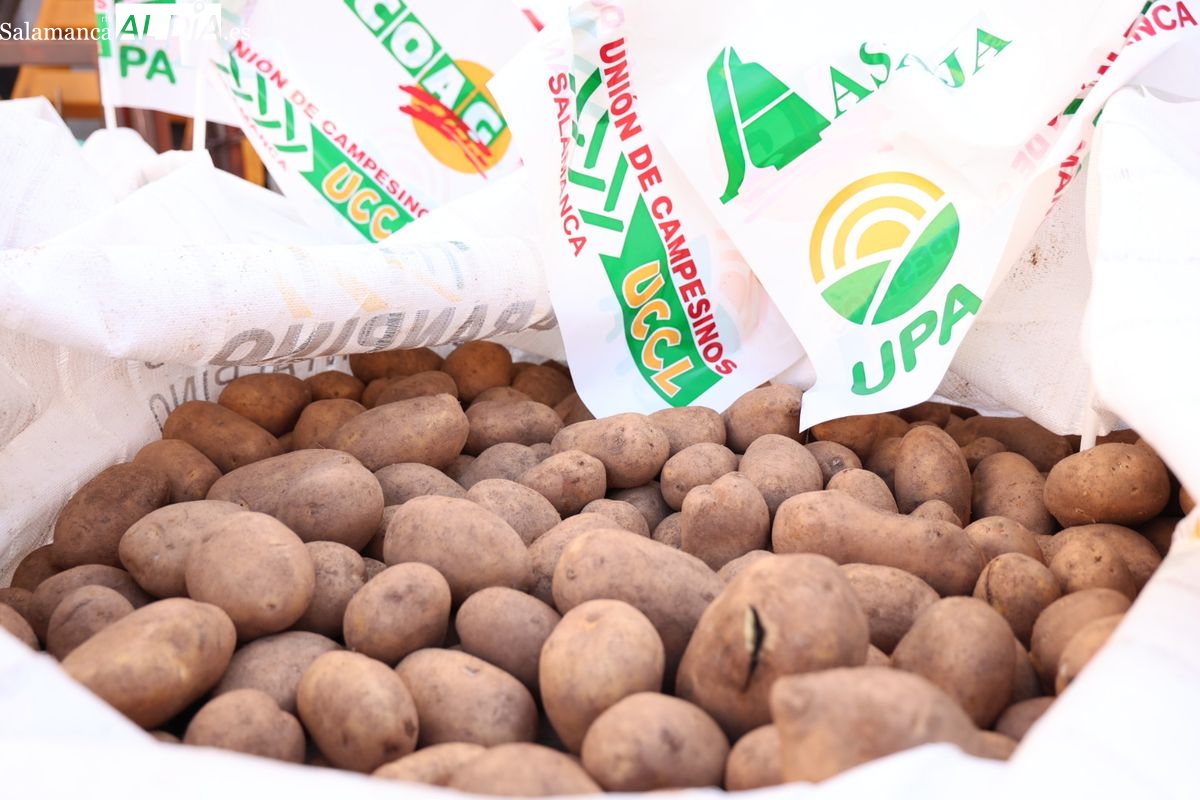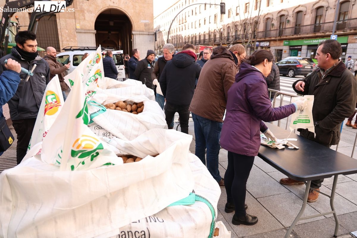 Por eso, se ha realizado junto a la Subdelegación del Gobierno, el reparto de cuatro toneladas de patatas, de manera gratuita, para reivindicar la calidad y defensa de los productos locales, frente a los citados acuerdos internacionales que ponen en peligro la agricultura y ganadería de Salamanca y del resto de España.