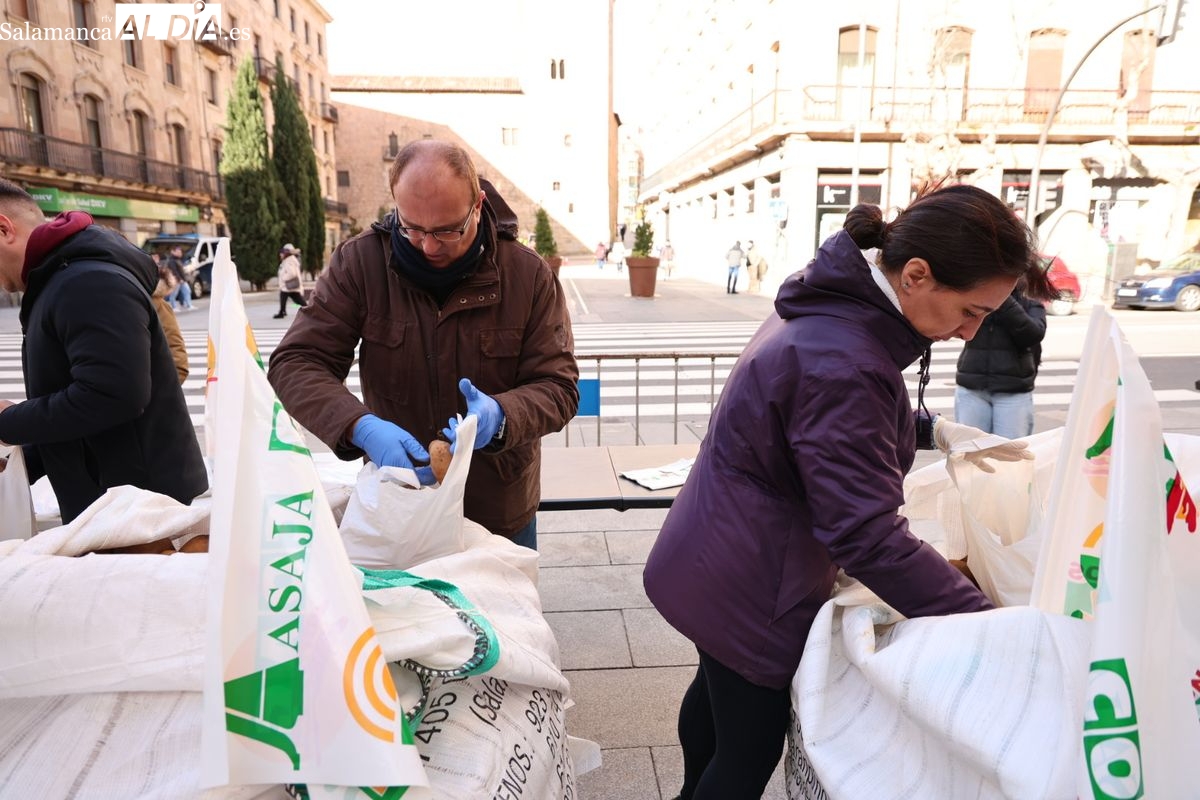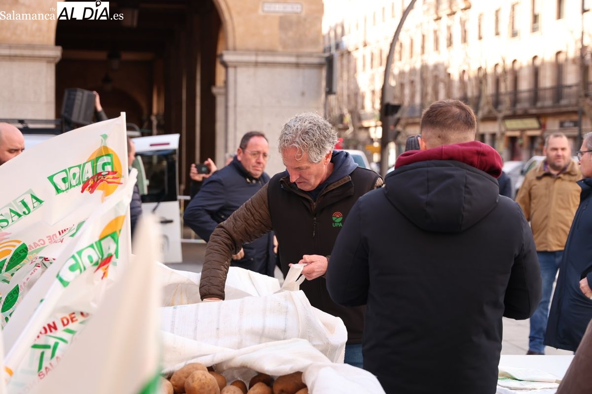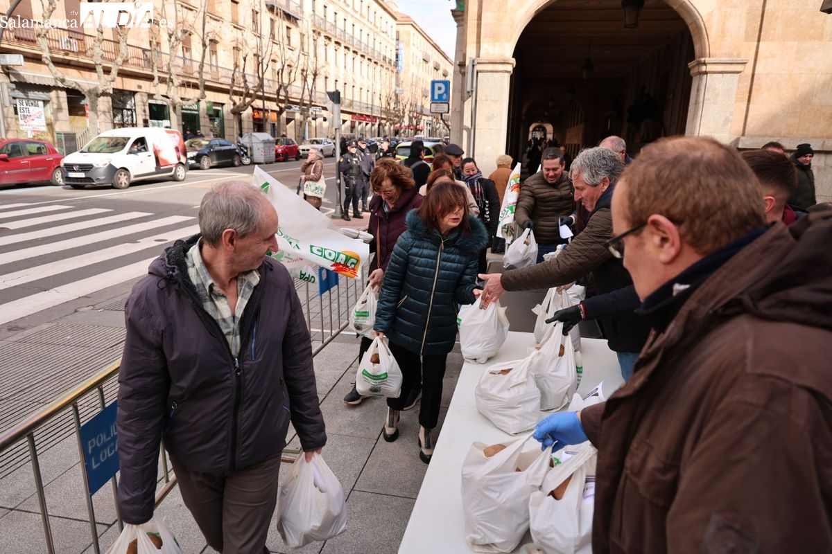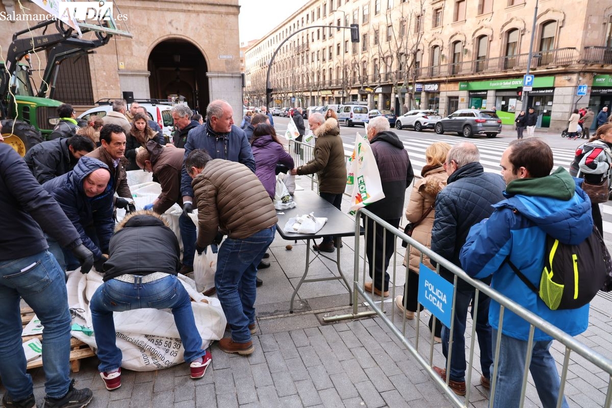 Por eso, se ha realizado junto a la Subdelegación del Gobierno, el reparto de cuatro toneladas de patatas, de manera gratuita, para reivindicar la calidad y defensa de los productos locales, frente a los citados acuerdos internacionales que ponen en peligro la agricultura y ganadería de Salamanca y del resto de España.
