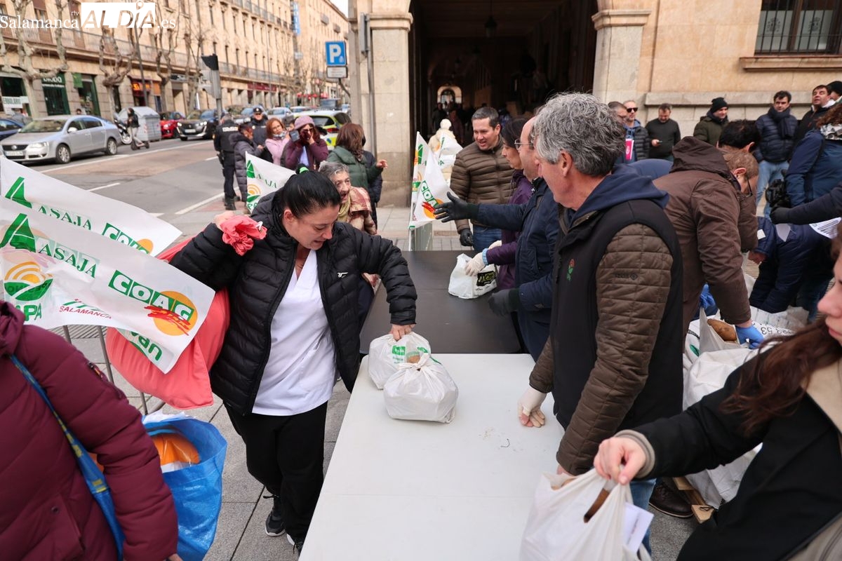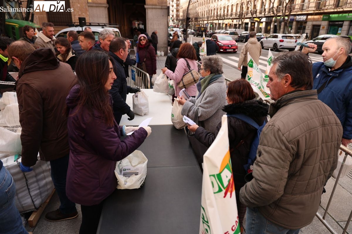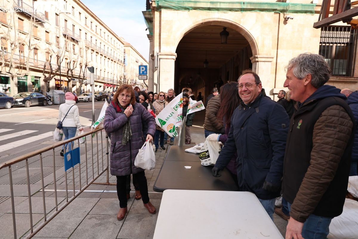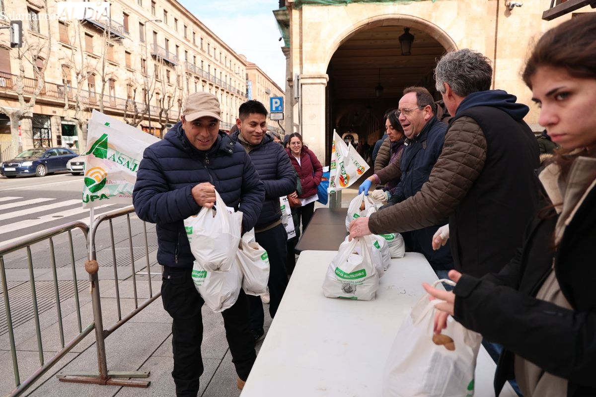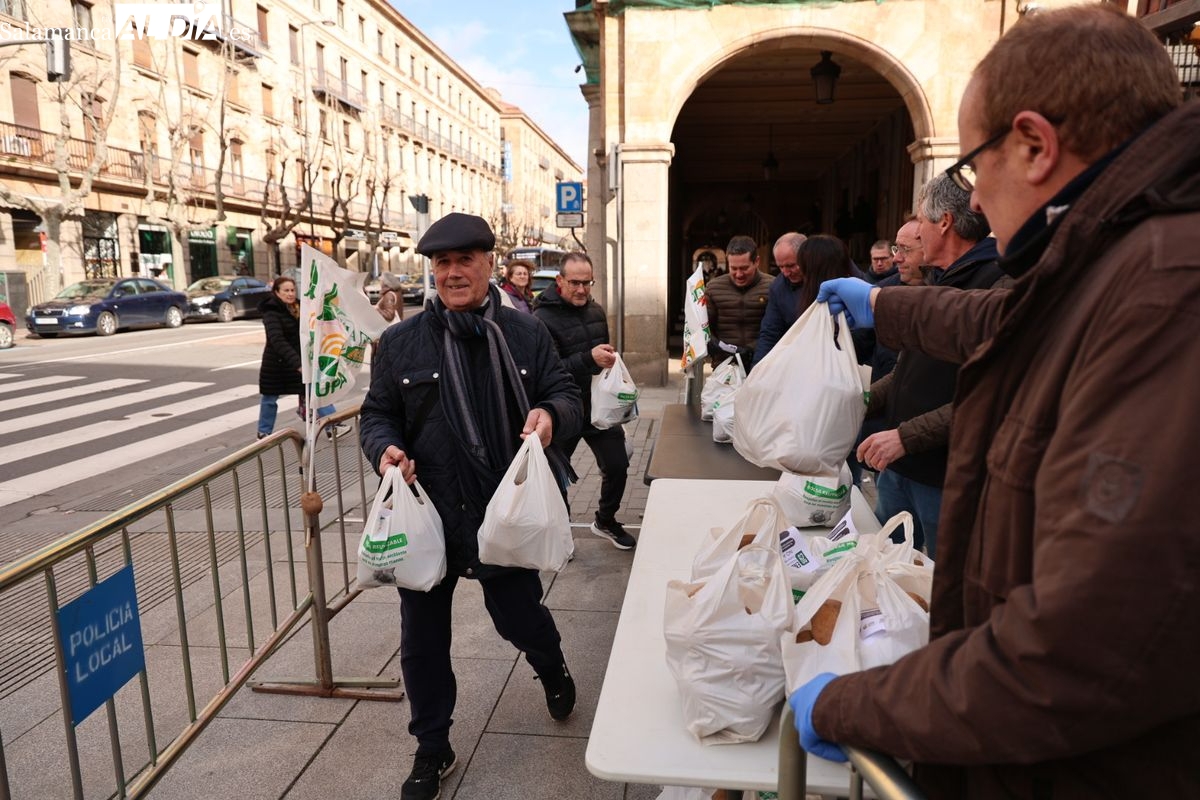 Por eso, se ha realizado junto a la Subdelegación del Gobierno, el reparto de cuatro toneladas de patatas, de manera gratuita, para reivindicar la calidad y defensa de los productos locales, frente a los citados acuerdos internacionales que ponen en peligro la agricultura y ganadería de Salamanca y del resto de España.