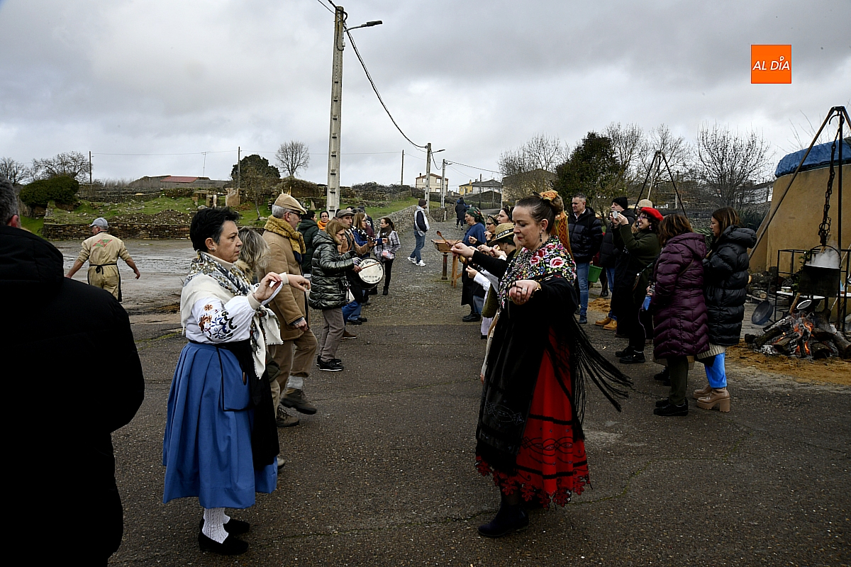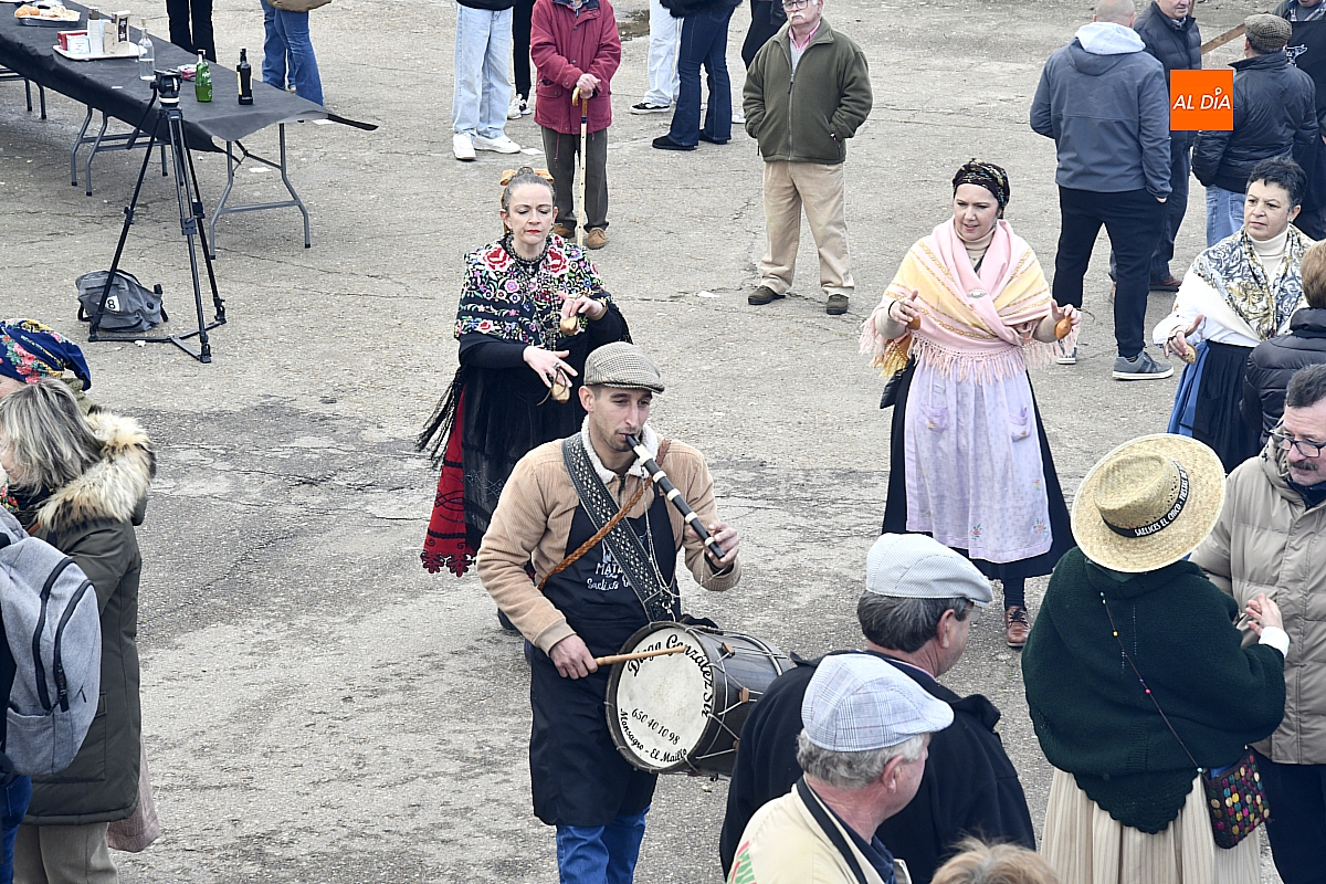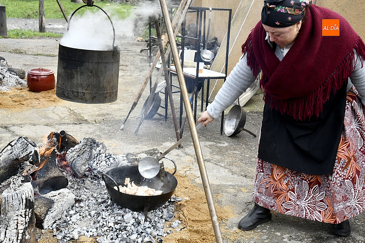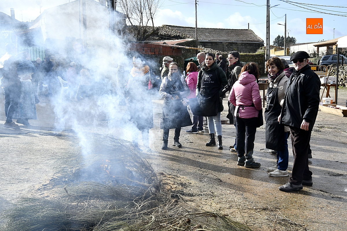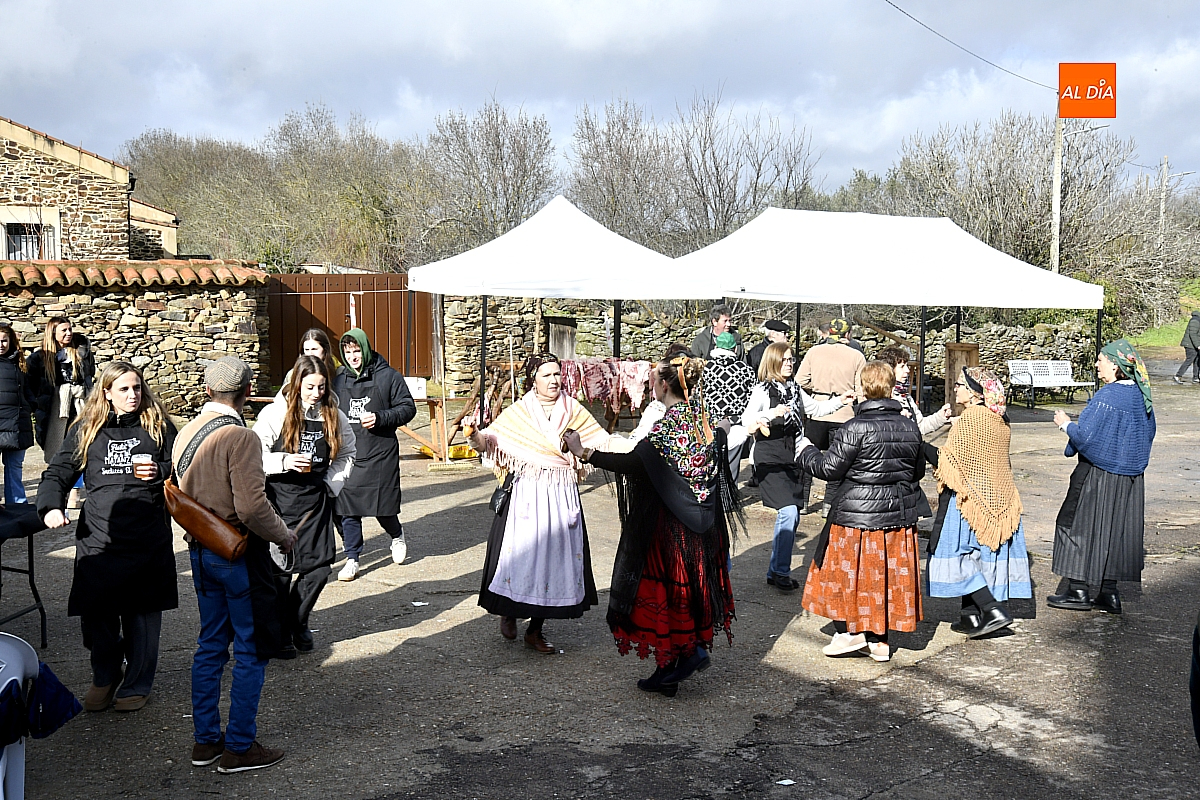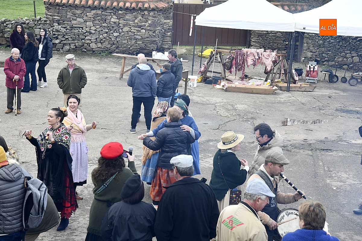 Al son de la gaita y el tamboril de Diego González, de Monsagro, hombres y mujeres ataviados con ropa de faena y trajes tradicionales animaban el ambiente entre bailes improvisados, el calor de la lumbre y el aroma inconfundible de las chichas recién separadas tras un meticuloso despiece del cerdo. La música, constante a lo largo del día, actuó como hilo conductor de una ceremonia que fue, al mismo tiempo, demostración práctica y acto festivo.
