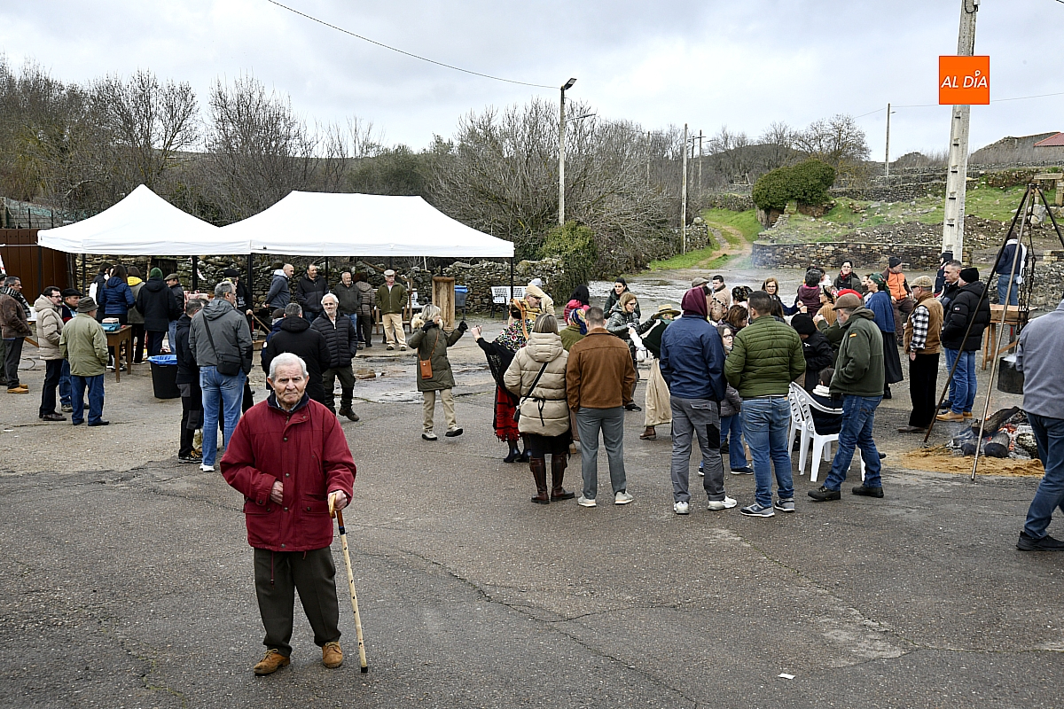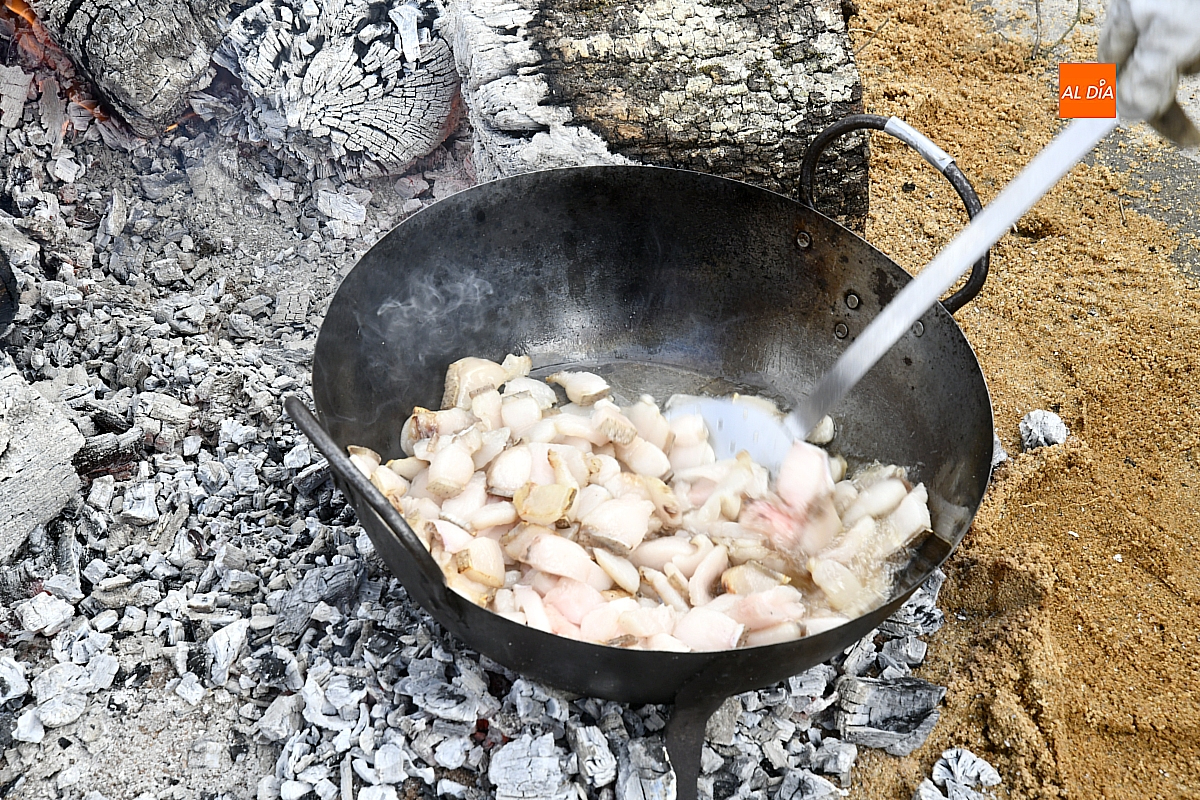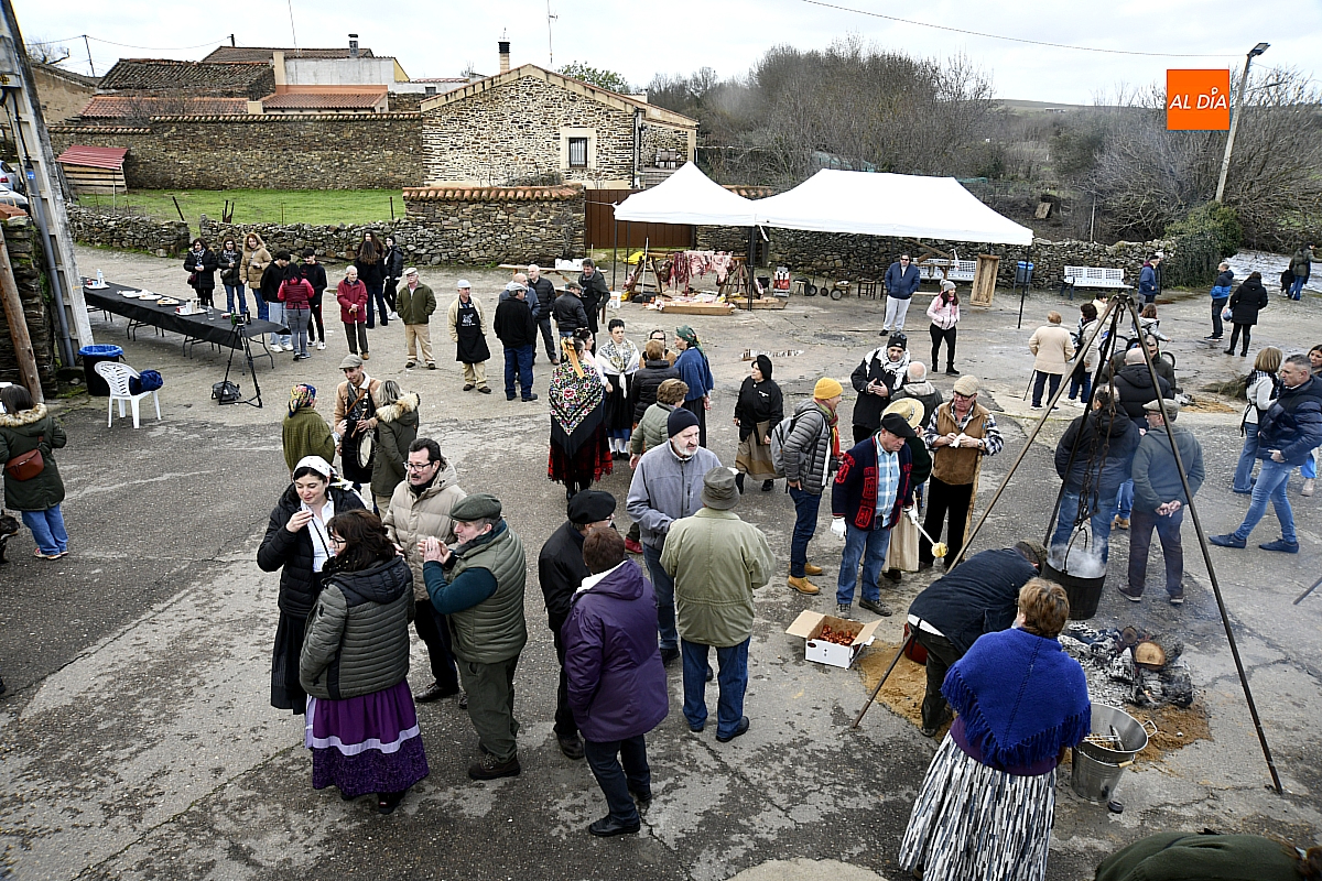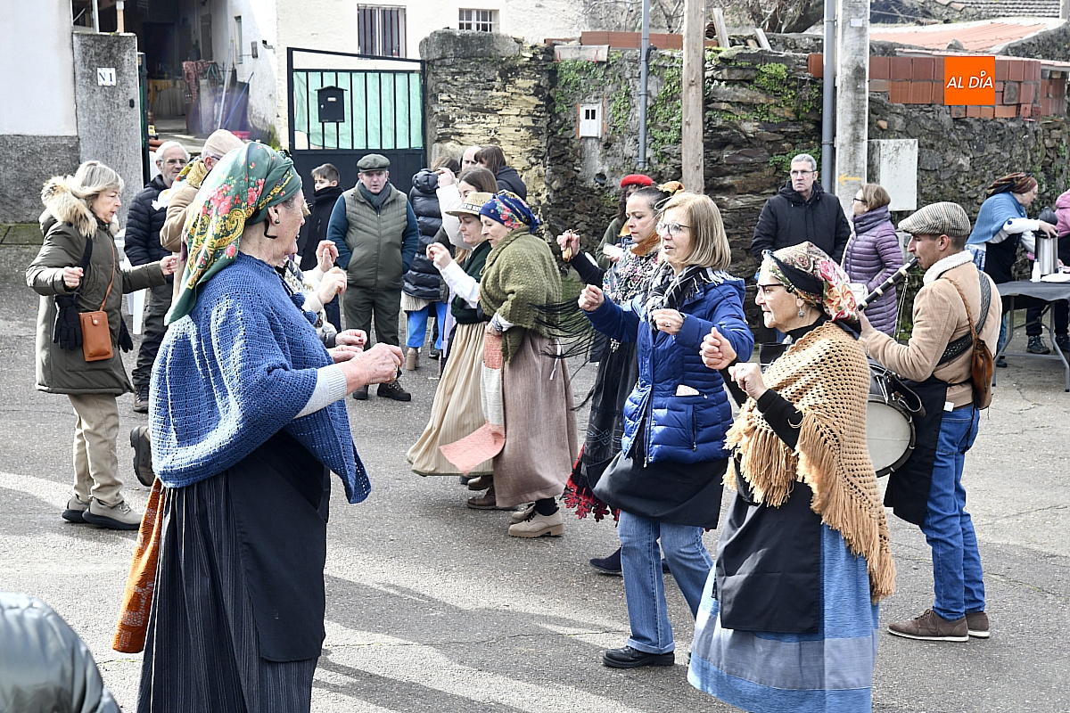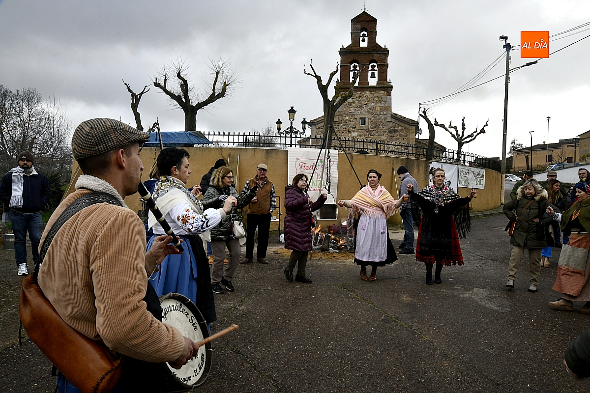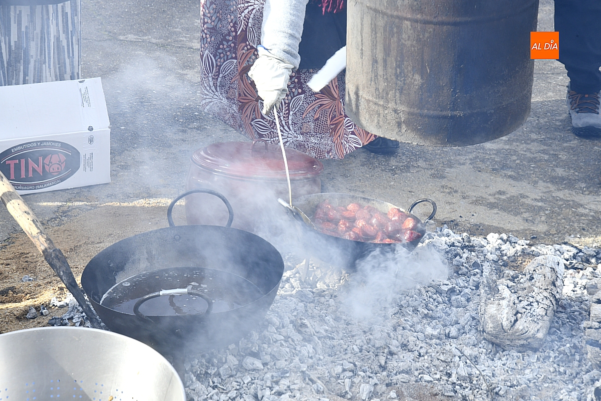 Al son de la gaita y el tamboril de Diego González, de Monsagro, hombres y mujeres ataviados con ropa de faena y trajes tradicionales animaban el ambiente entre bailes improvisados, el calor de la lumbre y el aroma inconfundible de las chichas recién separadas tras un meticuloso despiece del cerdo. La música, constante a lo largo del día, actuó como hilo conductor de una ceremonia que fue, al mismo tiempo, demostración práctica y acto festivo.