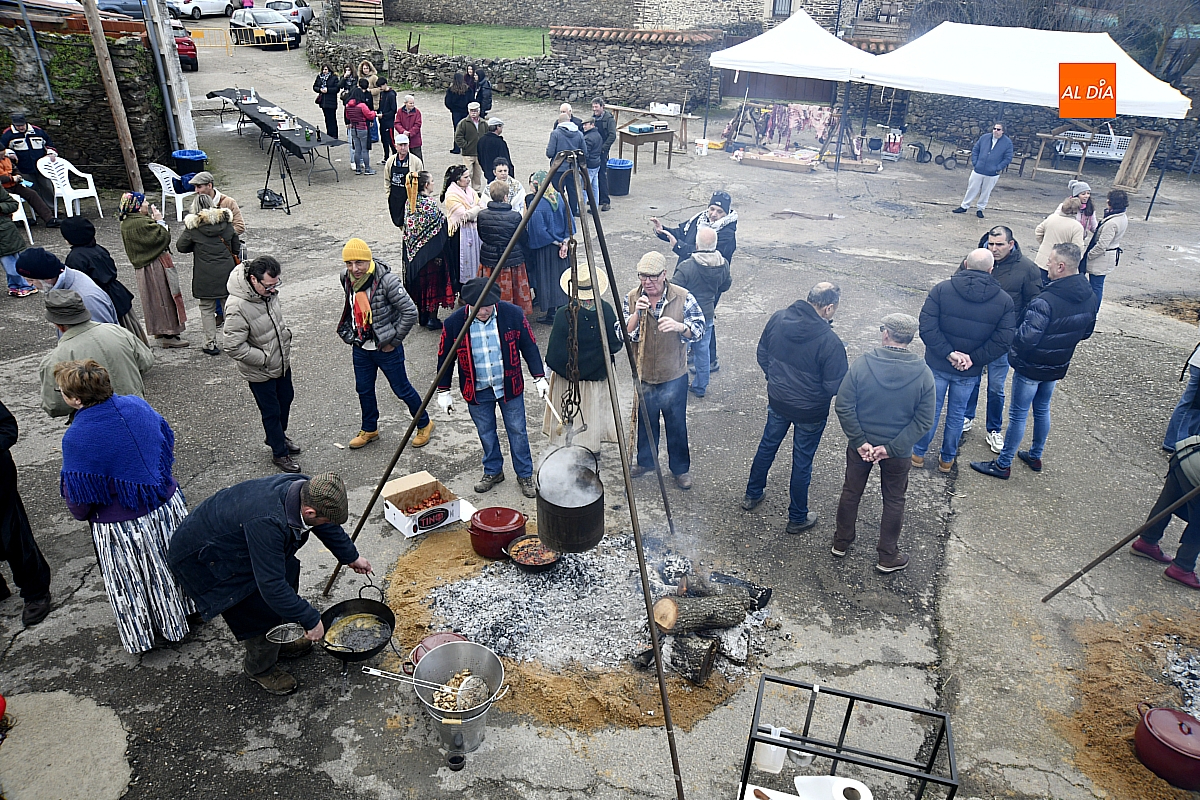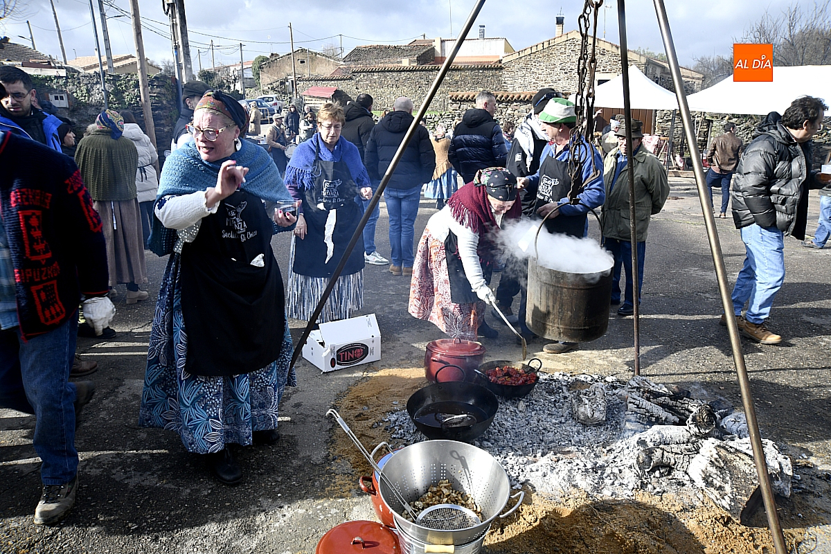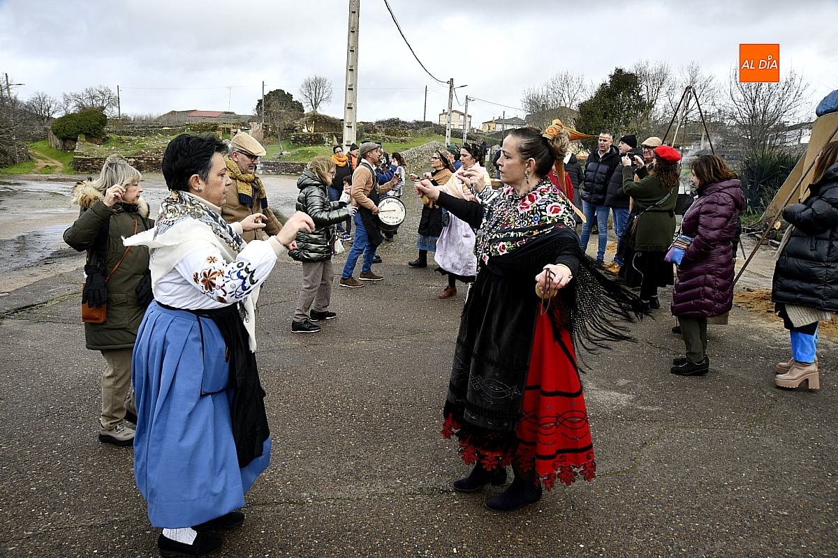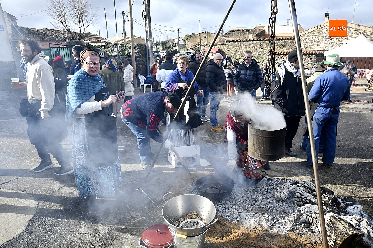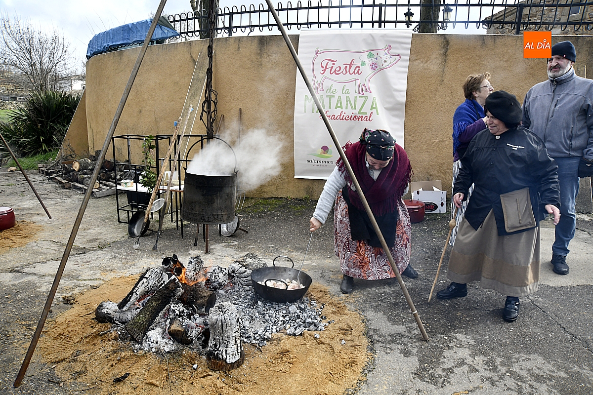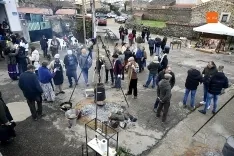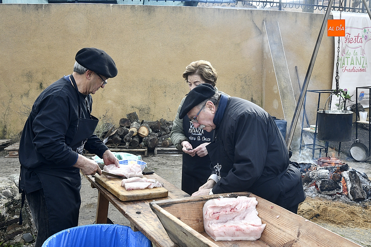 Al son de la gaita y el tamboril de Diego González, de Monsagro, hombres y mujeres ataviados con ropa de faena y trajes tradicionales animaban el ambiente entre bailes improvisados, el calor de la lumbre y el aroma inconfundible de las chichas recién separadas tras un meticuloso despiece del cerdo. La música, constante a lo largo del día, actuó como hilo conductor de una ceremonia que fue, al mismo tiempo, demostración práctica y acto festivo.
