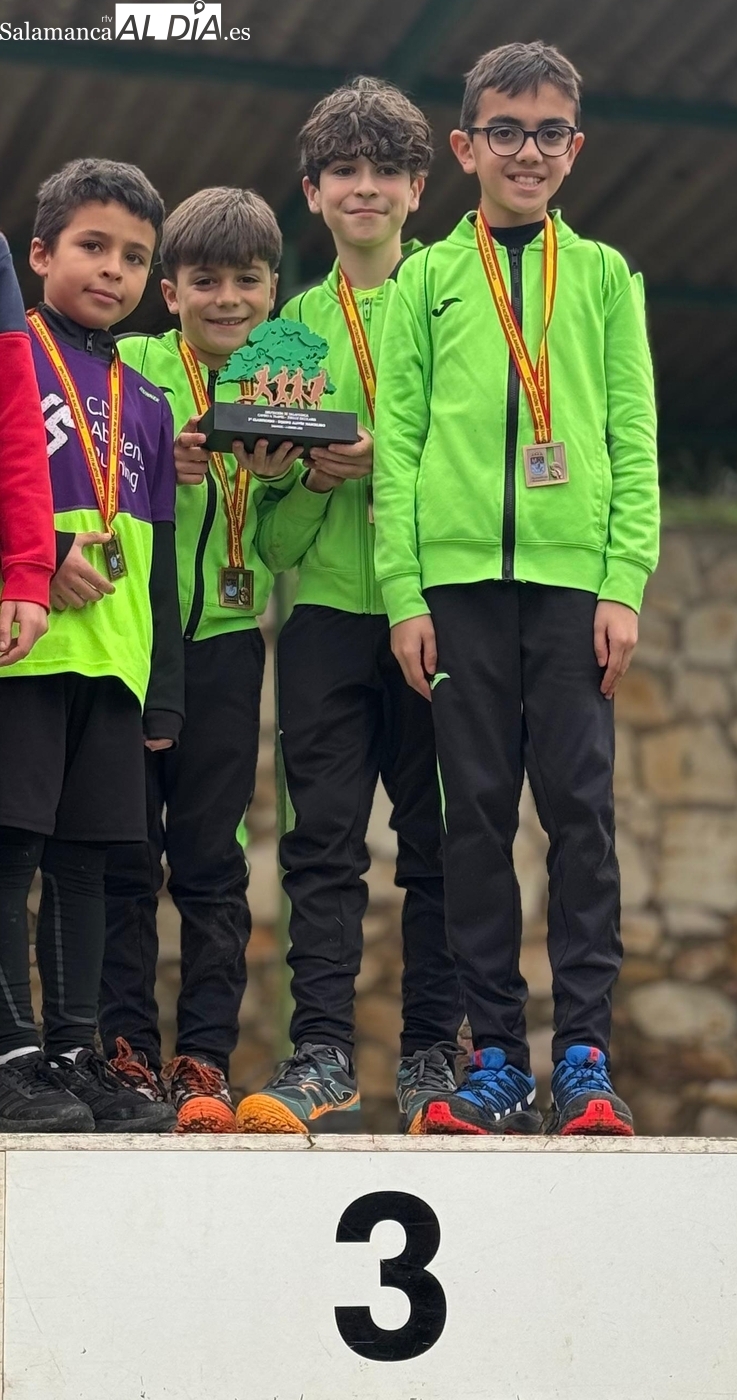Por su parte, el equipo alevín masculino, integrado únicamente por cuatro atletas —Daniel, Hugo, Mateo e Íñigo—, se hizo igualmente con el tercer puesto en su categoría. El esfuerzo colectivo de estos cuatro corredores resultó decisivo para alcanzar tan meritorio bronce.