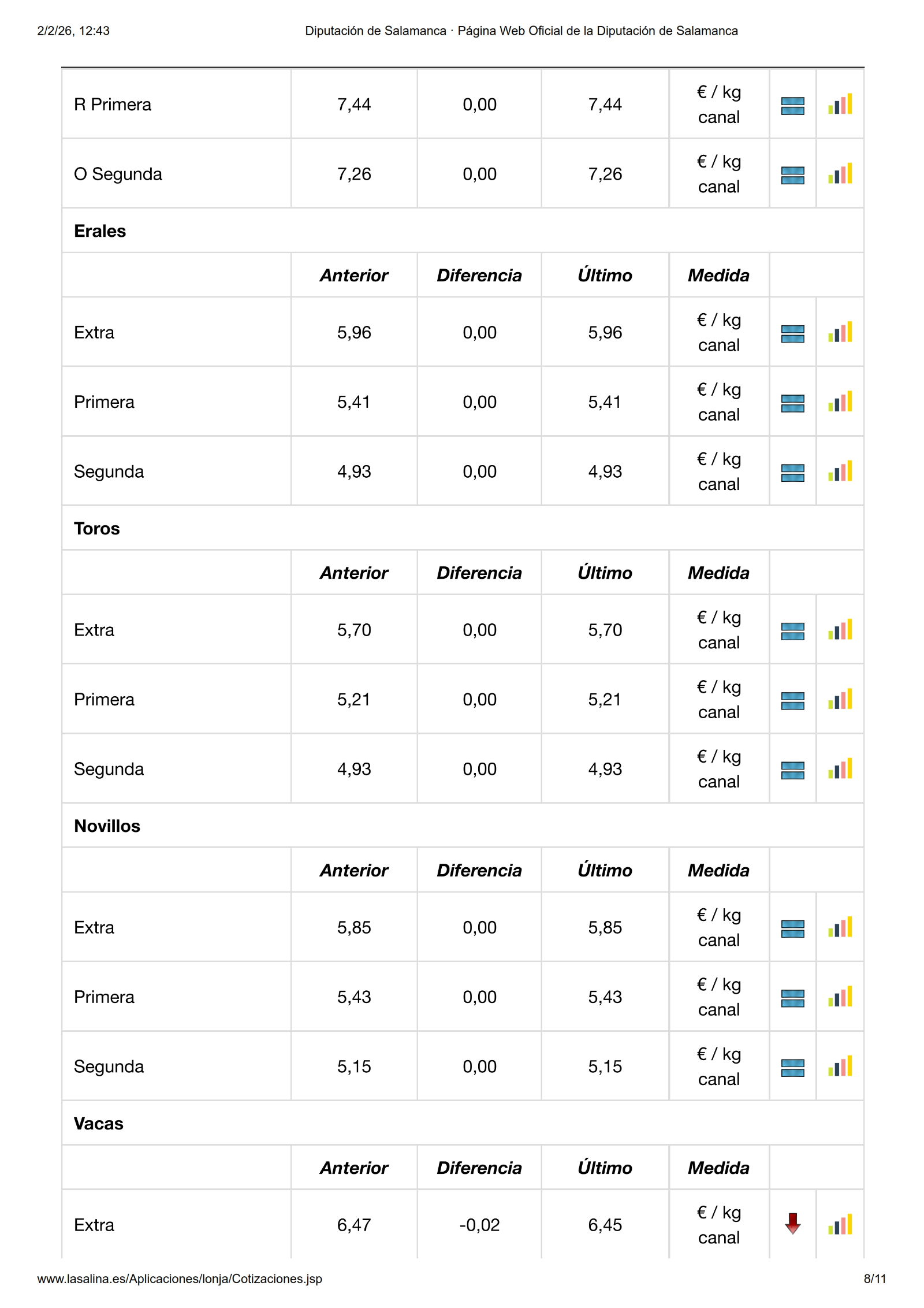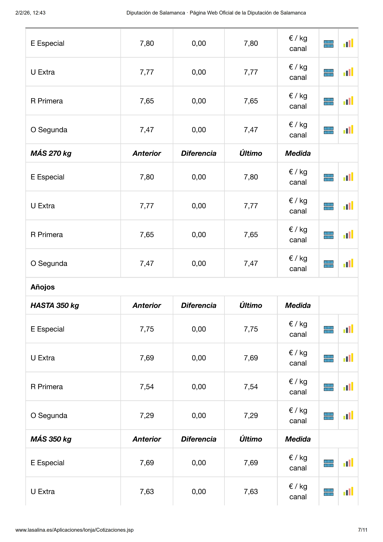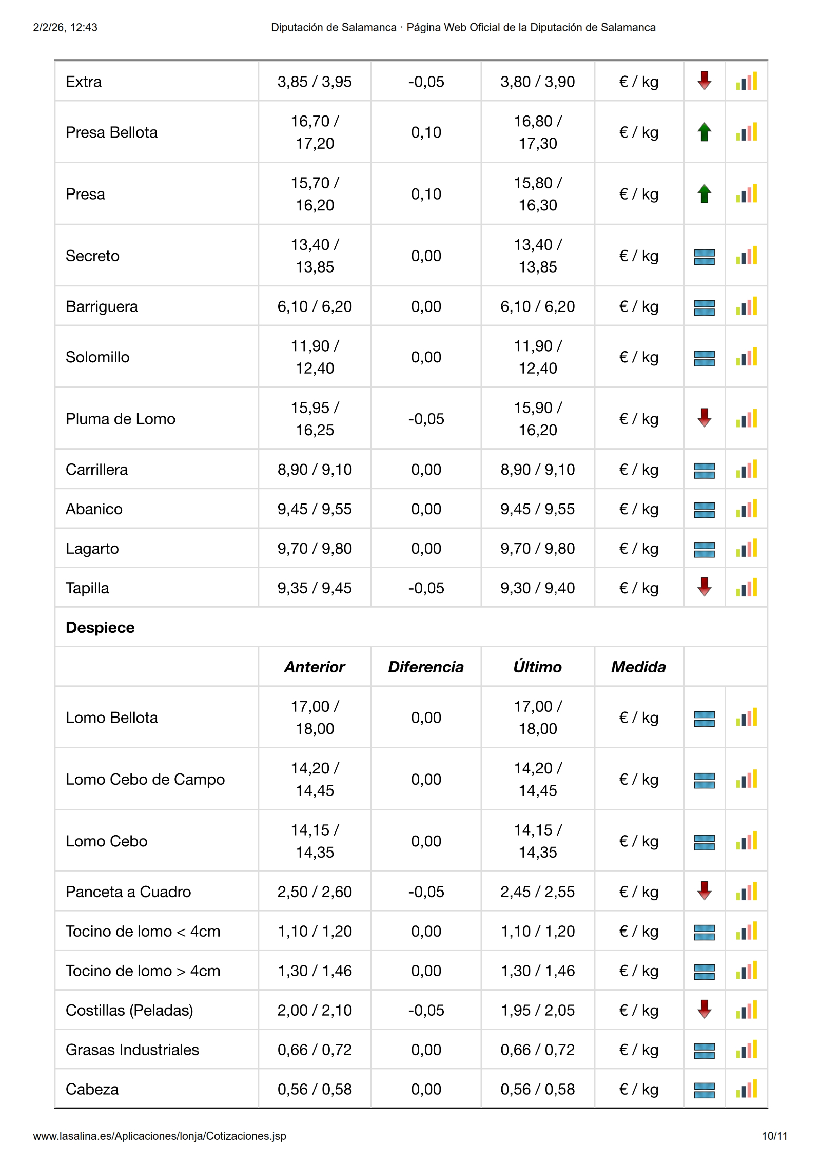Por último, en la Mesa de Despiece de Ibérico, el precio de la presa sube 0,10 €/kg, sin embargo el magro extra, pluma de lomo, tapilla, panceta a cuadro y costillas peladas bajan -0,05 €/kg.
